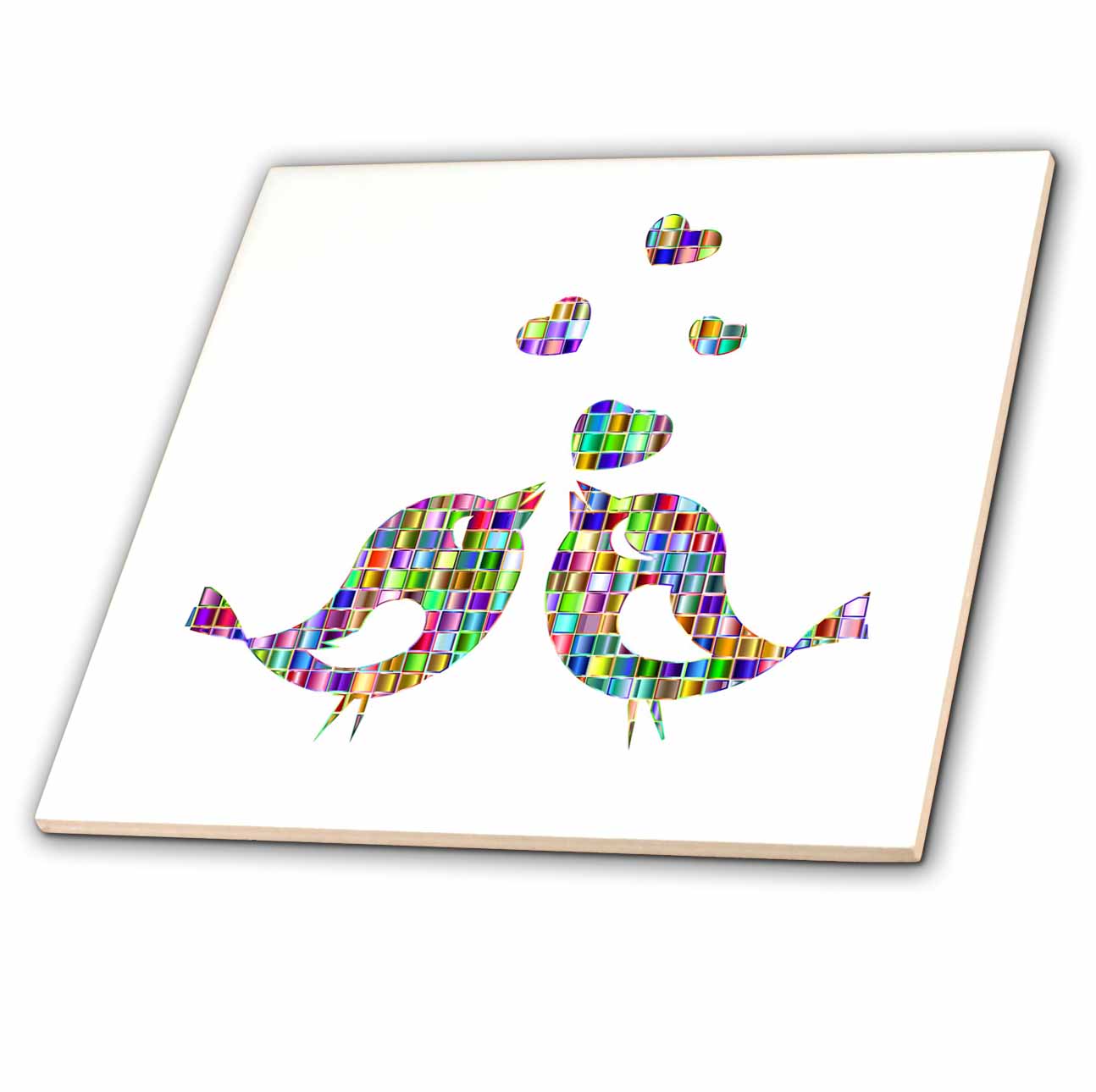 Image of Metallic Love Birds With Hearts Tile is great for a backsplash, countertop or as an accent. This commercial quality construction grade tile has a high gloss finish. The image is applied to the top surface and can be cleaned with a mild detergent.