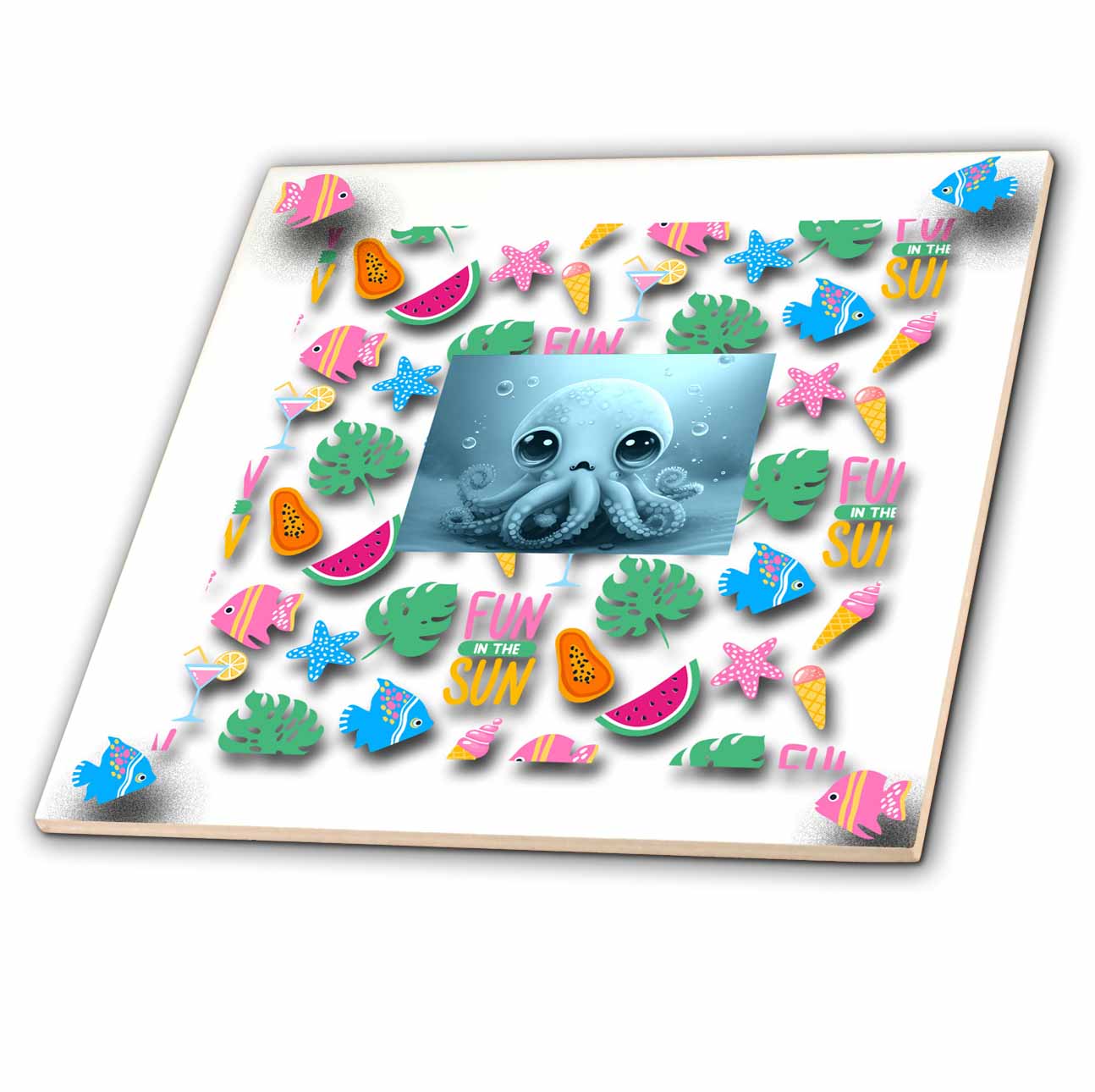 One hungry Octopus surrounded by edible goodies Tile is great for a backsplash, countertop or as an accent. This commercial quality construction grade tile has a high gloss finish. The image is applied to the top surface and can be cleaned with a mild detergent.