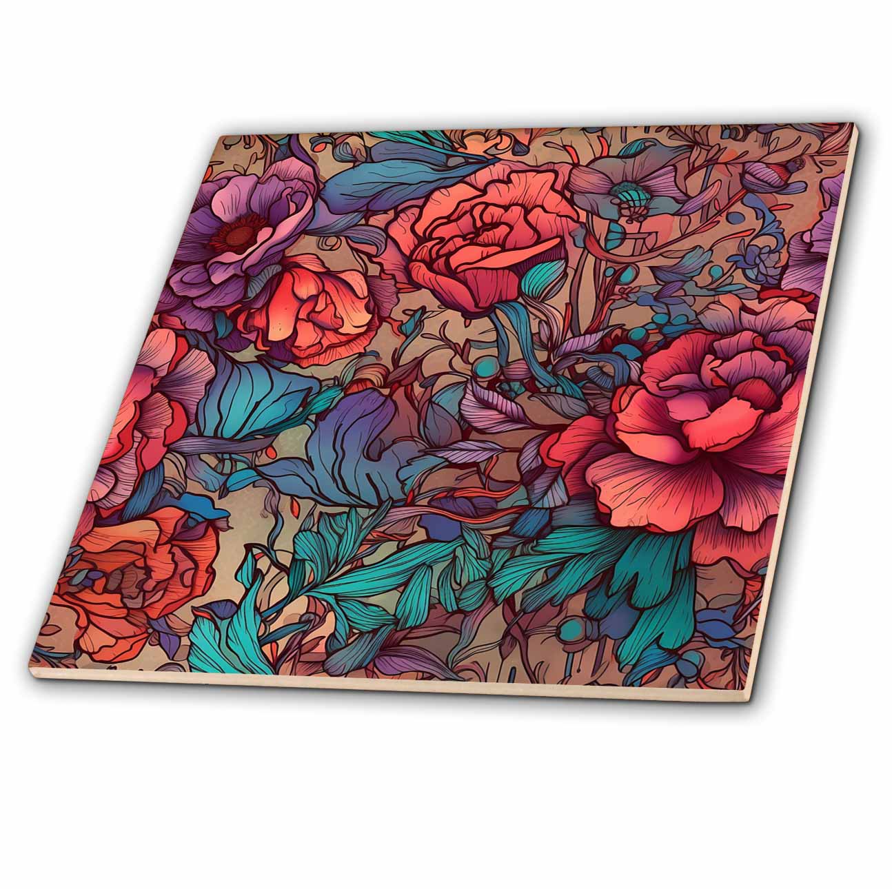 3dRose Pretty Red, Blue, and Purple Baroque Floral Pattern - Tiles (ct-381698)
