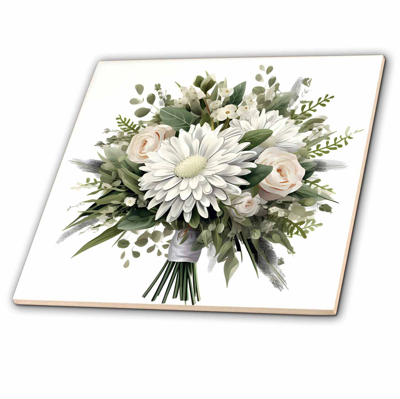 3dRose Pretty White Flowers and Greenery Bridal Bouquet Illustration - Tiles (ct-383259)