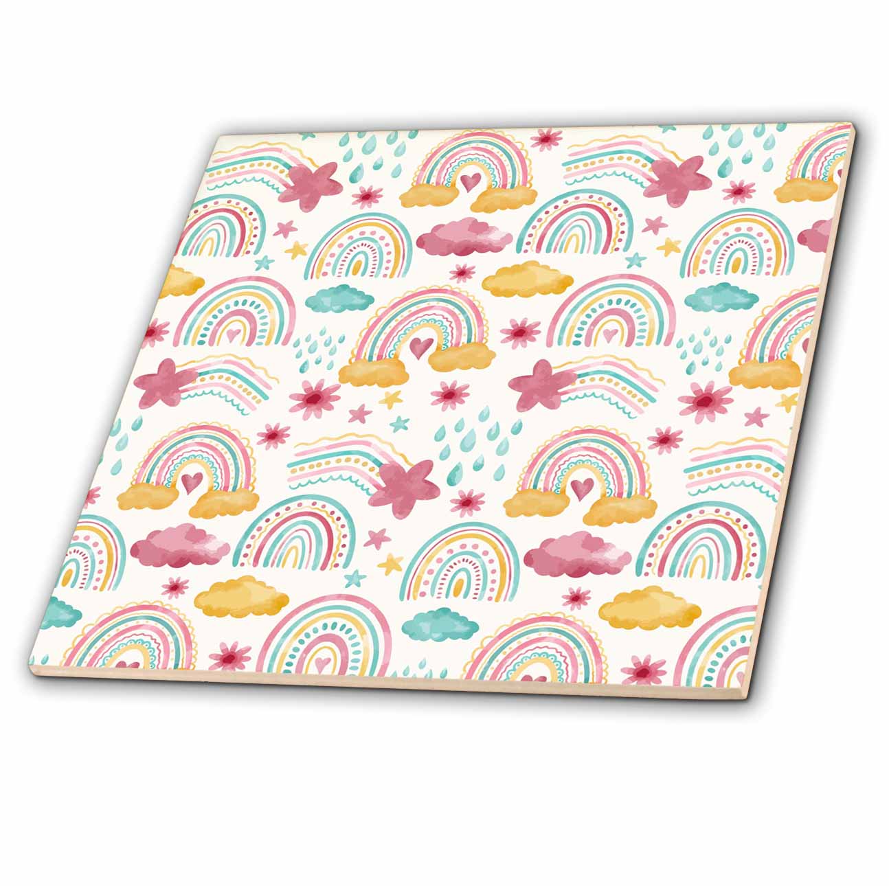 3dRose Rainbows, Clouds, Stars, Raindrops, Pink, Aqua, Yellow, Cute, Pattern - Tiles (ct-376222)