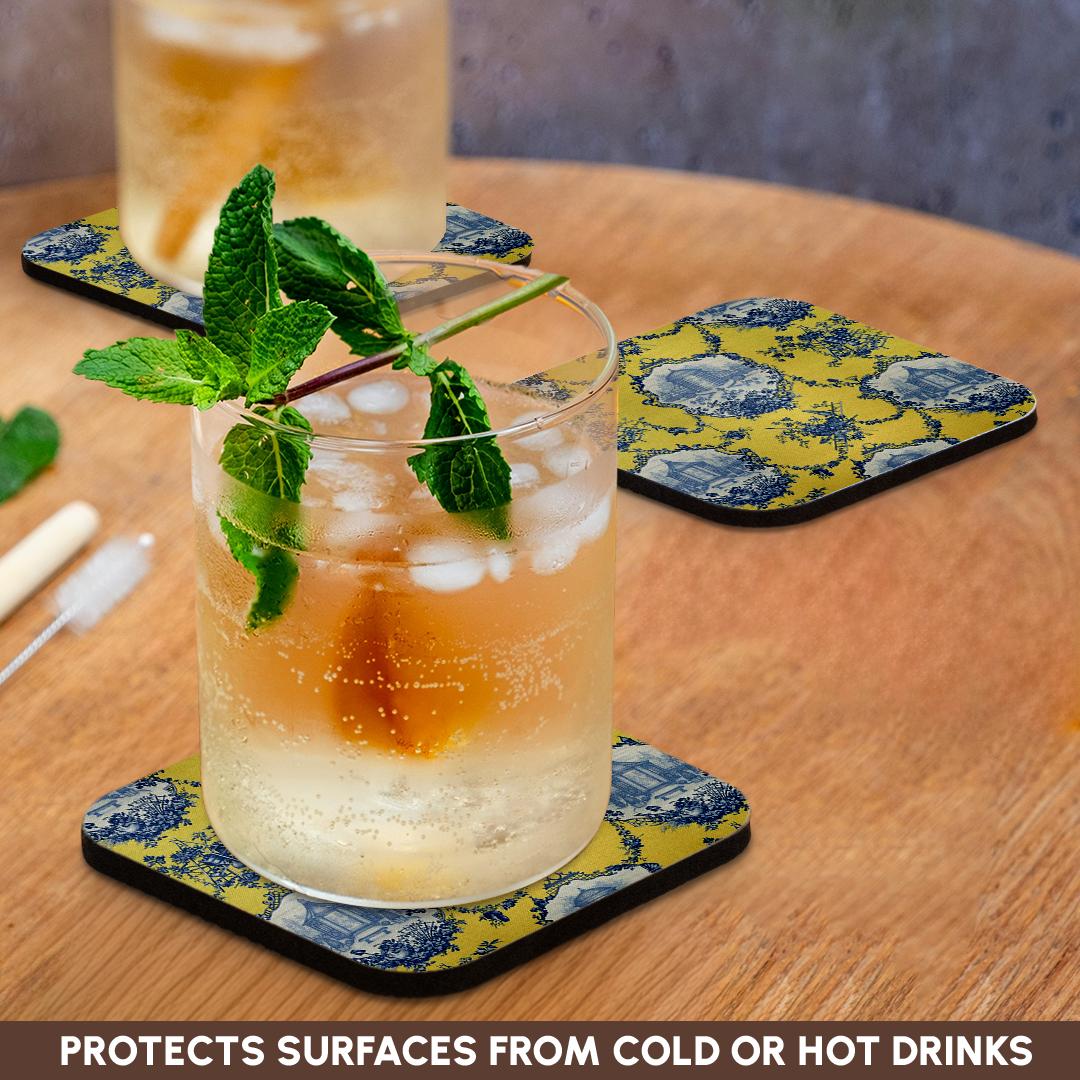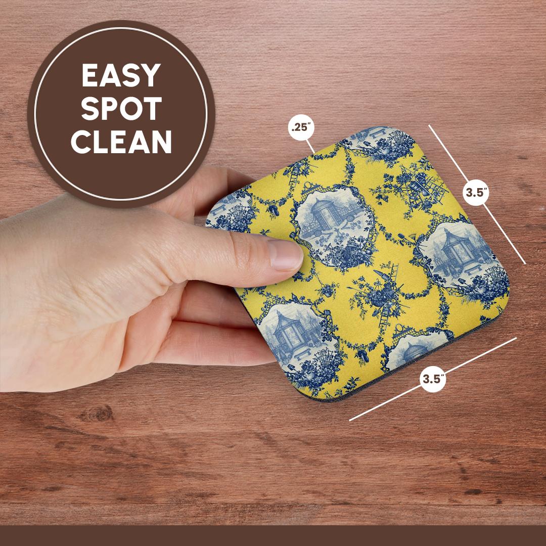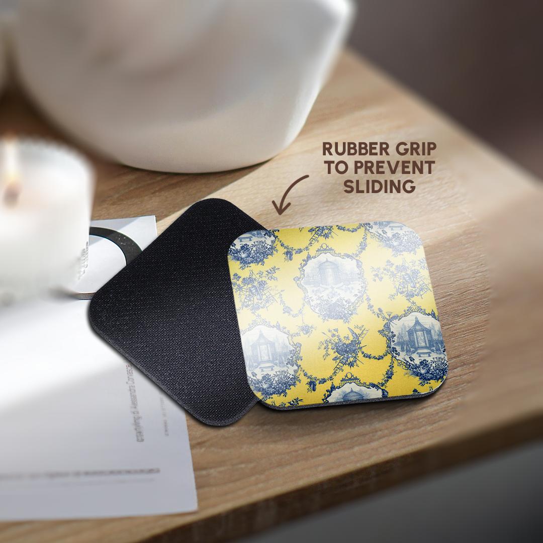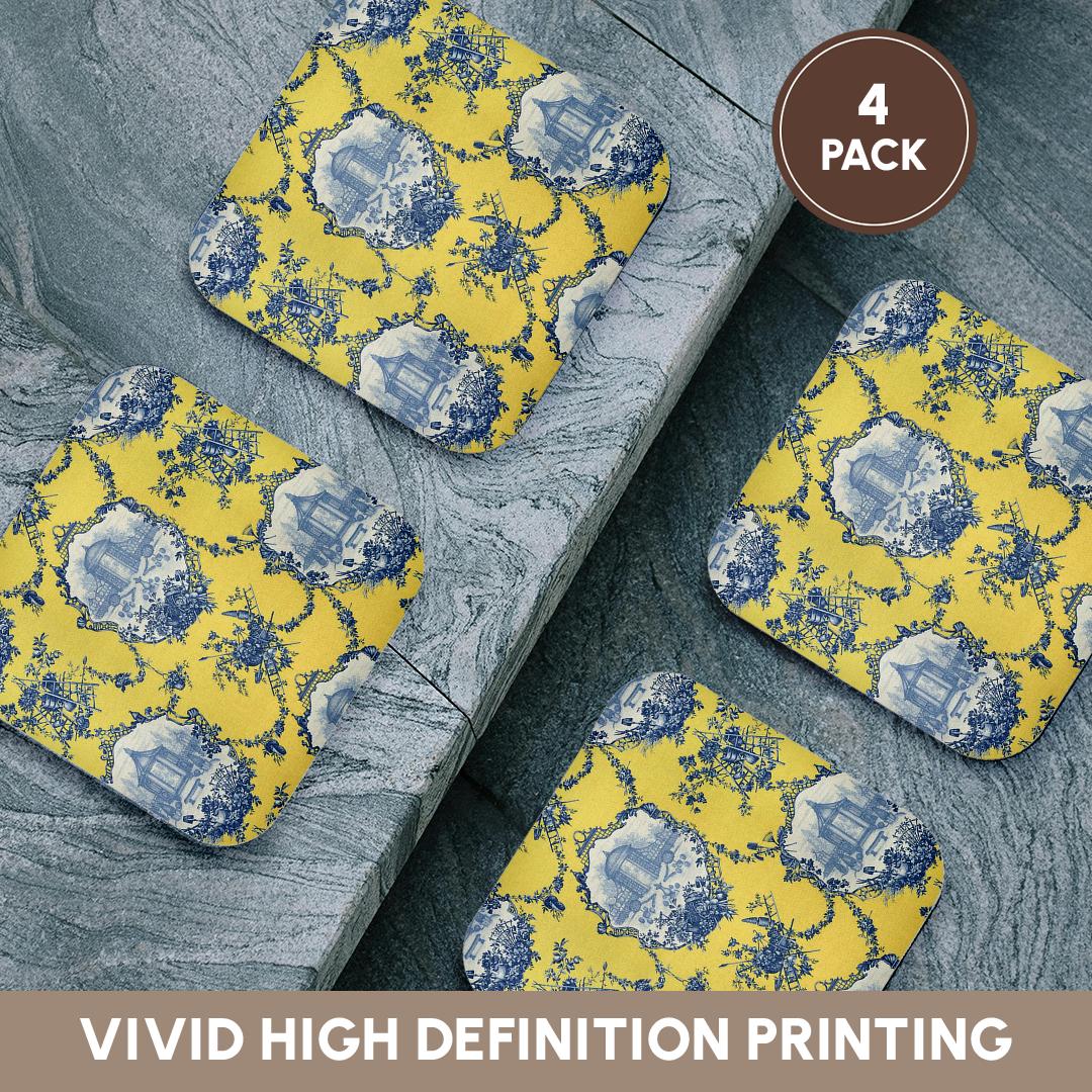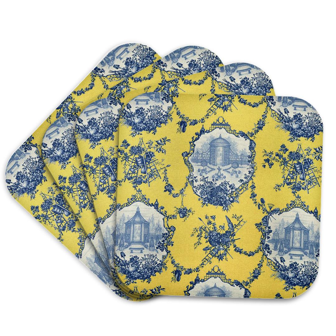 3dRose RinaPiro - French Toile - Garden French Toile. Yellow and Blue. Popular Toile Print. - Coasters (CST_218087)
