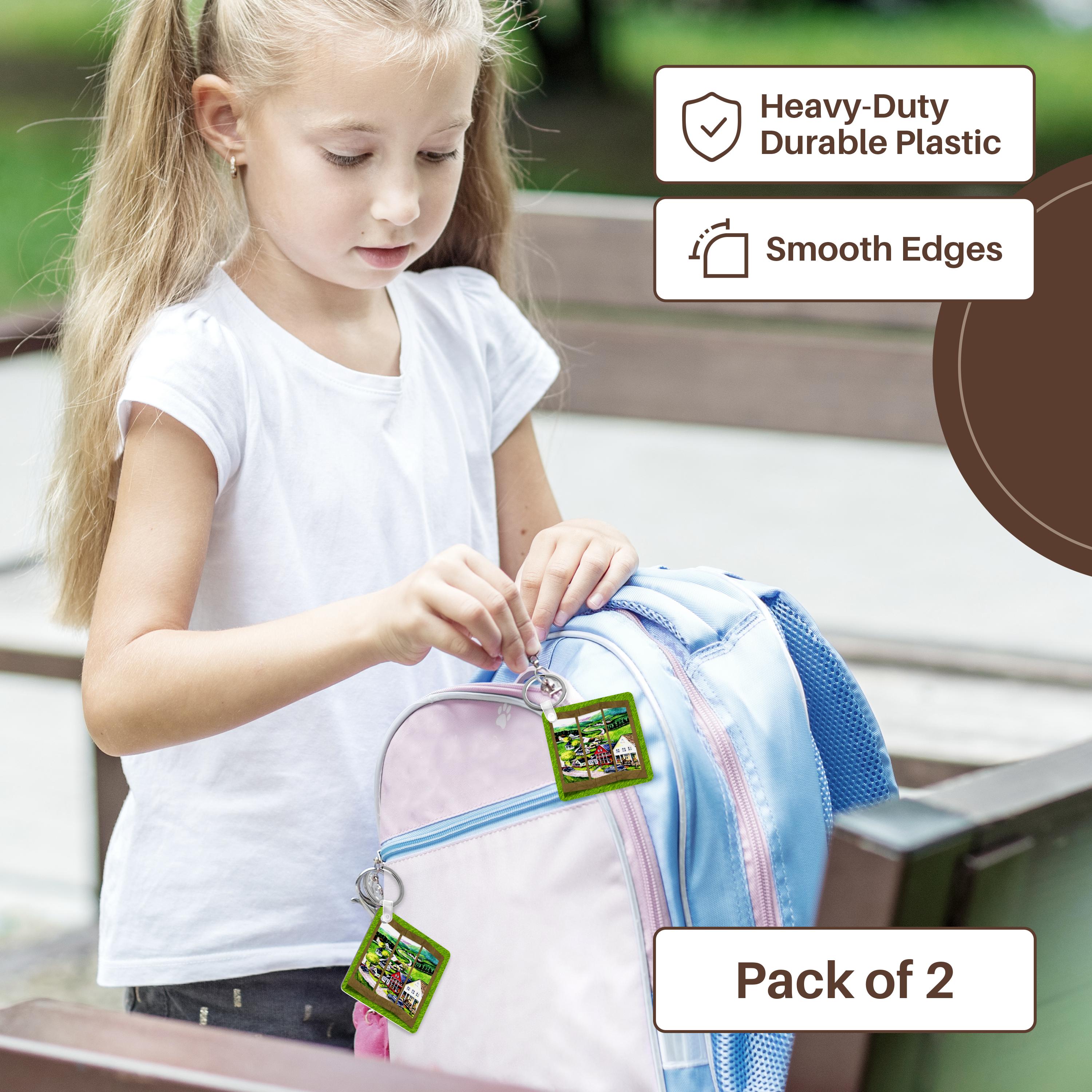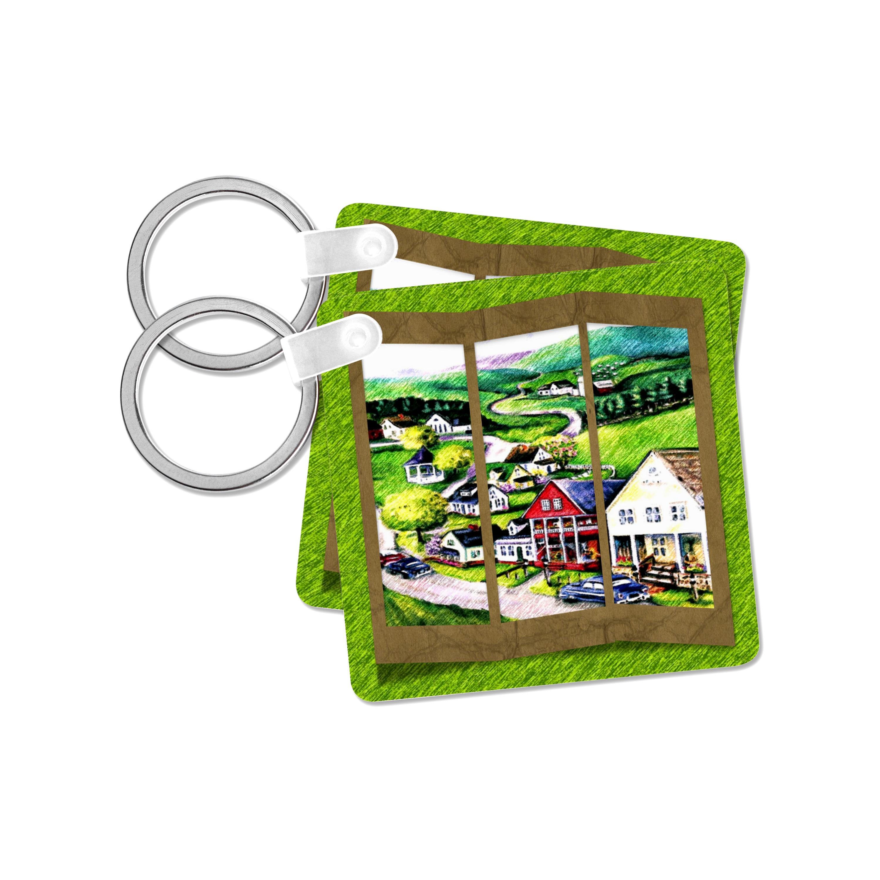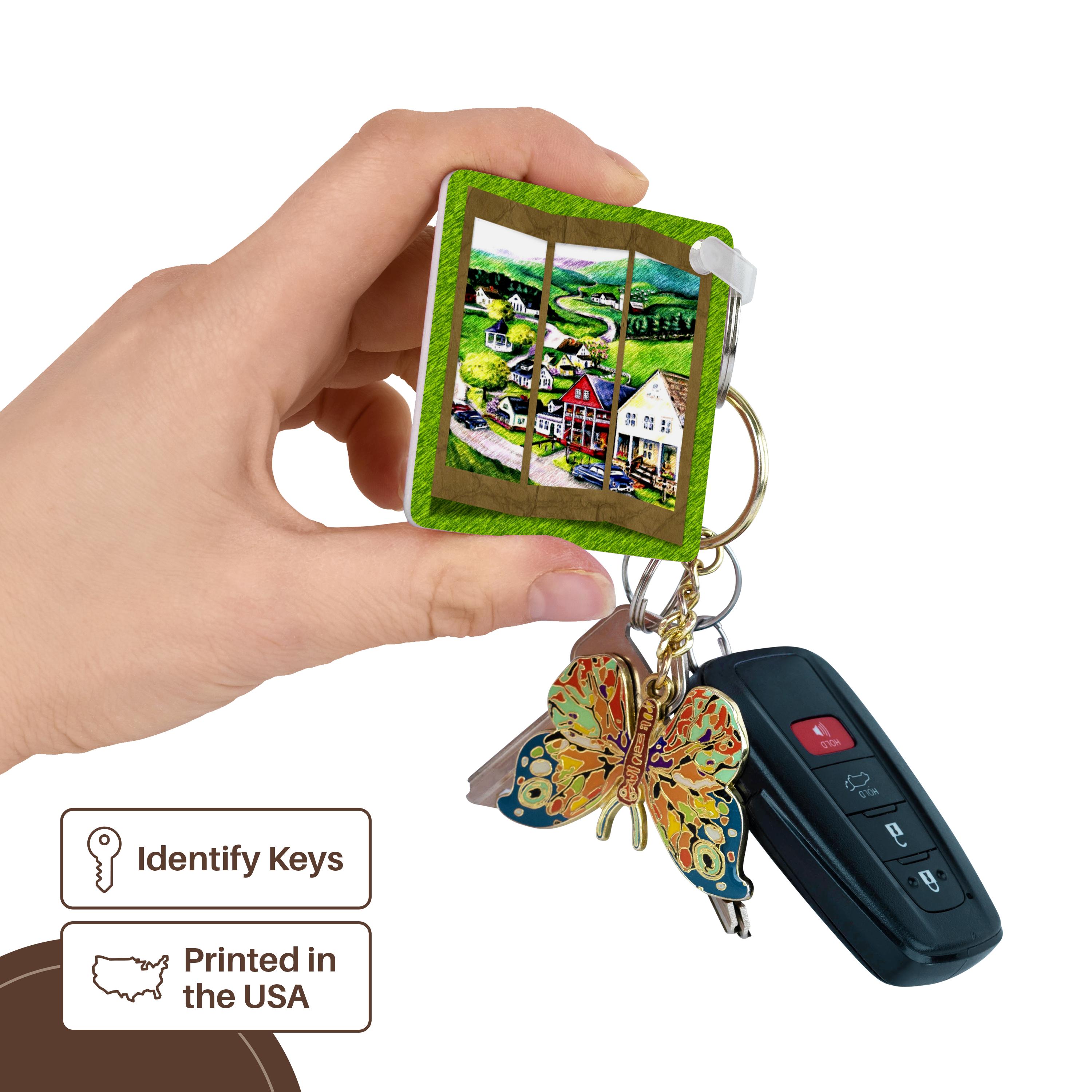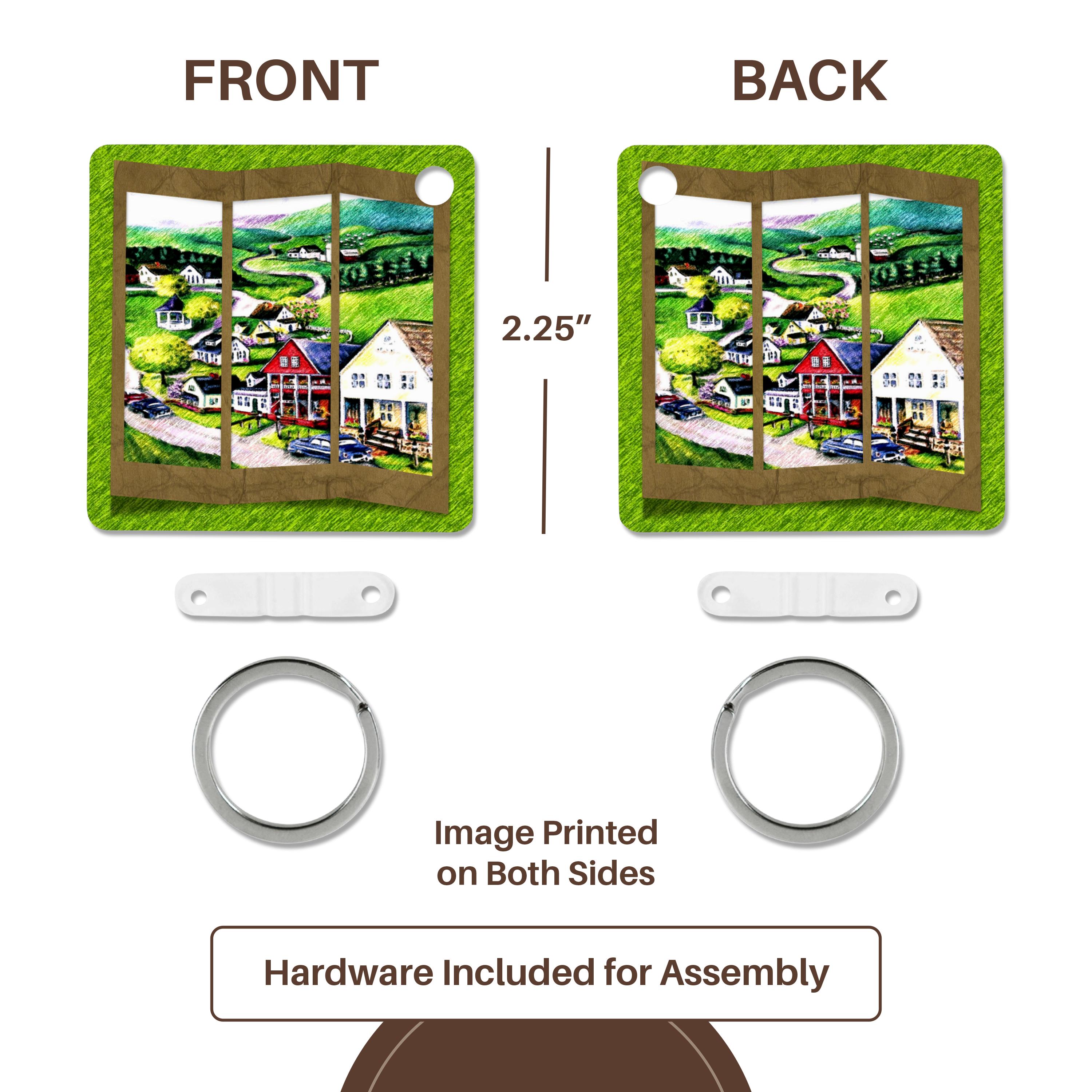 Country Road Sketch Key Chain is available in sets of 2, 4 and 6; making them perfect for sharing. Image is printed on both sides and has a high gloss finish. Measures 2 3/8" x 2 3/8" x 3/8" and are made of heavy duty durable plastic. Rings and plastic clips included.