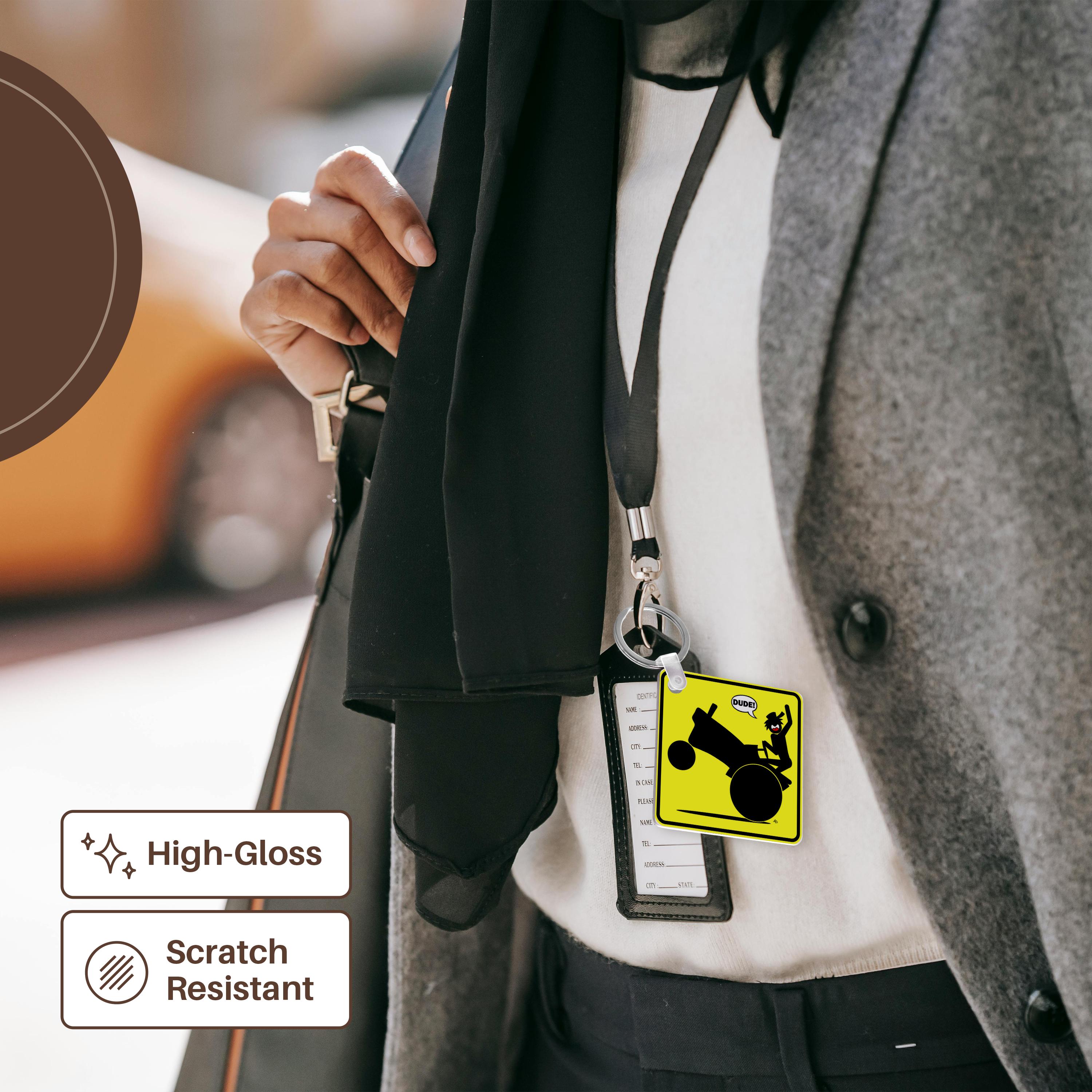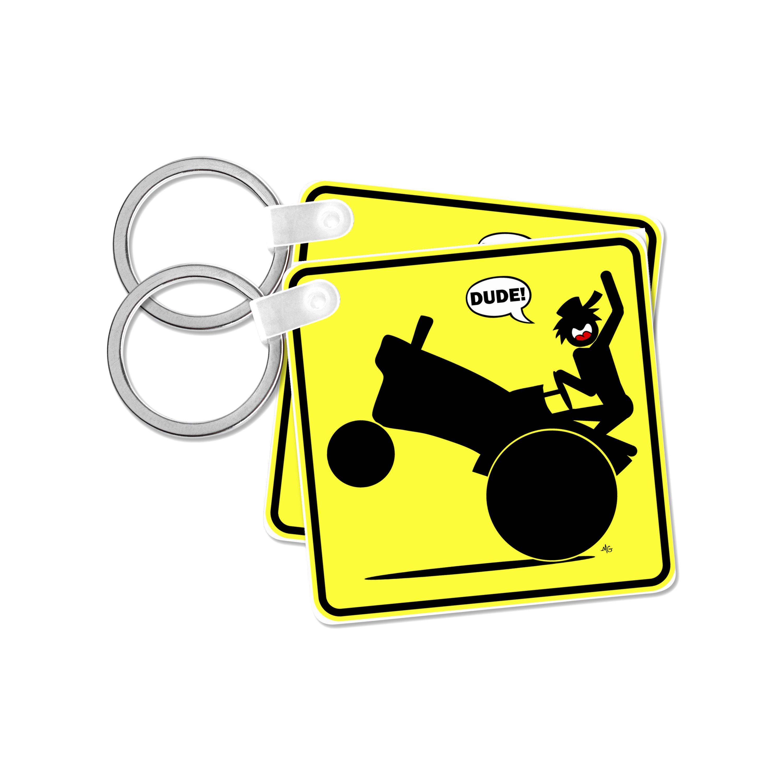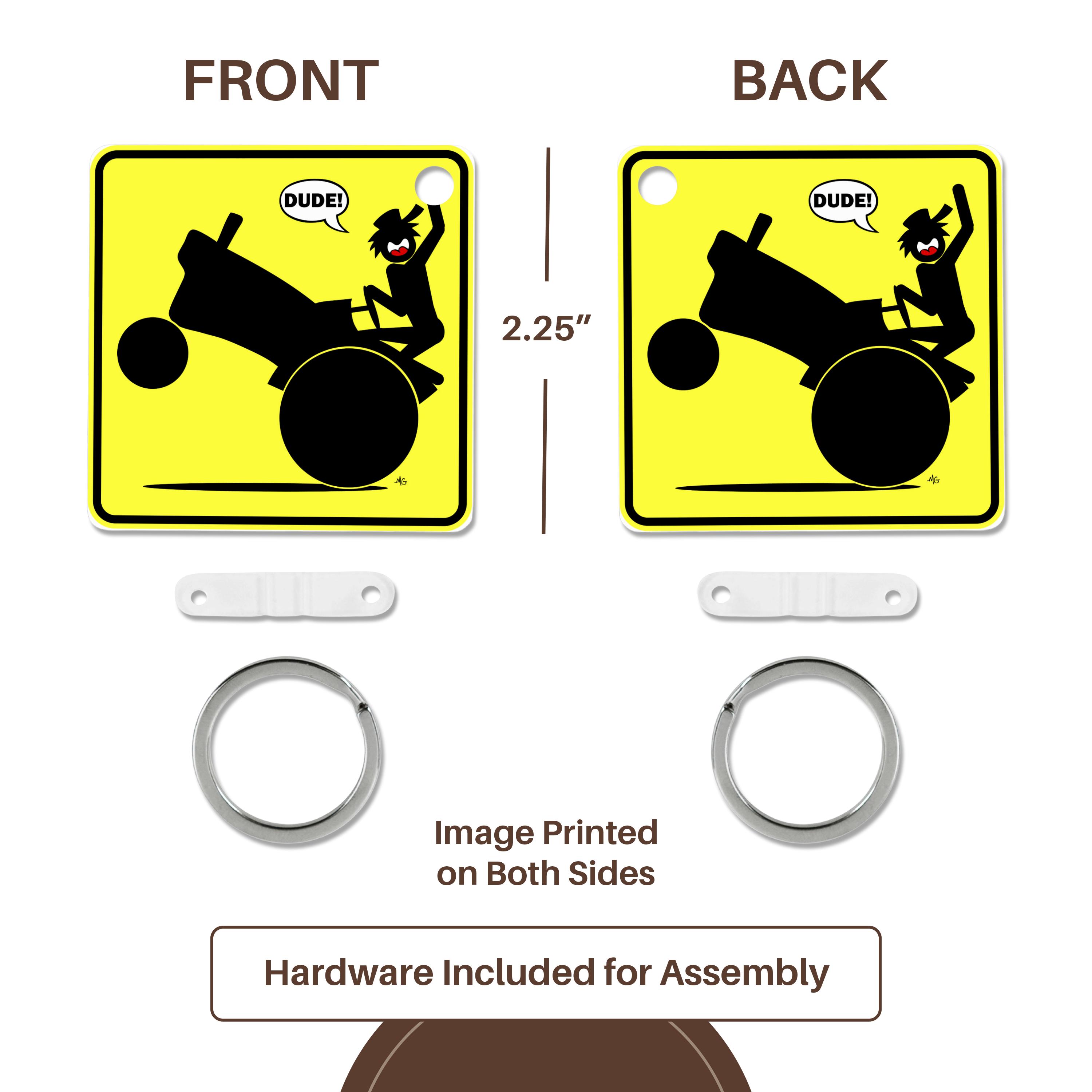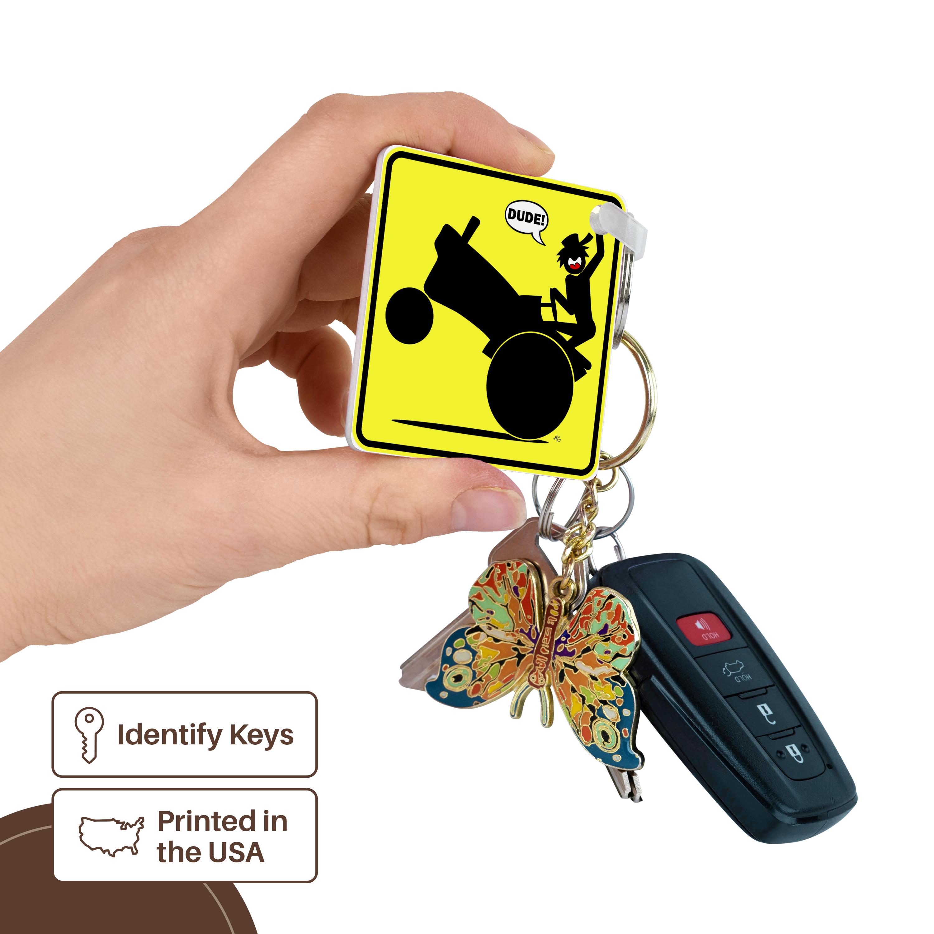 RURAL DUDE tractor wheelie yellow sign 2 Key Chain is available in sets of 2, 4 and 6; making them perfect for sharing. Image is printed on both sides and has a high gloss finish. Measures 2 3/8" x 2 3/8" x 3/8" and are made of heavy duty durable plastic. Rings and plastic clips included.