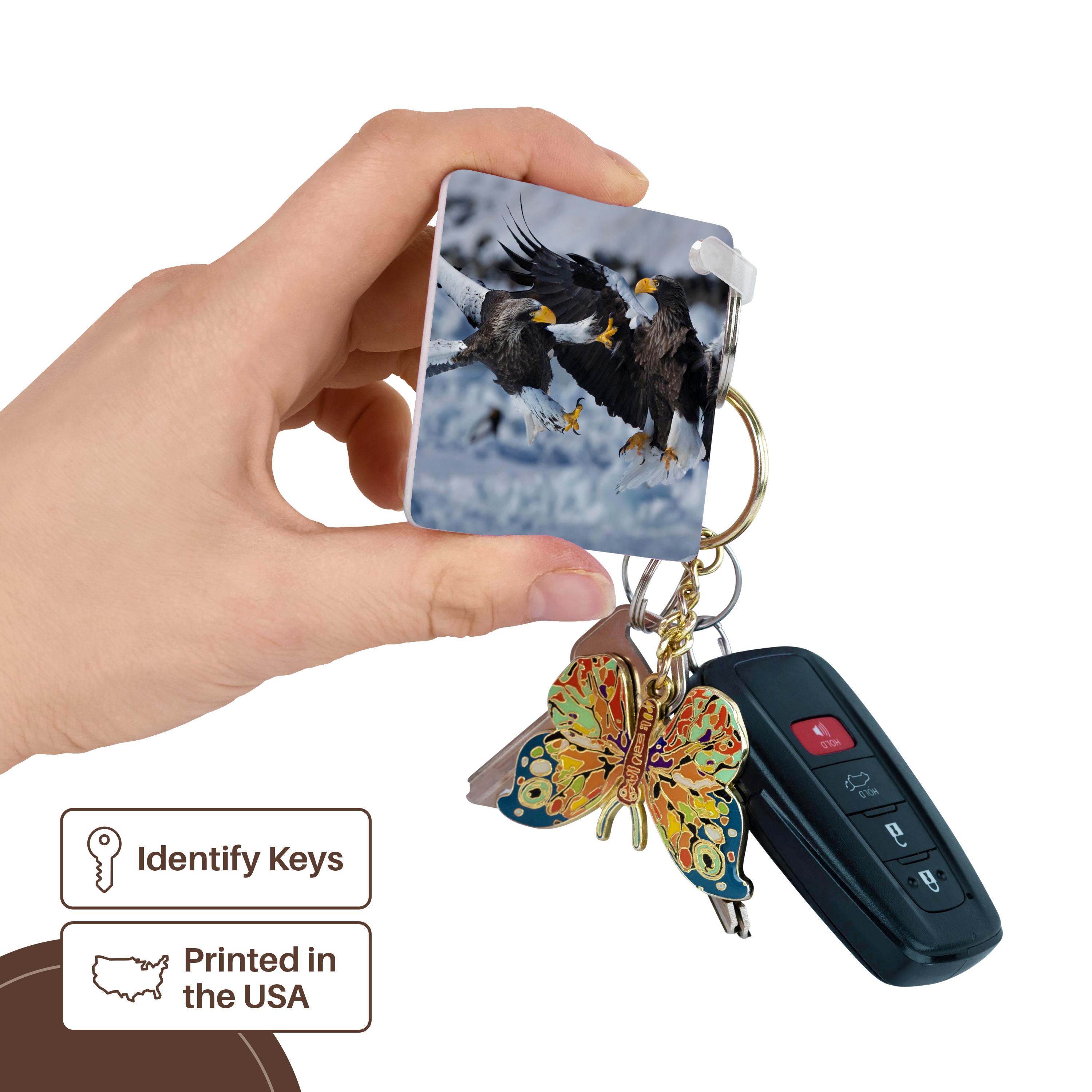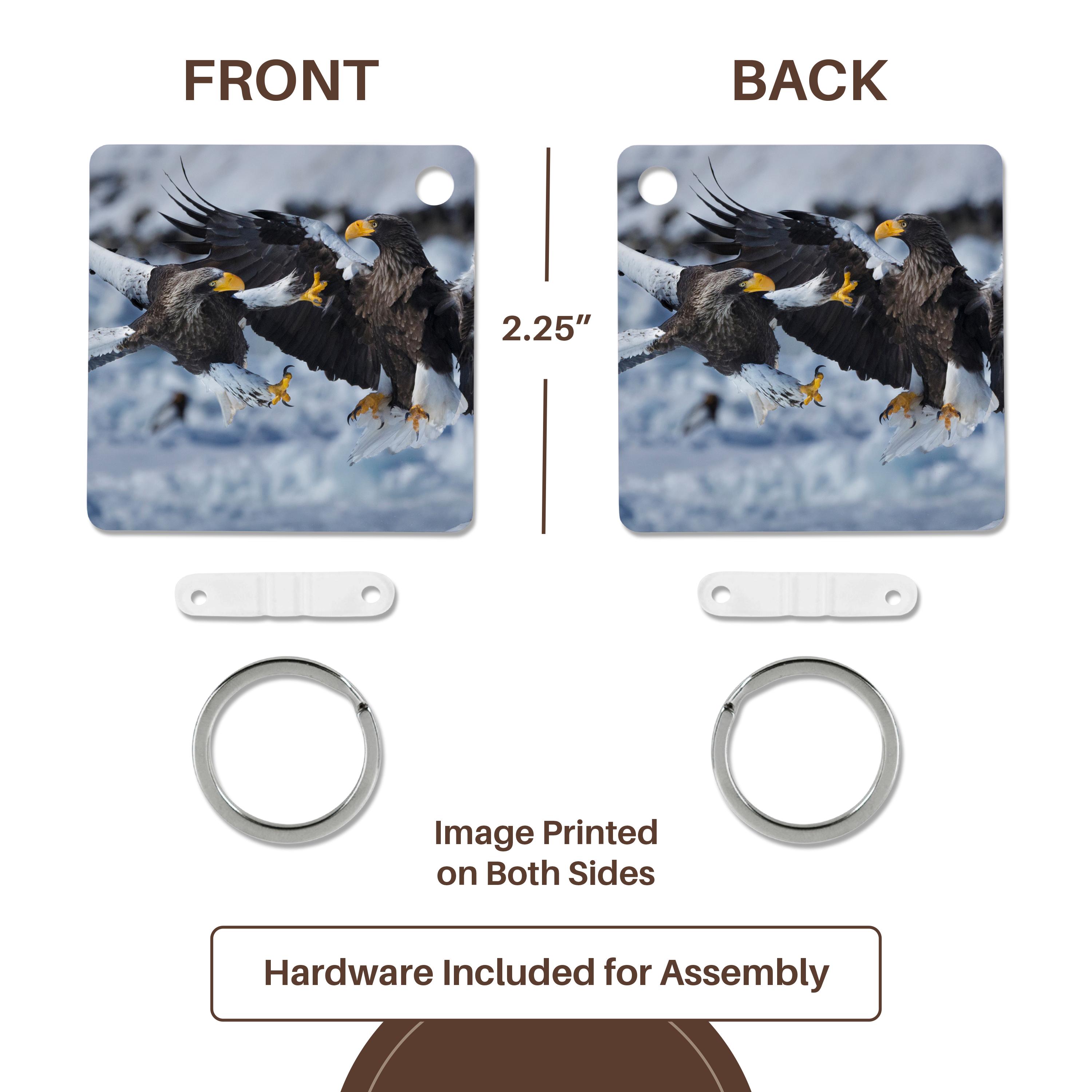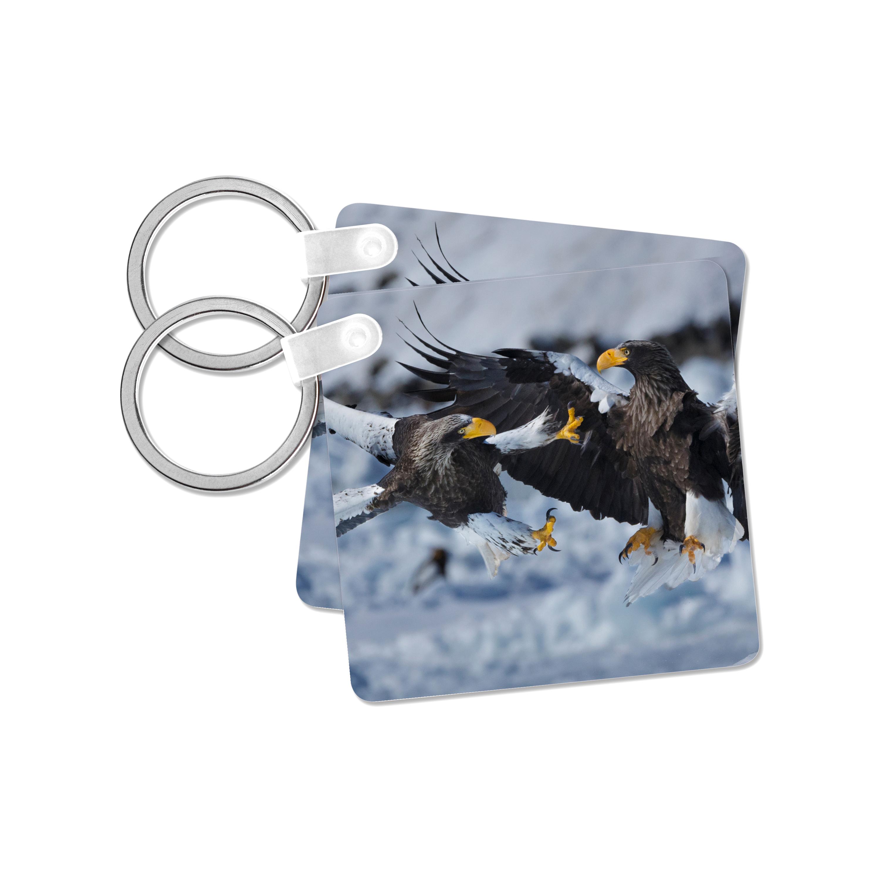 Stellers sea eagles, Hokkaido, Japan Key Chain is available in sets of 2, 4 and 6; making them perfect for sharing. Image is printed on both sides and has a high gloss finish. Measures 2 3/8" x 2 3/8" x 3/8" and are made of heavy duty durable plastic. Rings and plastic clips included.