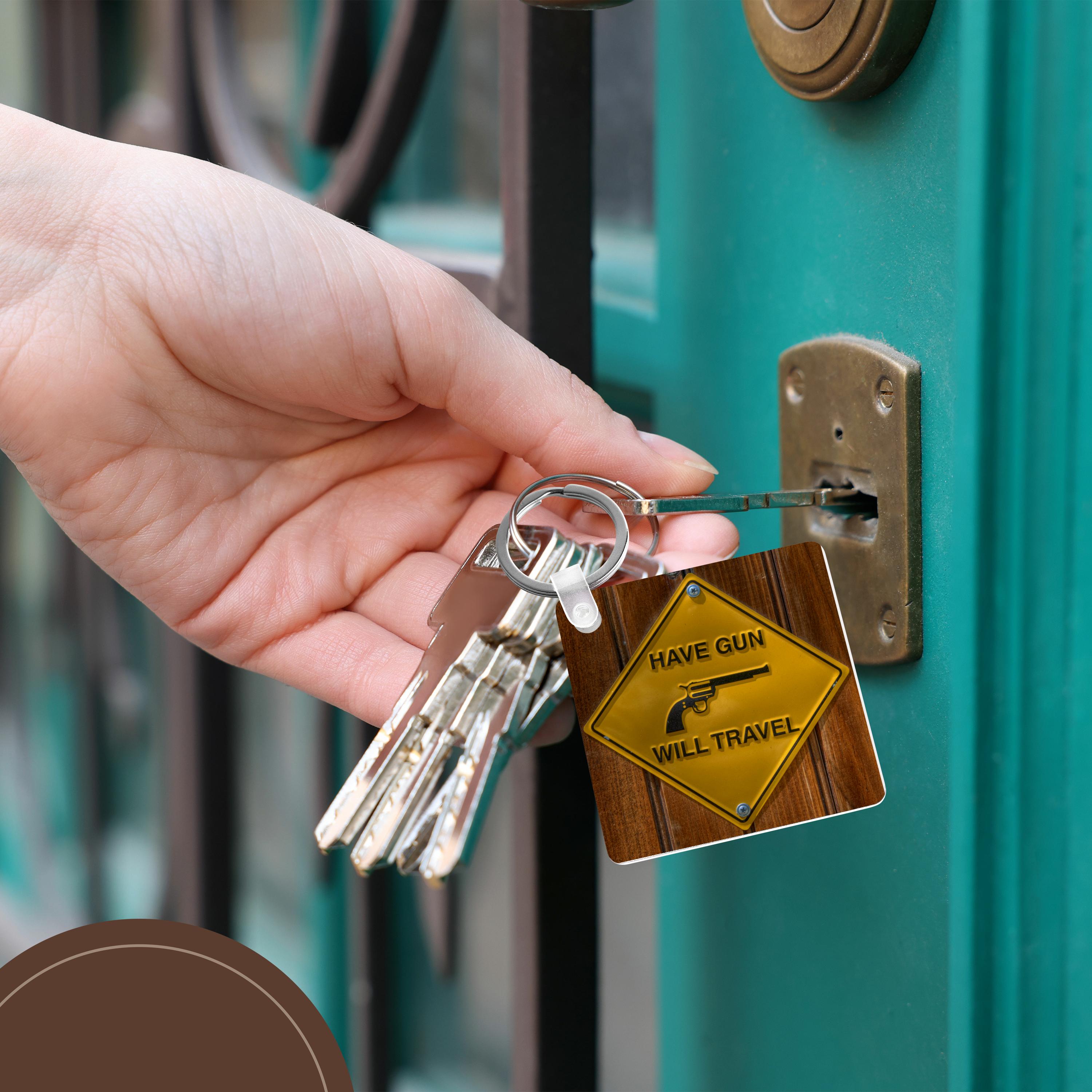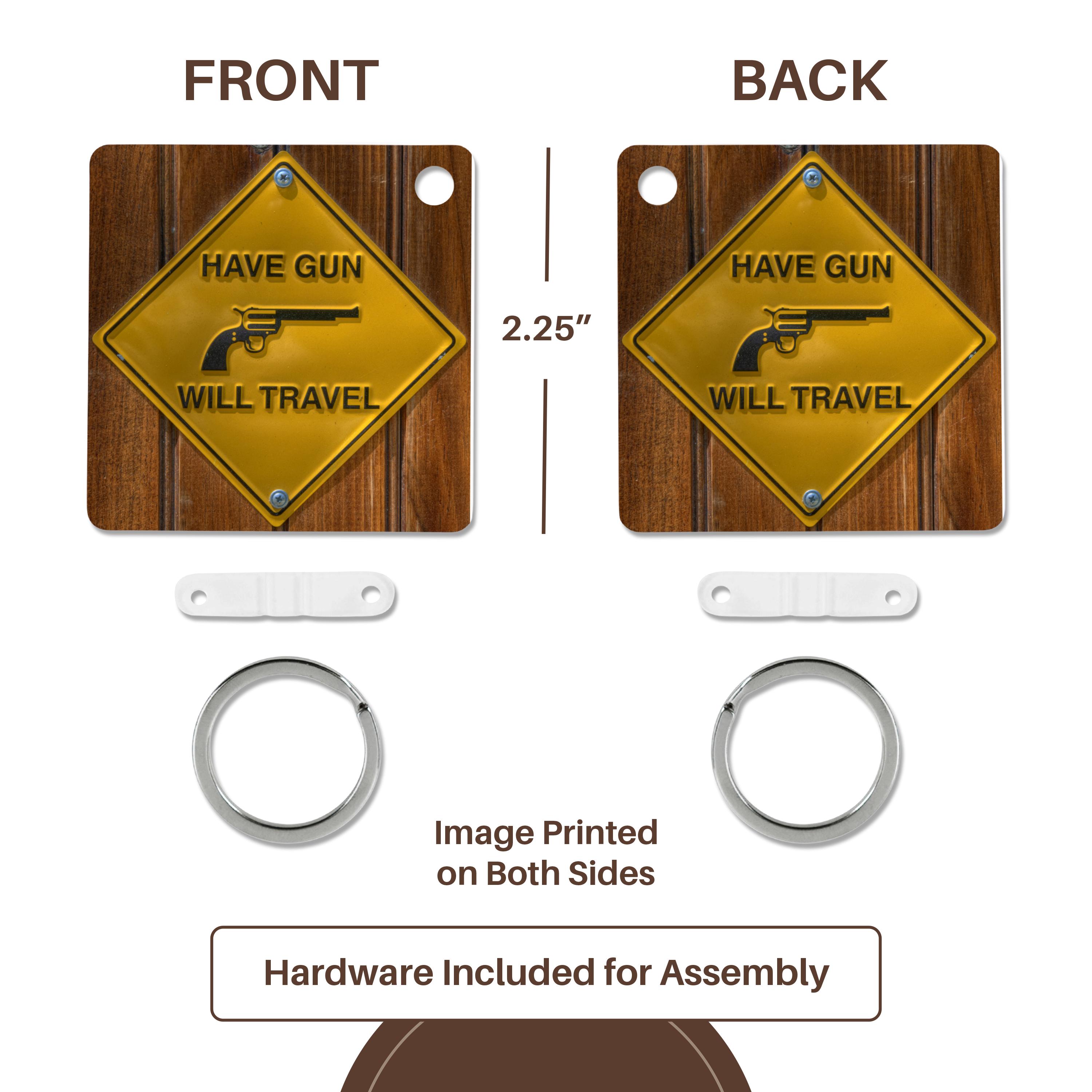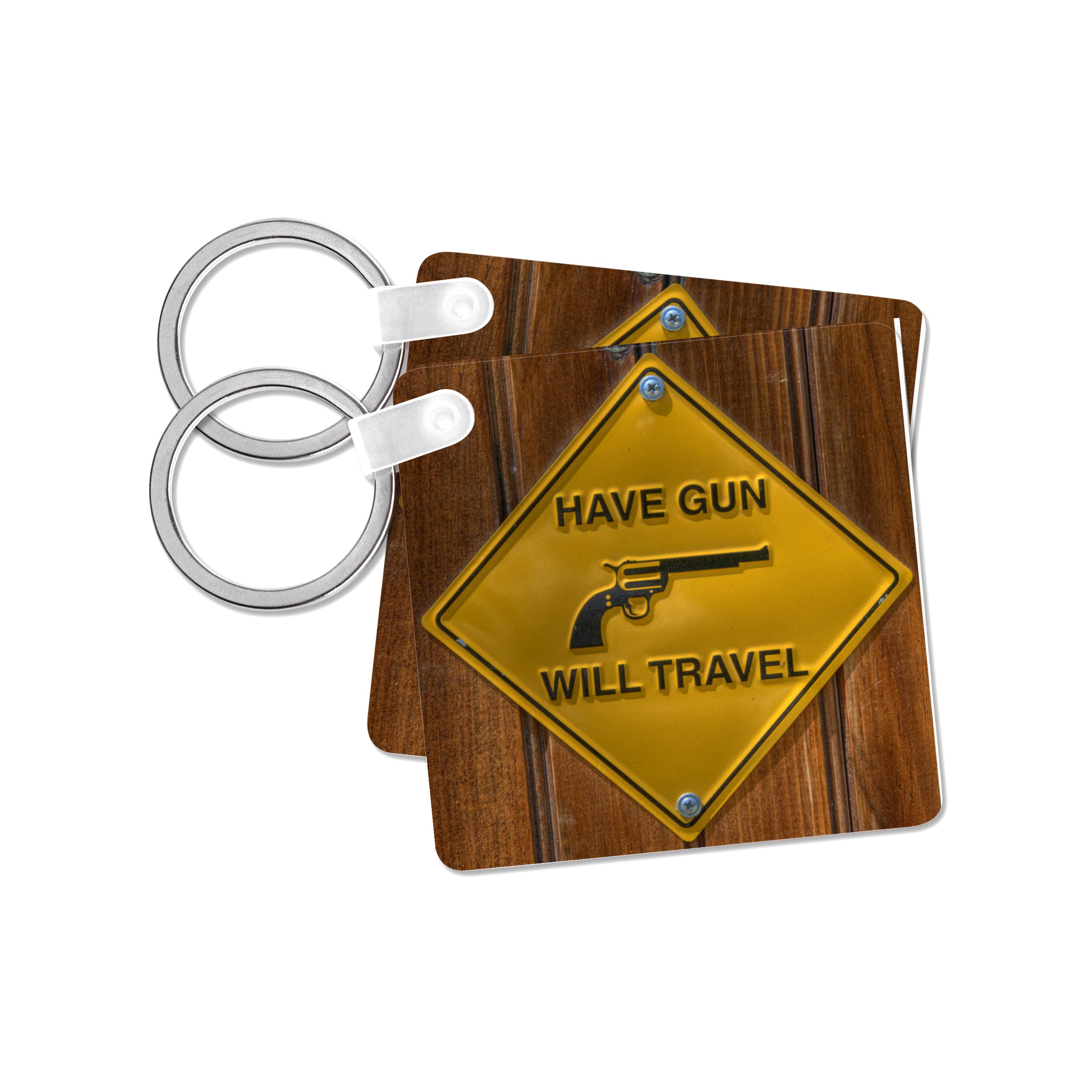 yellow sign, have gun will travel, Key Chain is available in sets of 2, 4 and 6; making them perfect for sharing. Image is printed on both sides and has a high gloss finish. Measures 2 3/8" x 2 3/8" x 3/8" and are made of heavy duty durable plastic. Rings and plastic clips included.