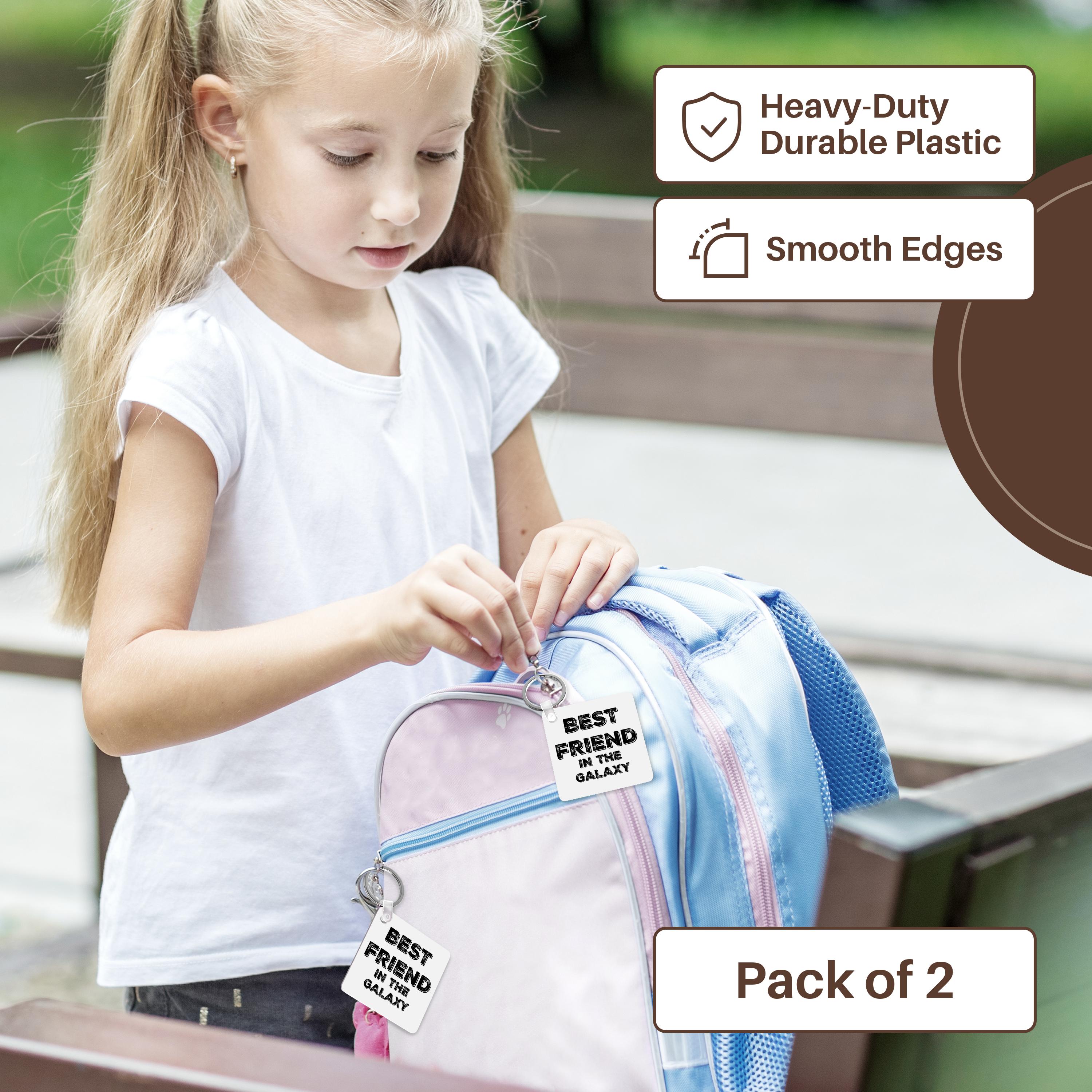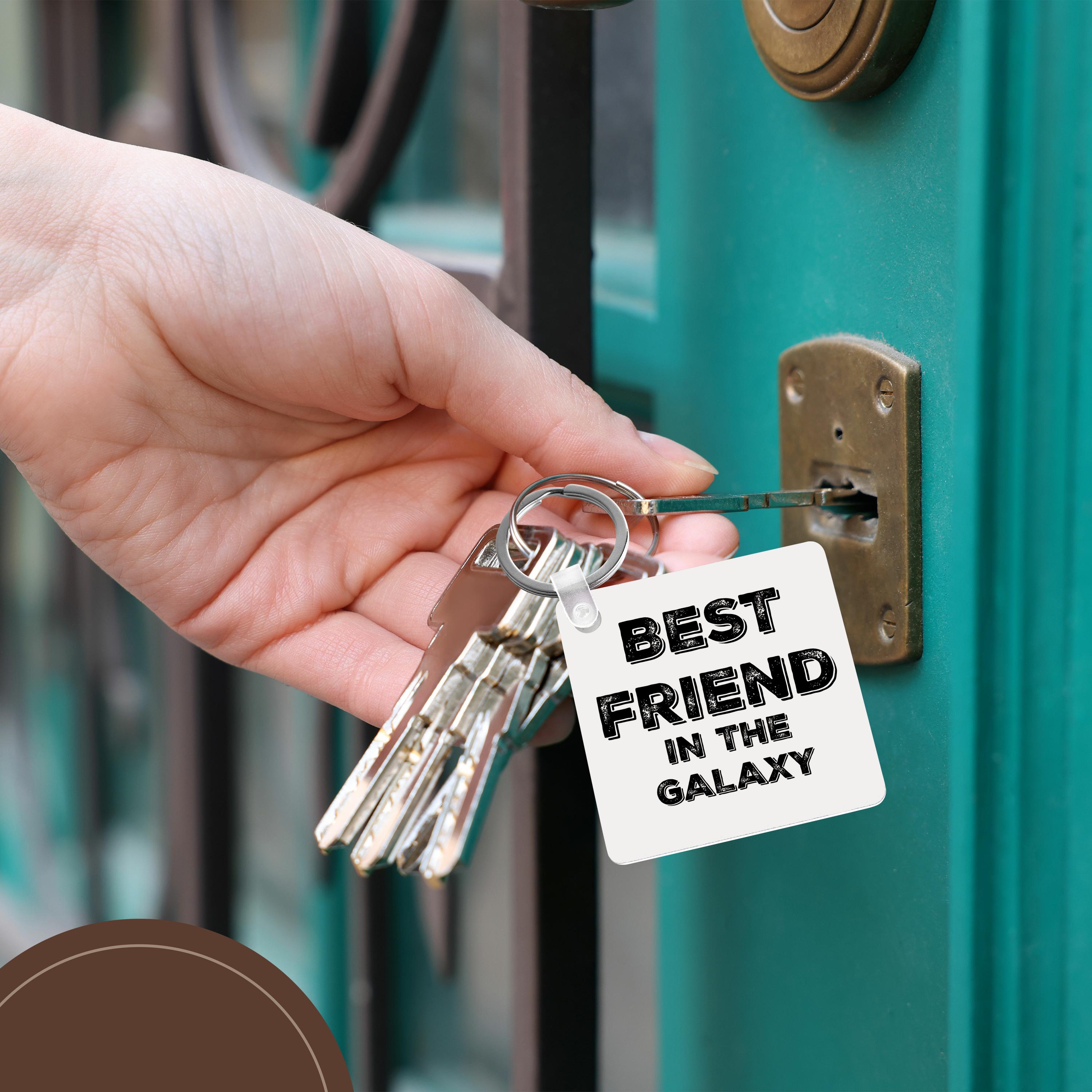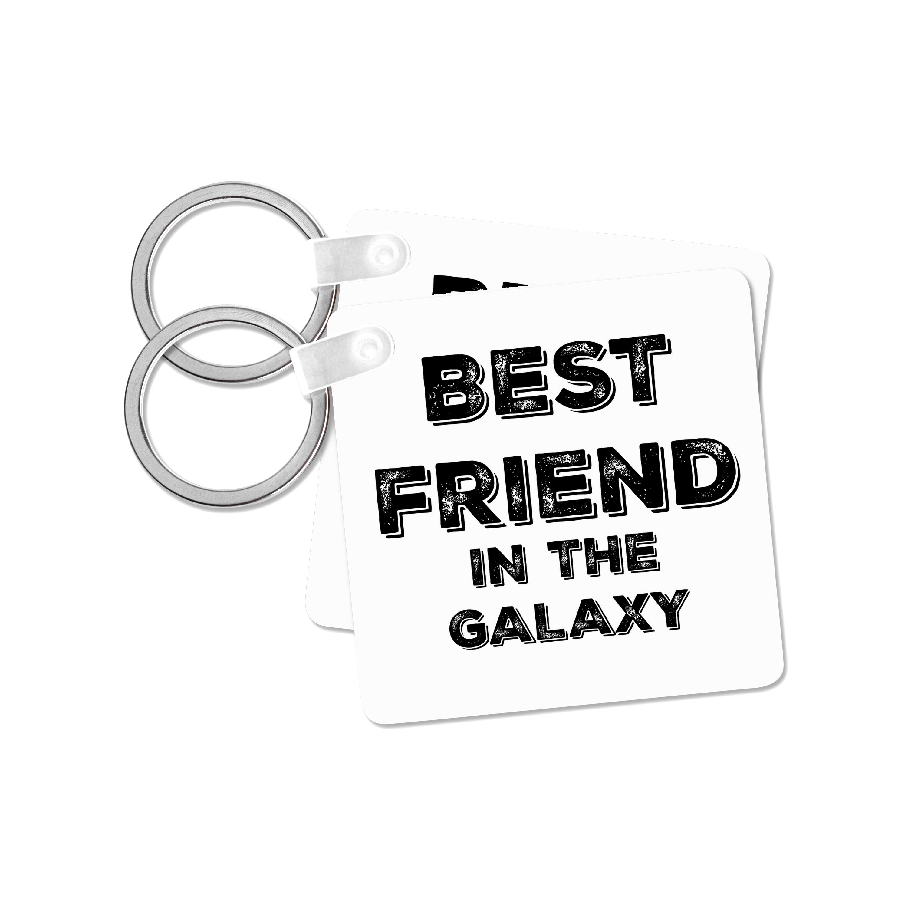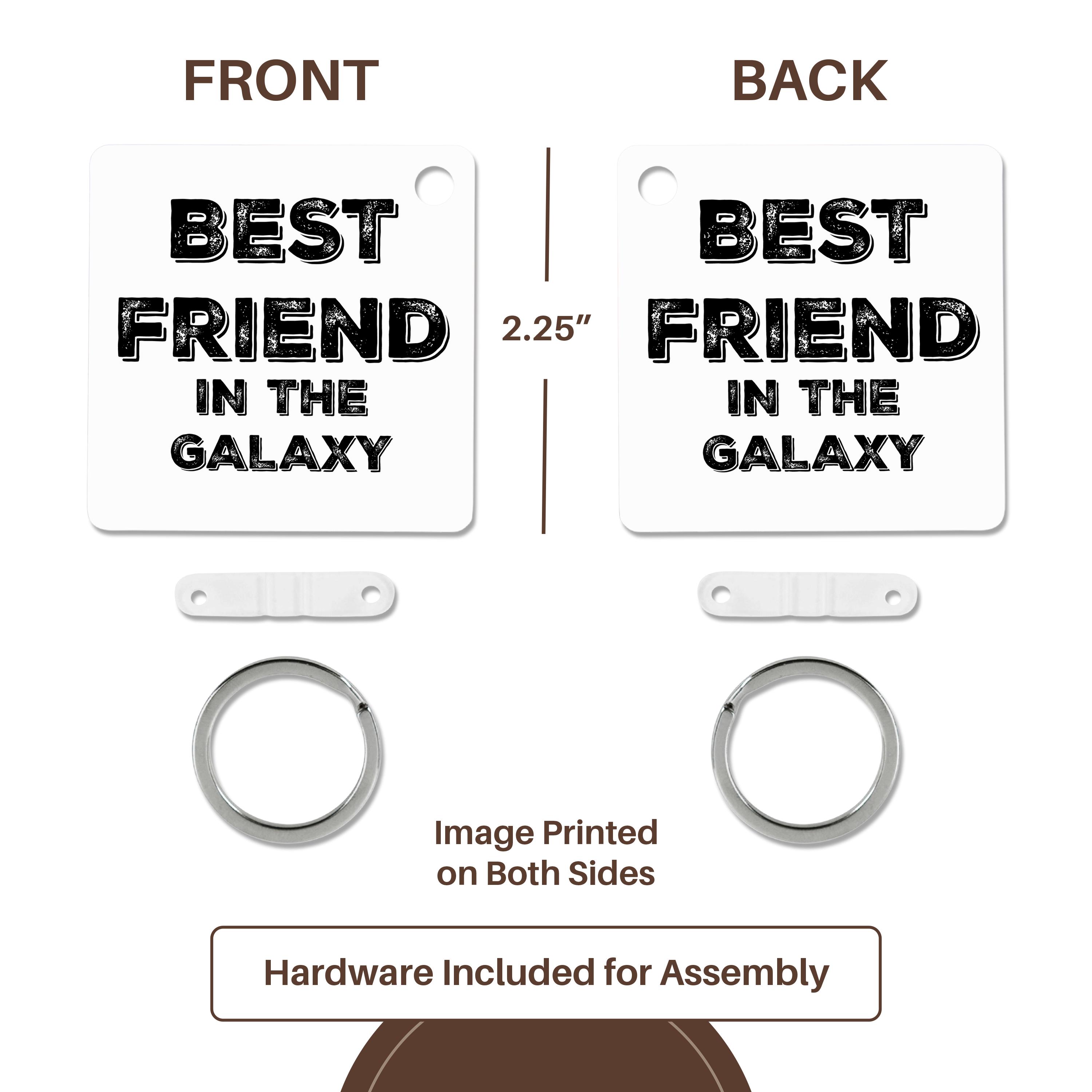Best Friend in the Galaxy Key Chain is available in sets of 2, 4 and 6; making them perfect for sharing. Image is printed on both sides and has a high gloss finish. Measures 2 3/8" x 2 3/8" x 3/8" and are made of heavy duty durable plastic. Rings and plastic clips included.