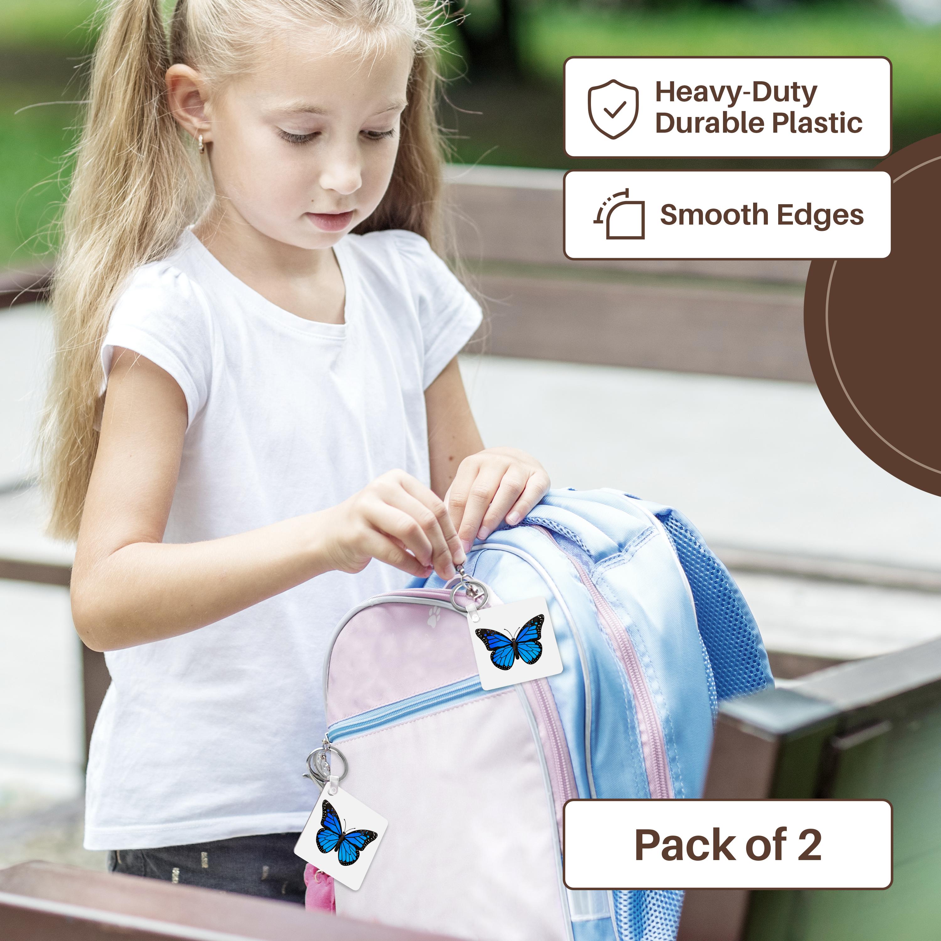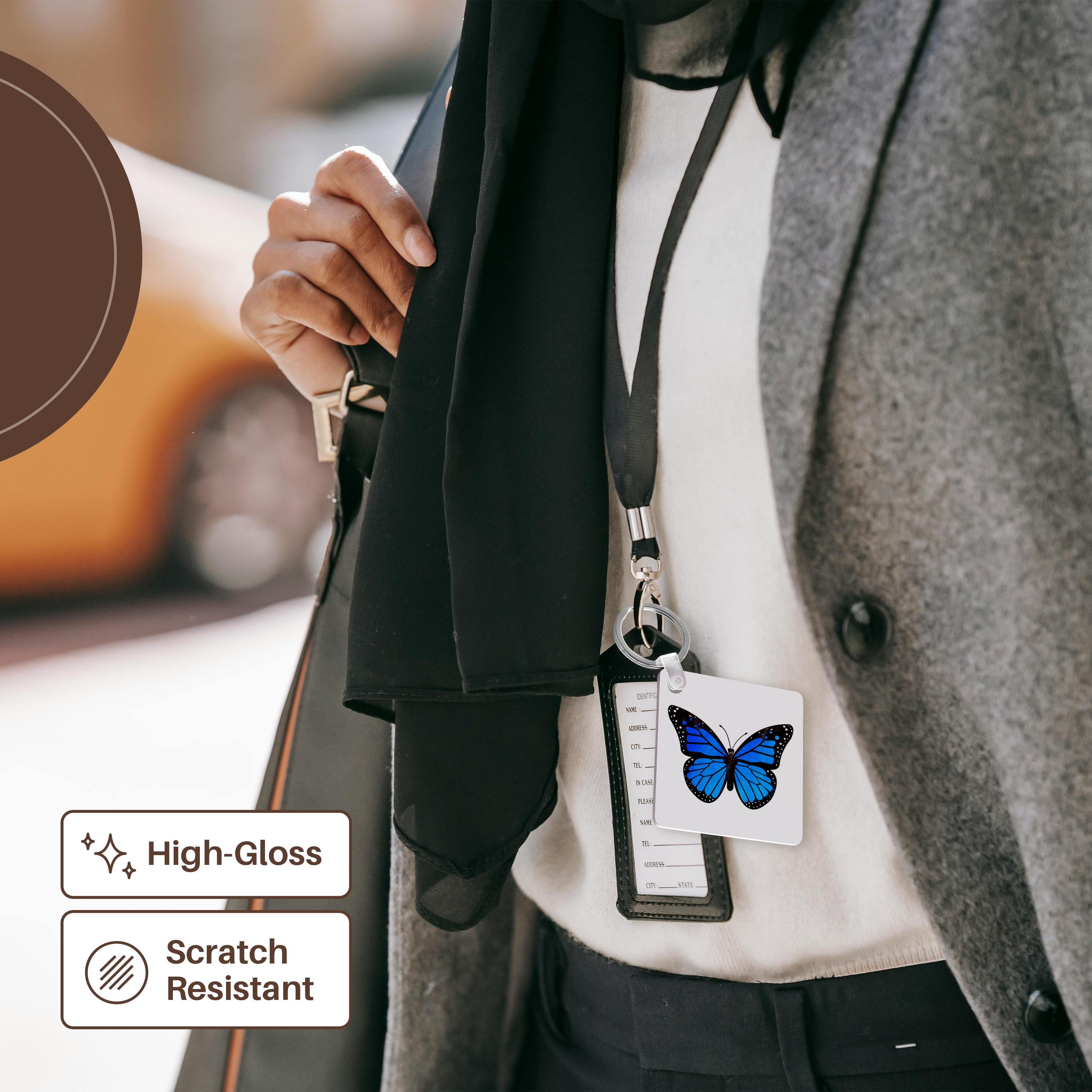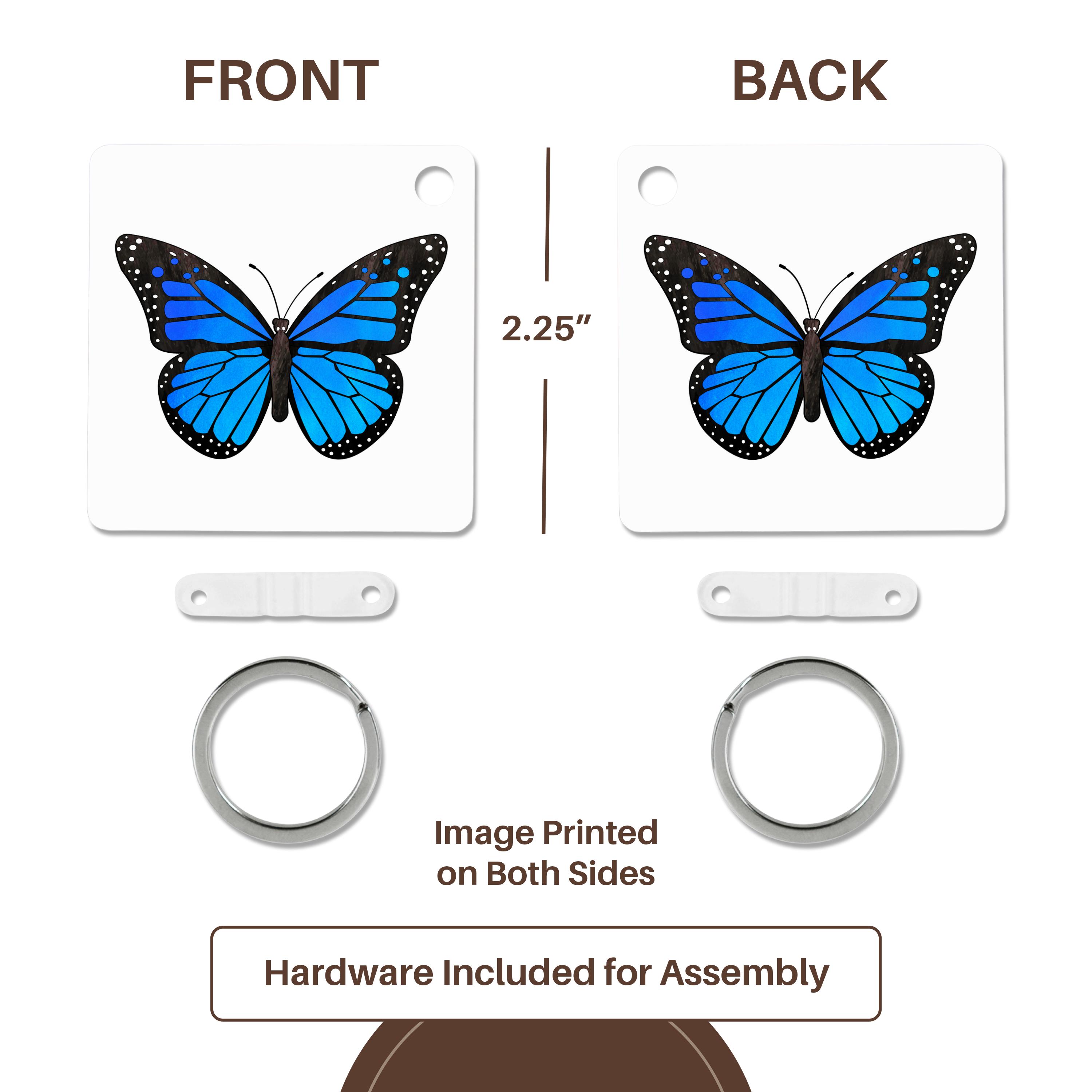 Blue Monarch Butterfly Key Chain is available in sets of 2, 4 and 6; making them perfect for sharing. Image is printed on both sides and has a high gloss finish. Measures 2 3/8" x 2 3/8" x 3/8" and are made of heavy duty durable plastic. Rings and plastic clips included.