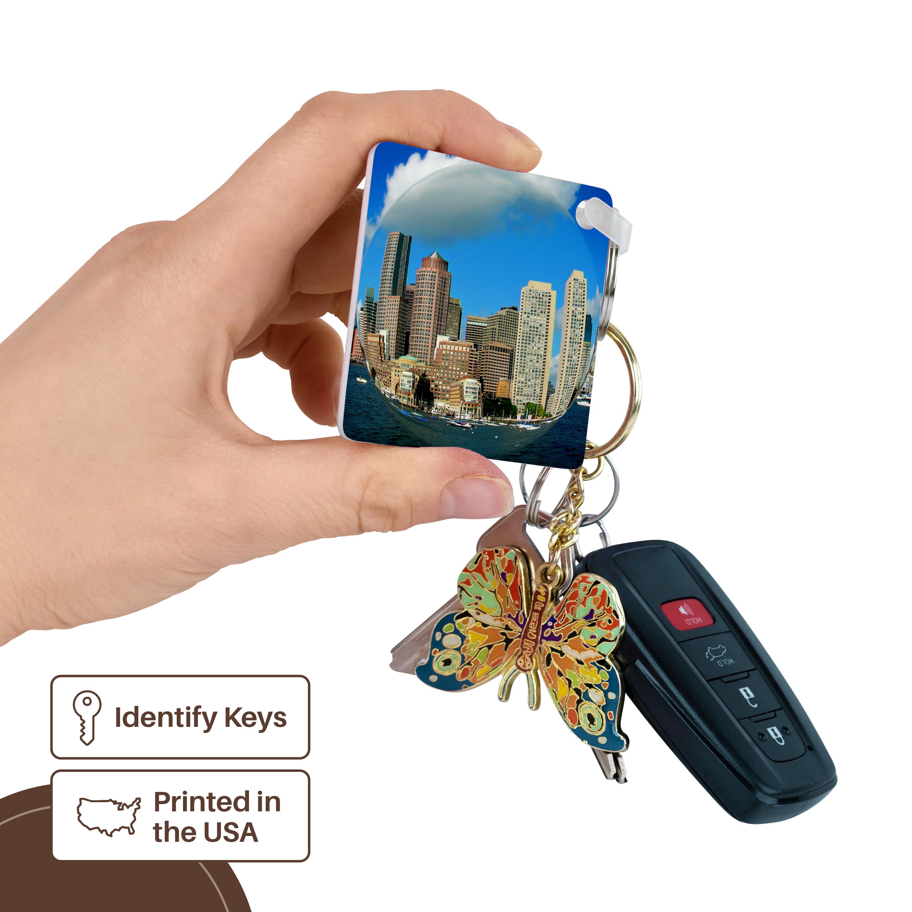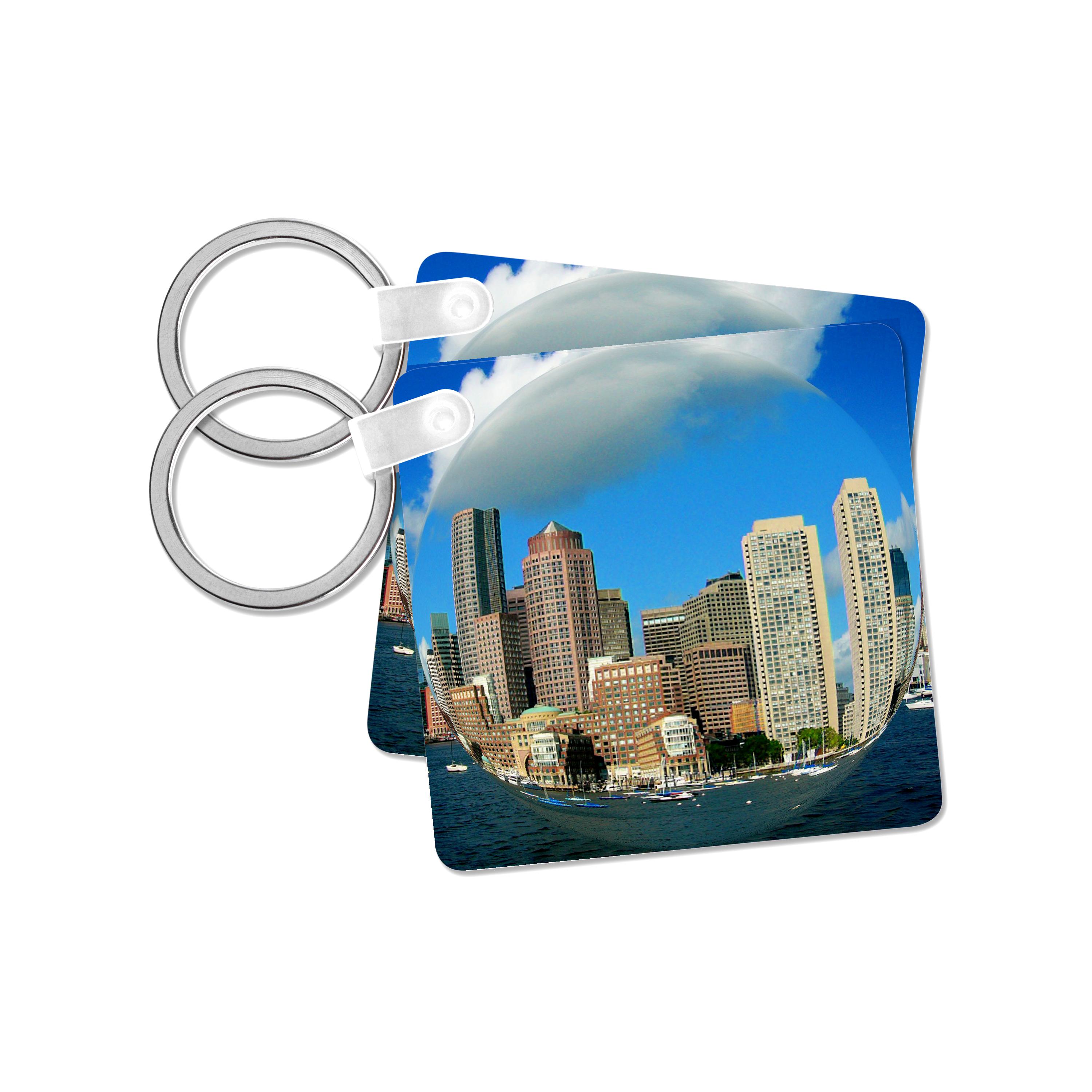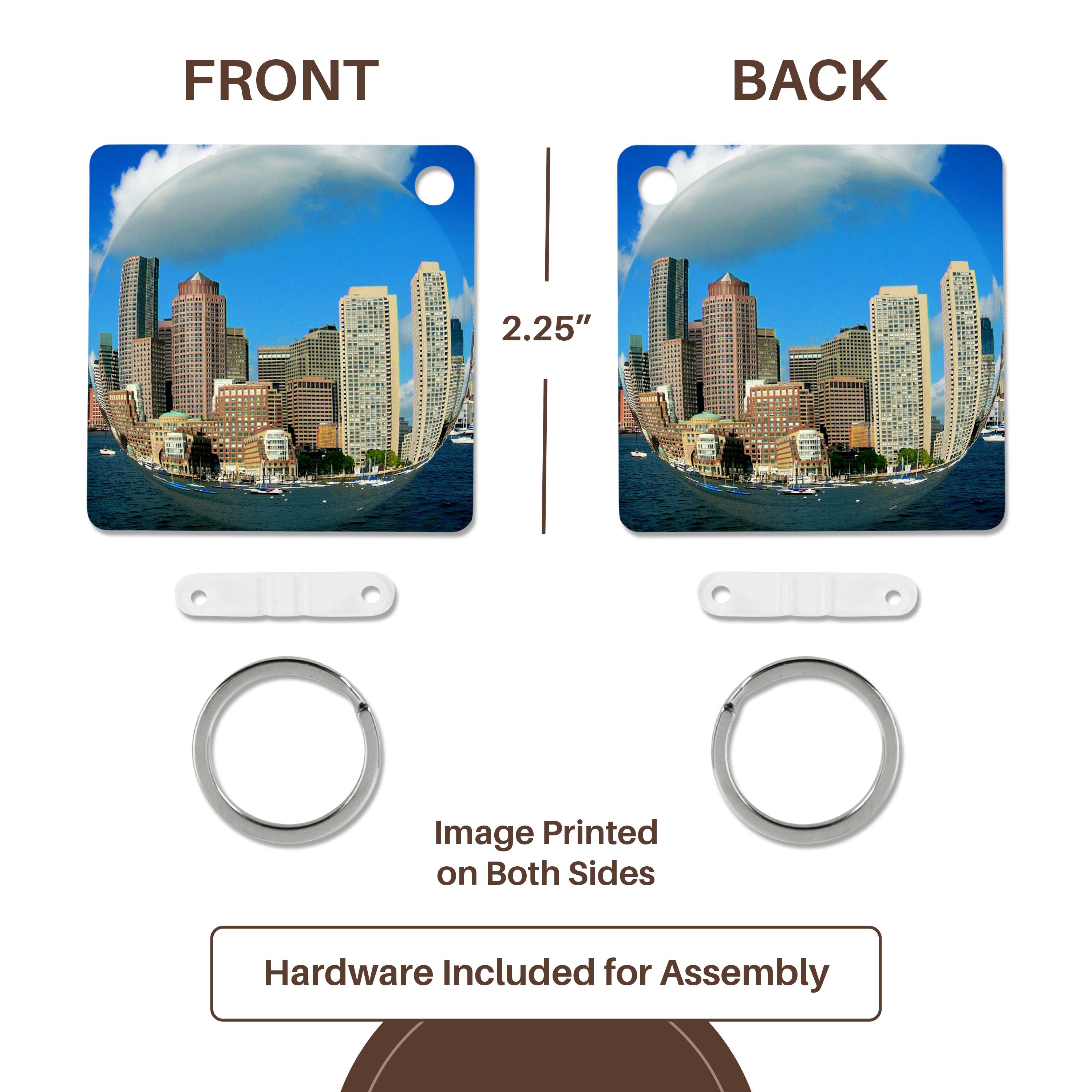 Boston Downtown Skyline in Fisheye Key Chain is available in sets of 2, 4 and 6; making them perfect for sharing. Image is printed on both sides and has a high gloss finish. Measures 2 3/8" x 2 3/8" x 3/8" and are made of heavy duty durable plastic. Rings and plastic clips included.