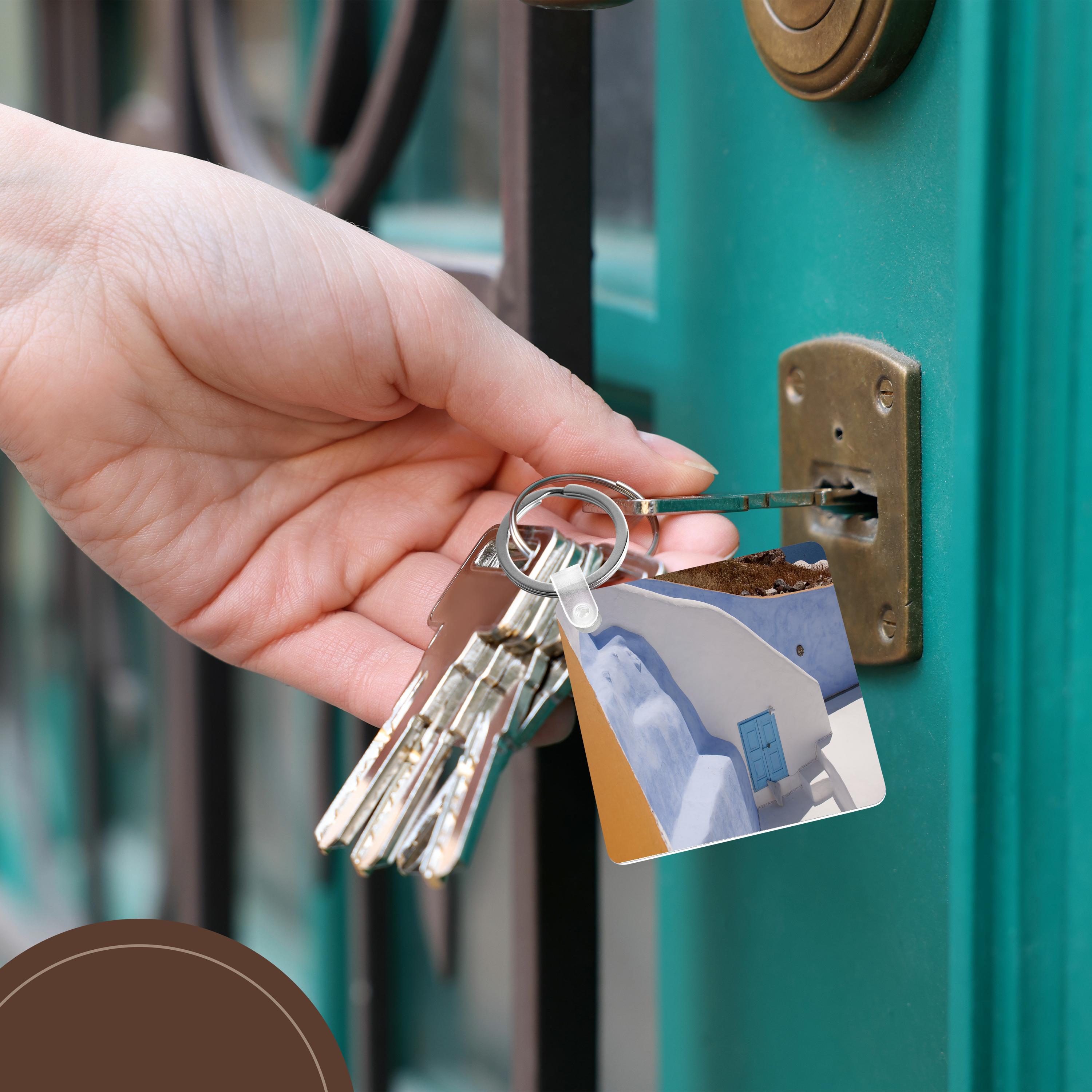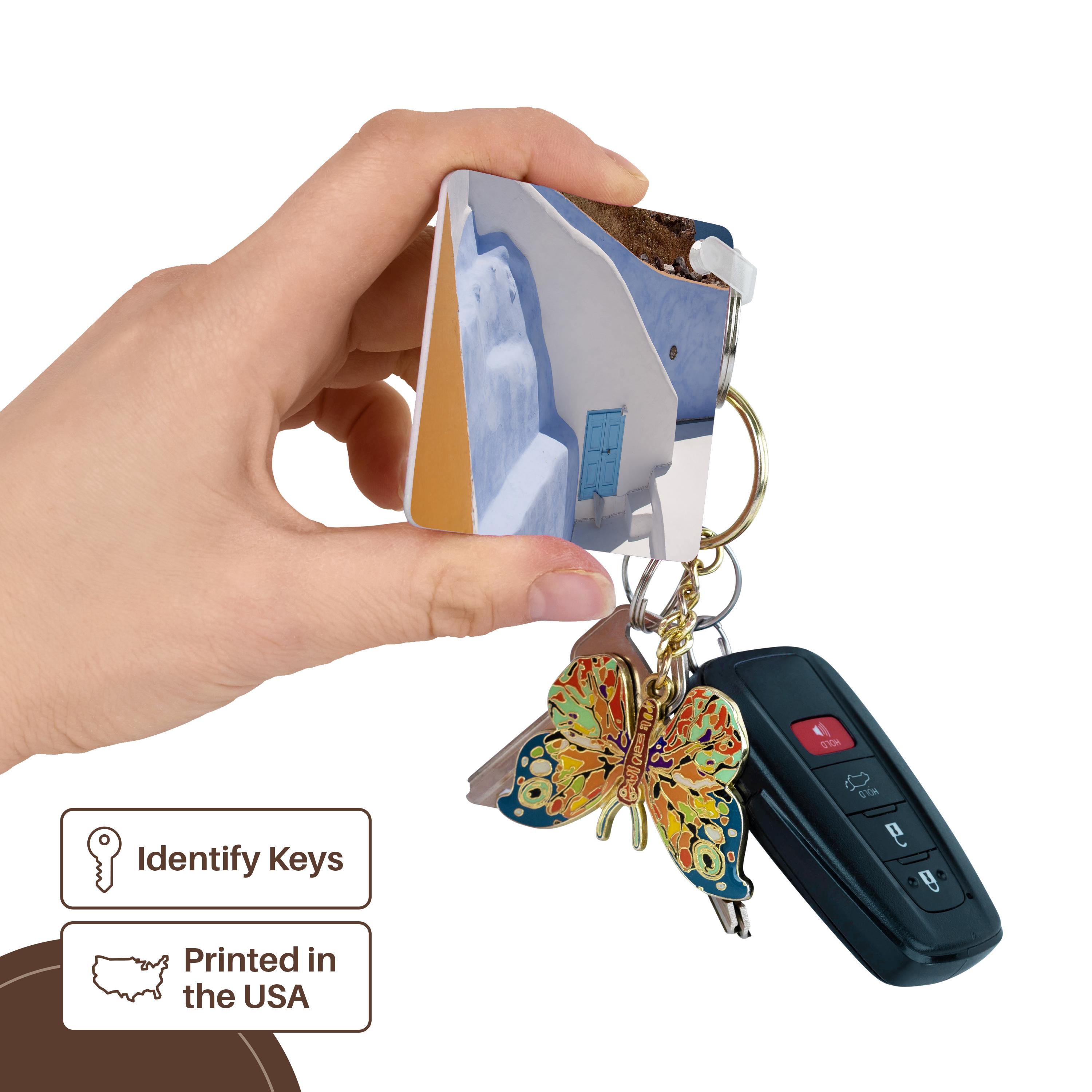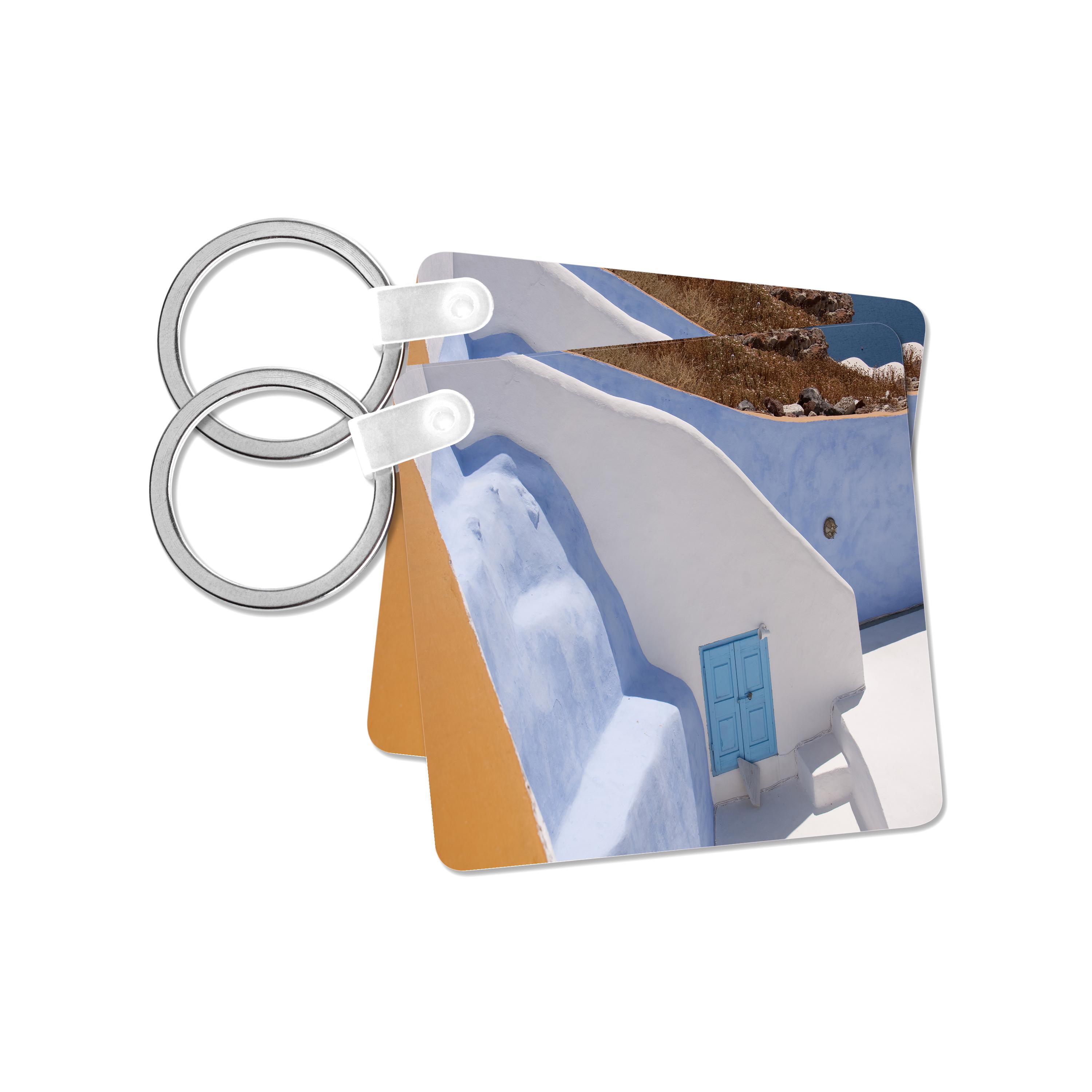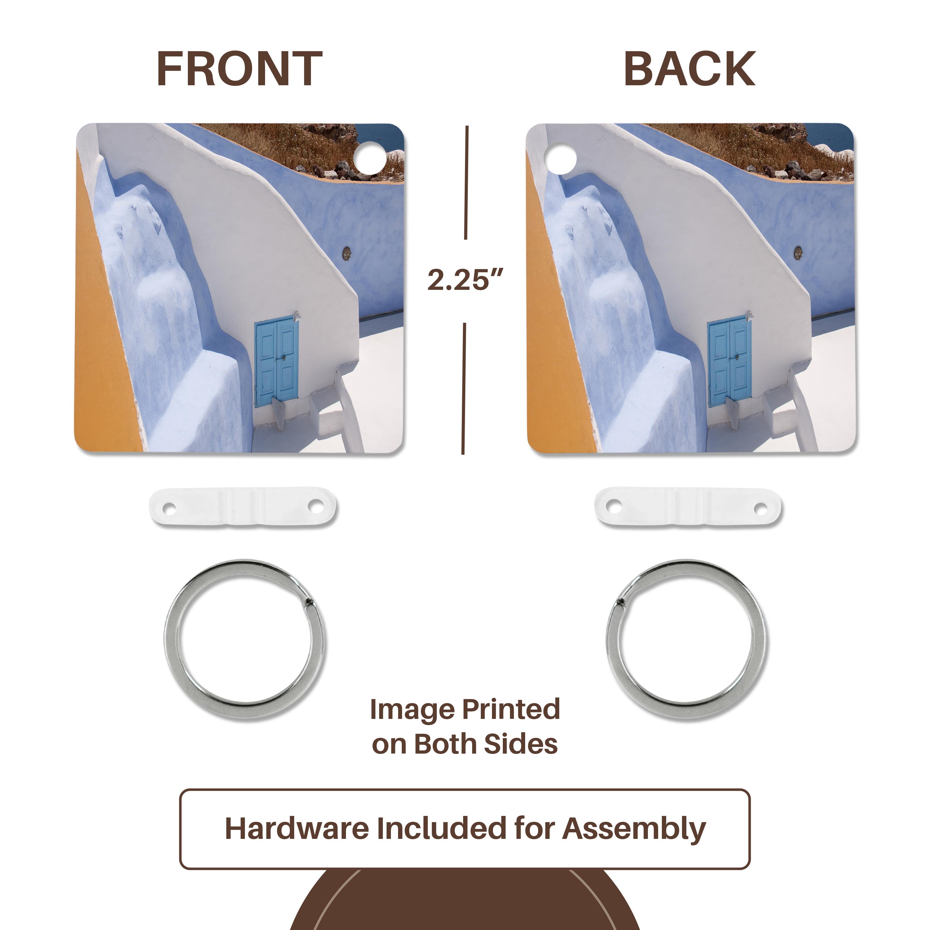 Five Shades of Blue-Santorini, Greece Key Chain is available in sets of 2, 4 and 6; making them perfect for sharing. Image is printed on both sides and has a high gloss finish. Measures 2 3/8" x 2 3/8" x 3/8" and are made of heavy duty durable plastic. Rings and plastic clips included.