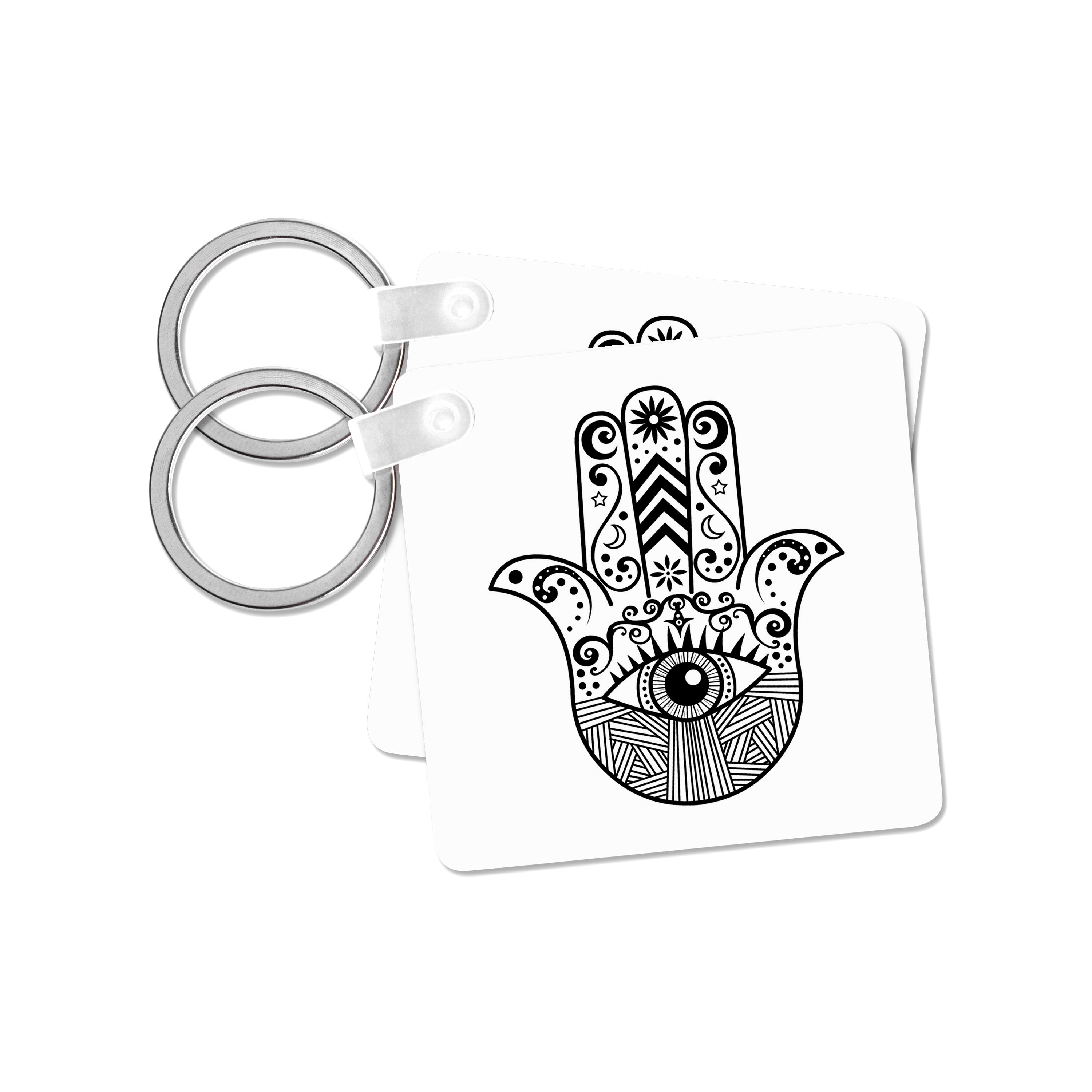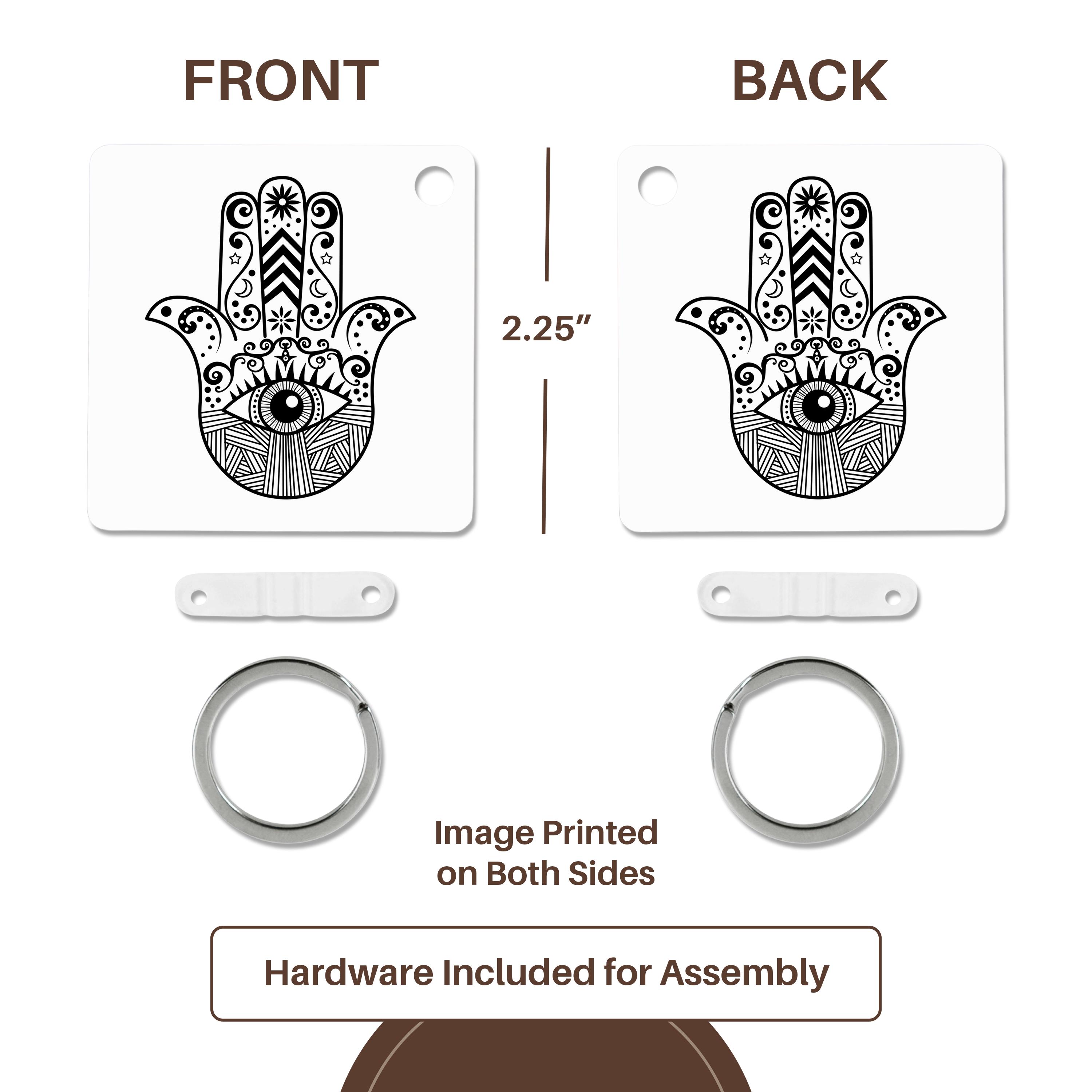 Hamsa Hand Black and White Key Chain is available in sets of 2, 4 and 6; making them perfect for sharing. Image is printed on both sides and has a high gloss finish. Measures 2 3/8" x 2 3/8" x 3/8" and are made of heavy duty durable plastic. Rings and plastic clips included.