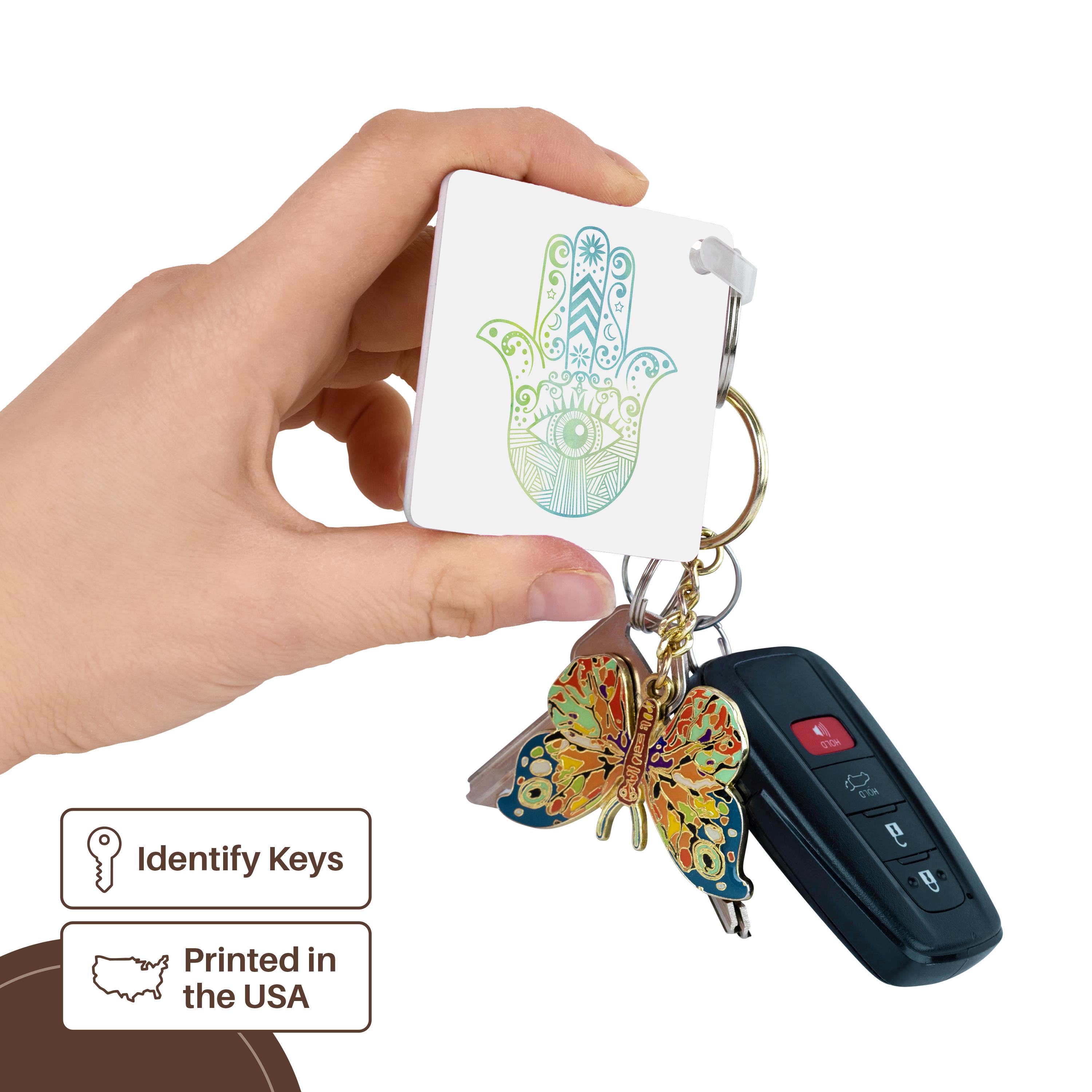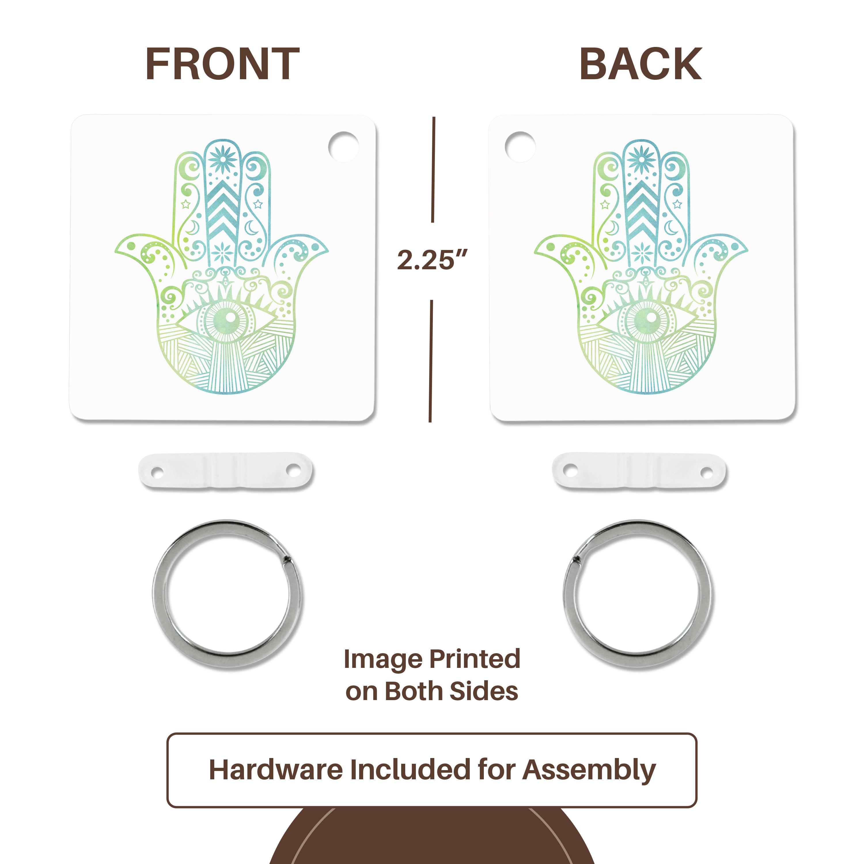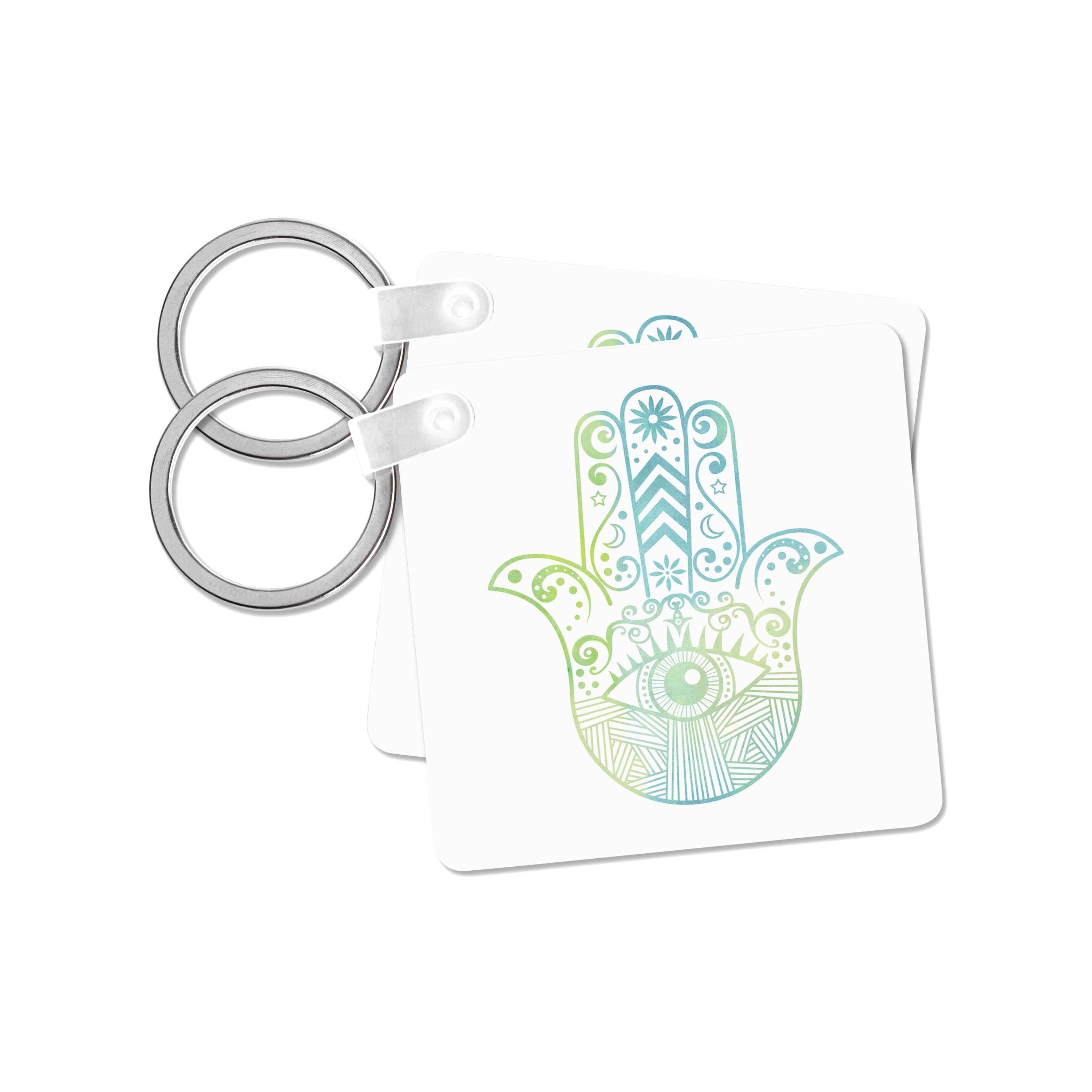 Hamsa Hand Green and Blue Watercolor Key Chain is available in sets of 2, 4 and 6; making them perfect for sharing. Image is printed on both sides and has a high gloss finish. Measures 2 3/8" x 2 3/8" x 3/8" and are made of heavy duty durable plastic. Rings and plastic clips included.