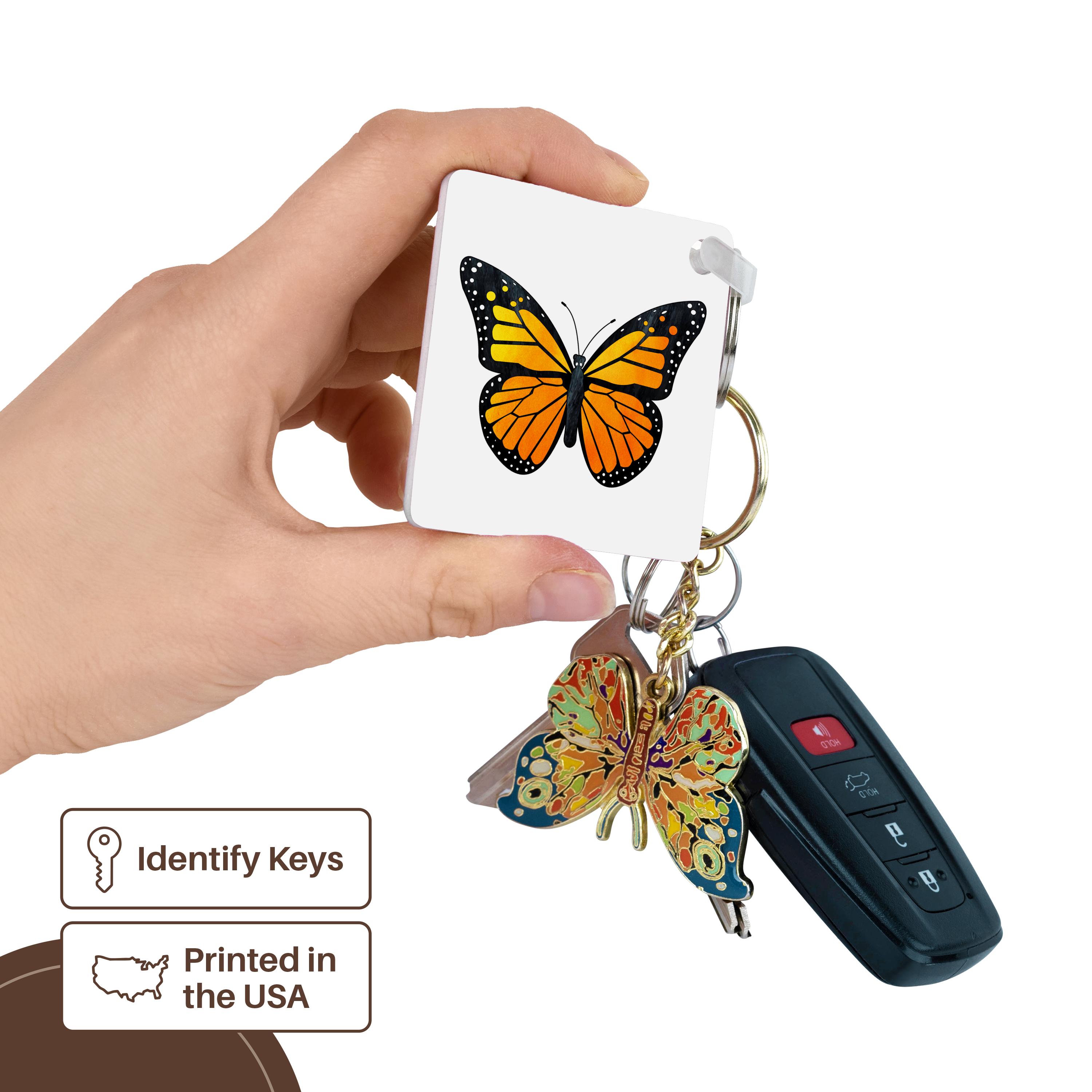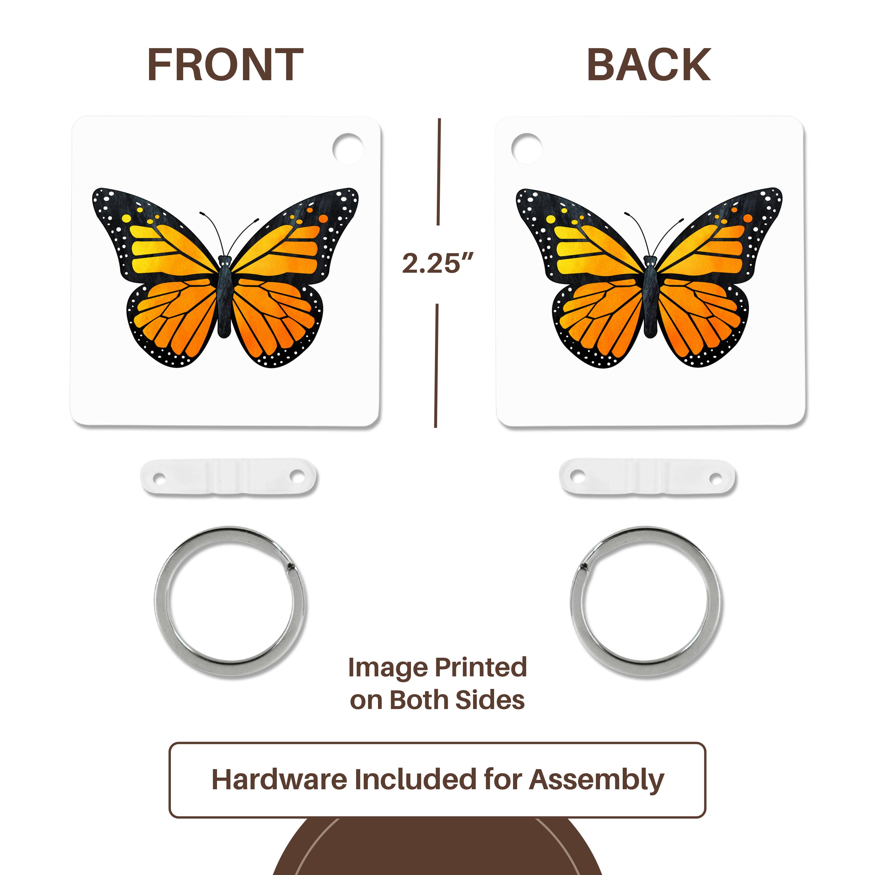 Orange Monarch Butterfly Key Chain is available in sets of 2, 4 and 6; making them perfect for sharing. Image is printed on both sides and has a high gloss finish. Measures 2 3/8" x 2 3/8" x 3/8" and are made of heavy duty durable plastic. Rings and plastic clips included.