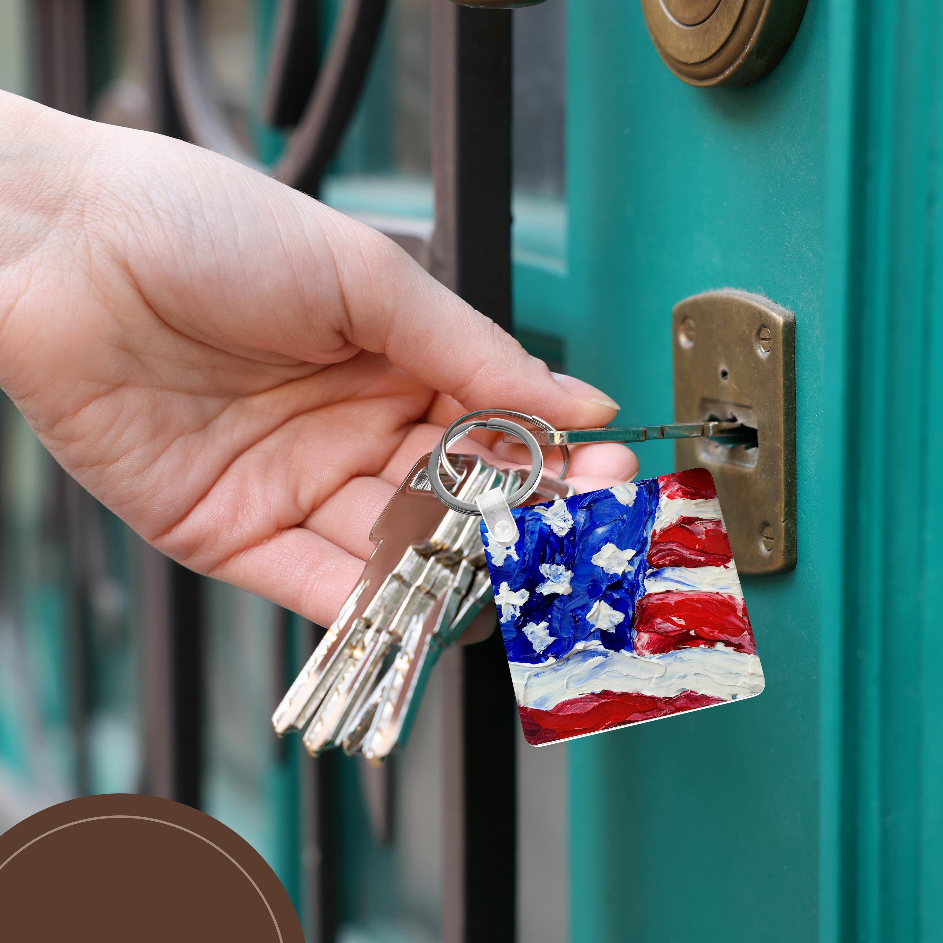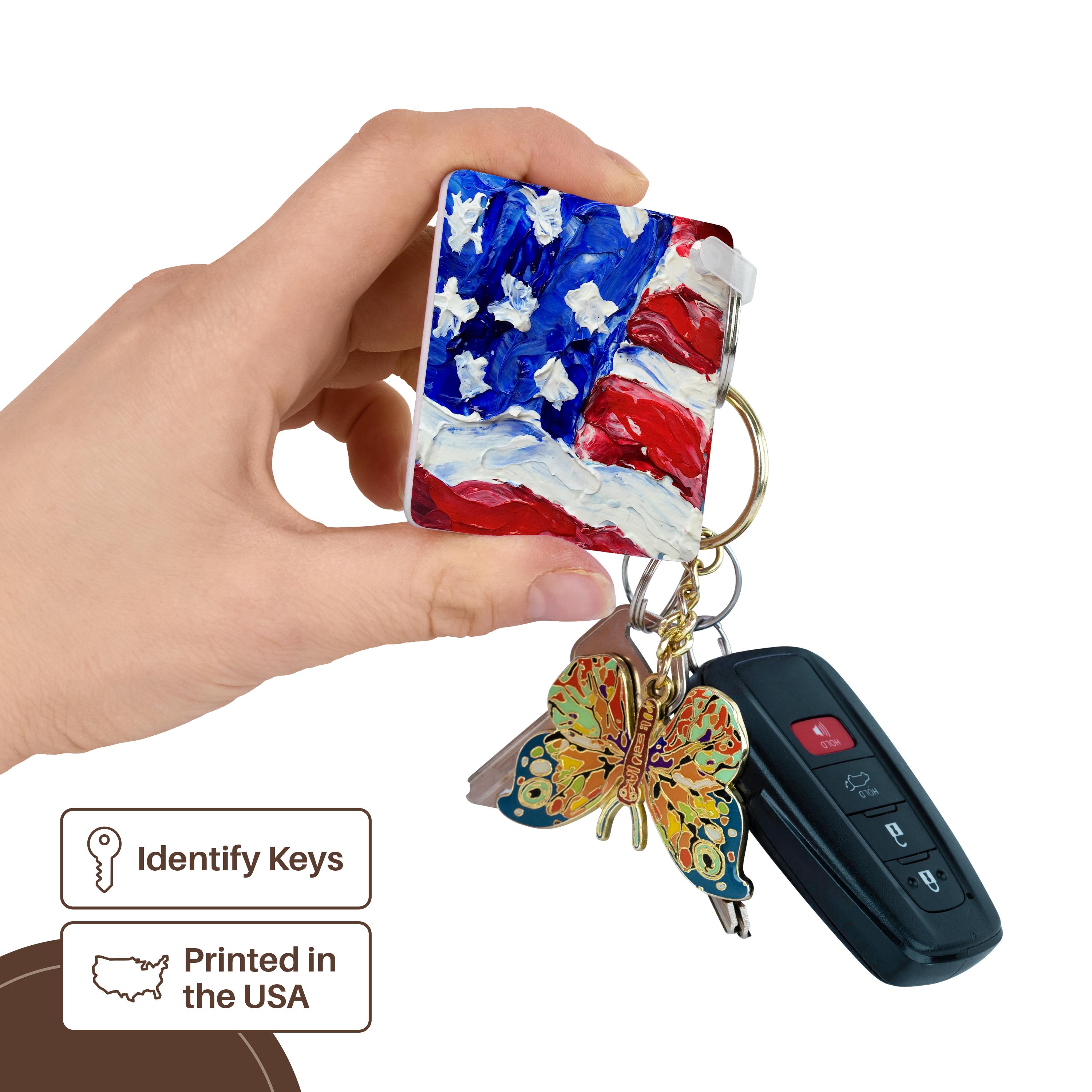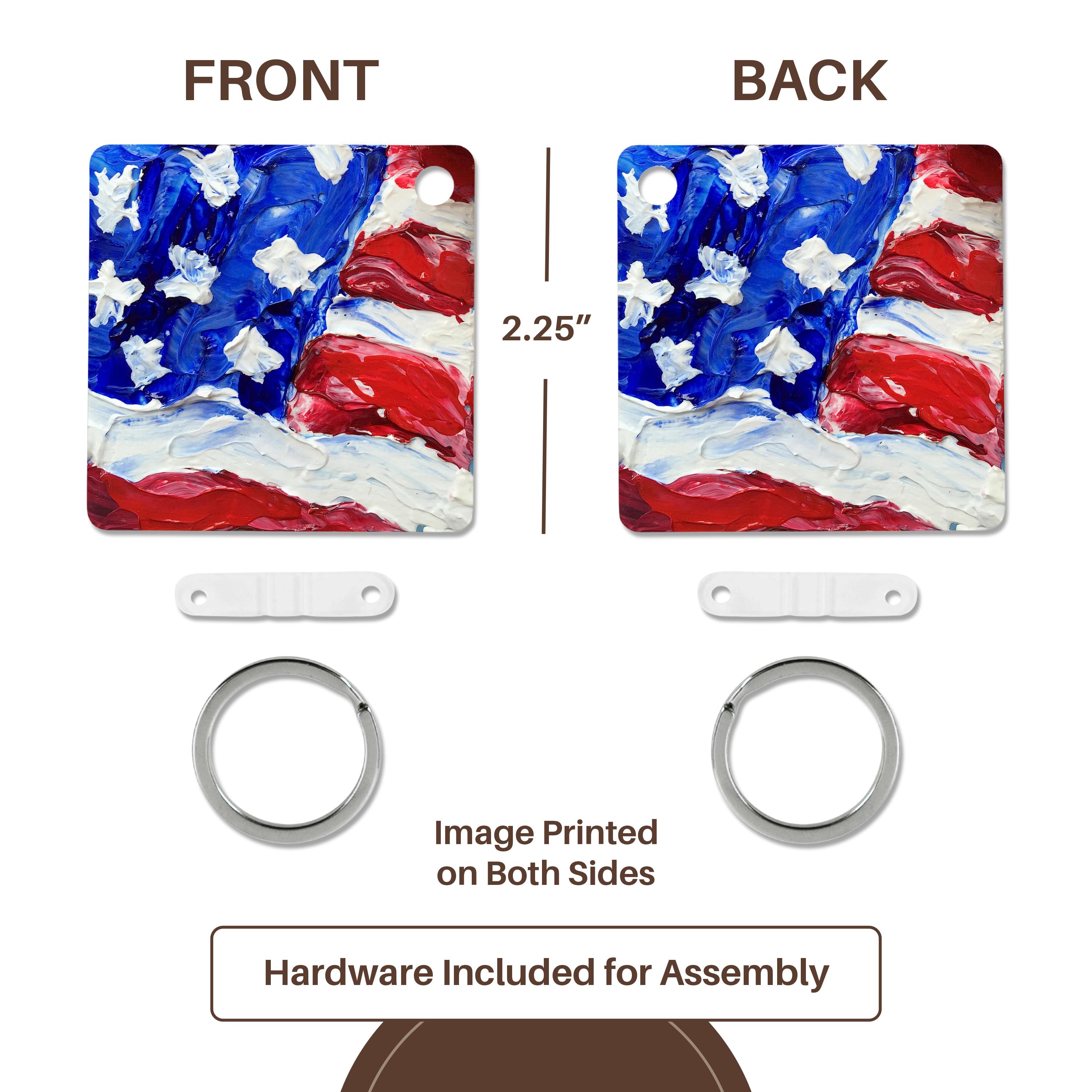 Picture of the US Flag Key Chain is available in sets of 2, 4 and 6; making them perfect for sharing. Image is printed on both sides and has a high gloss finish. Measures 2 3/8" x 2 3/8" x 3/8" and are made of heavy duty durable plastic. Rings and plastic clips included.