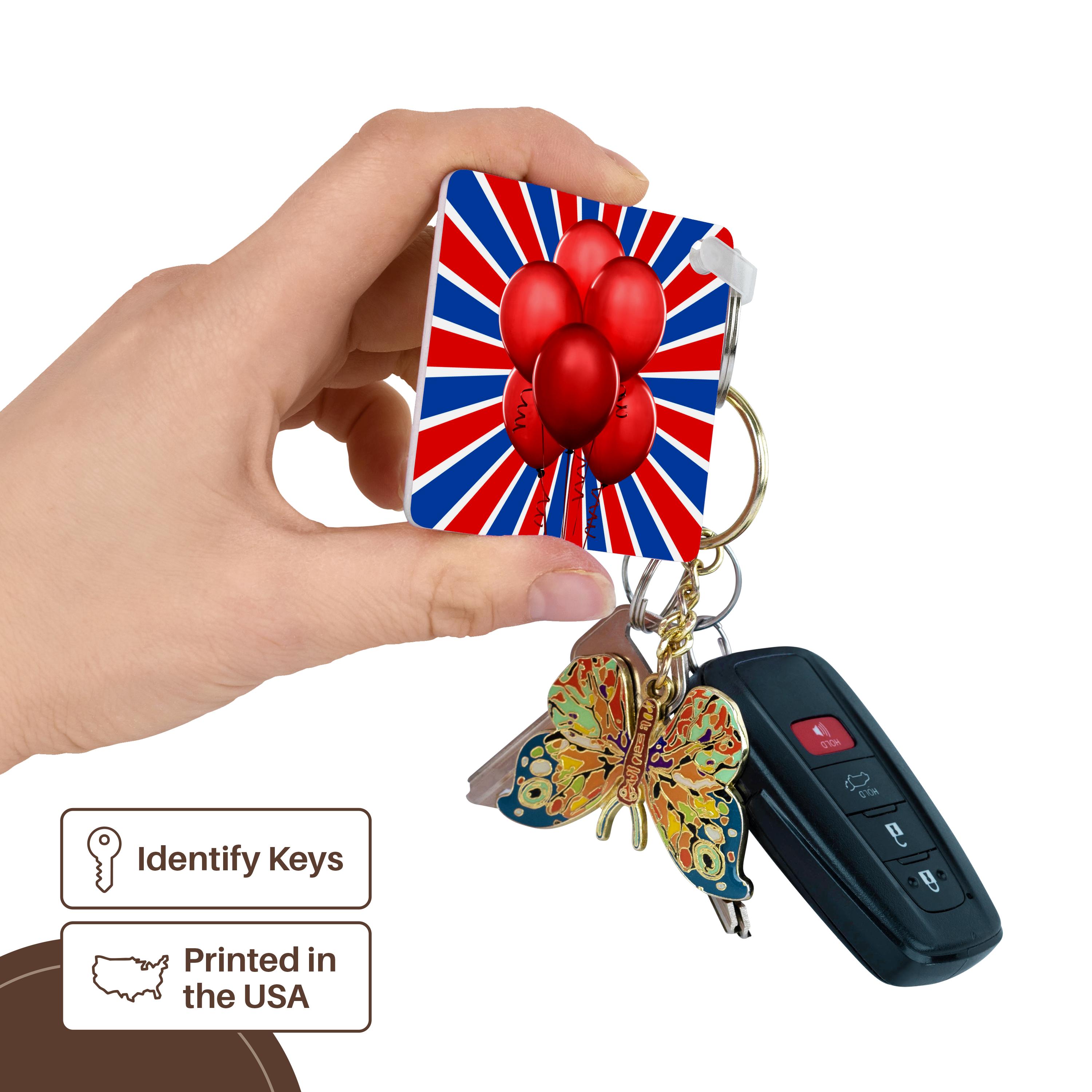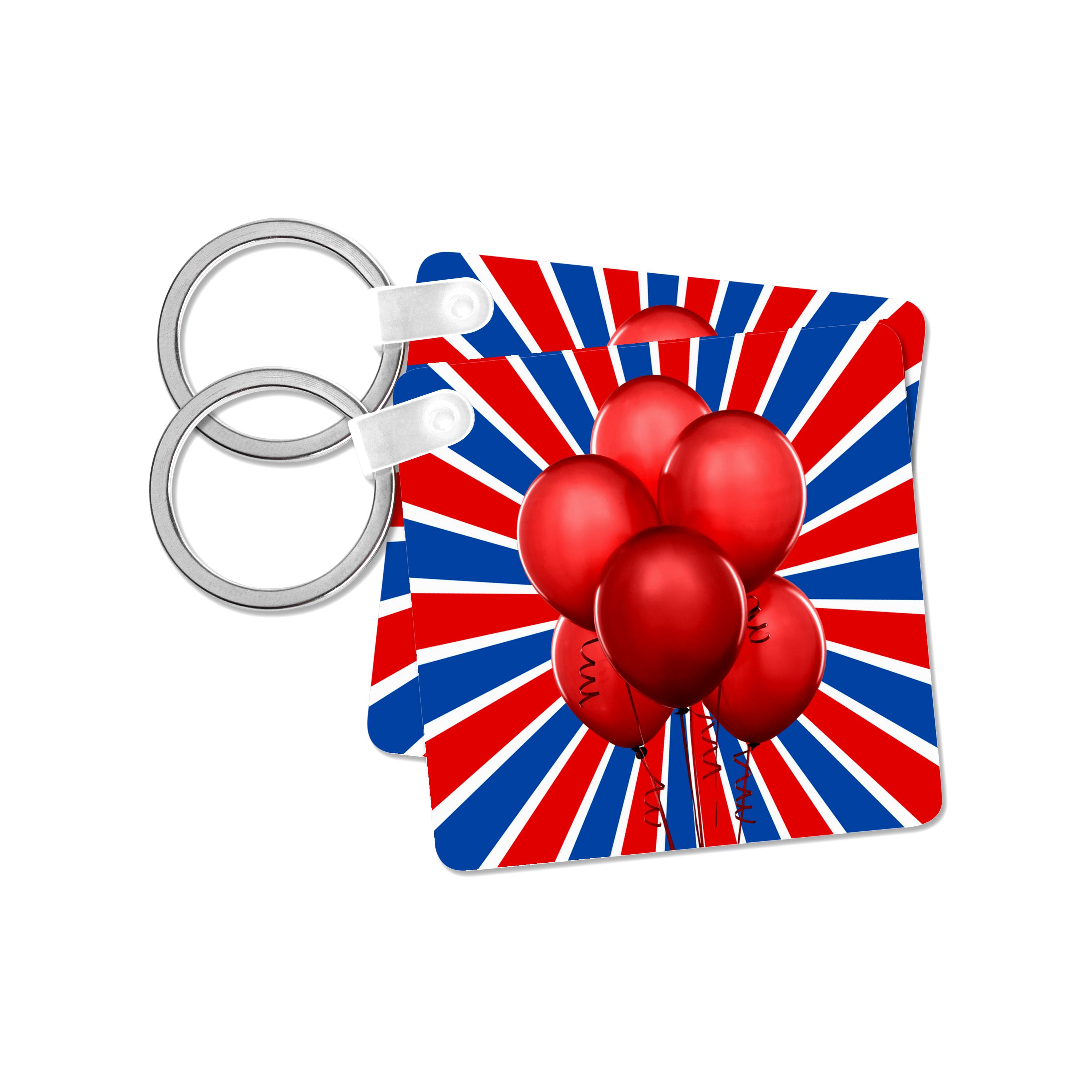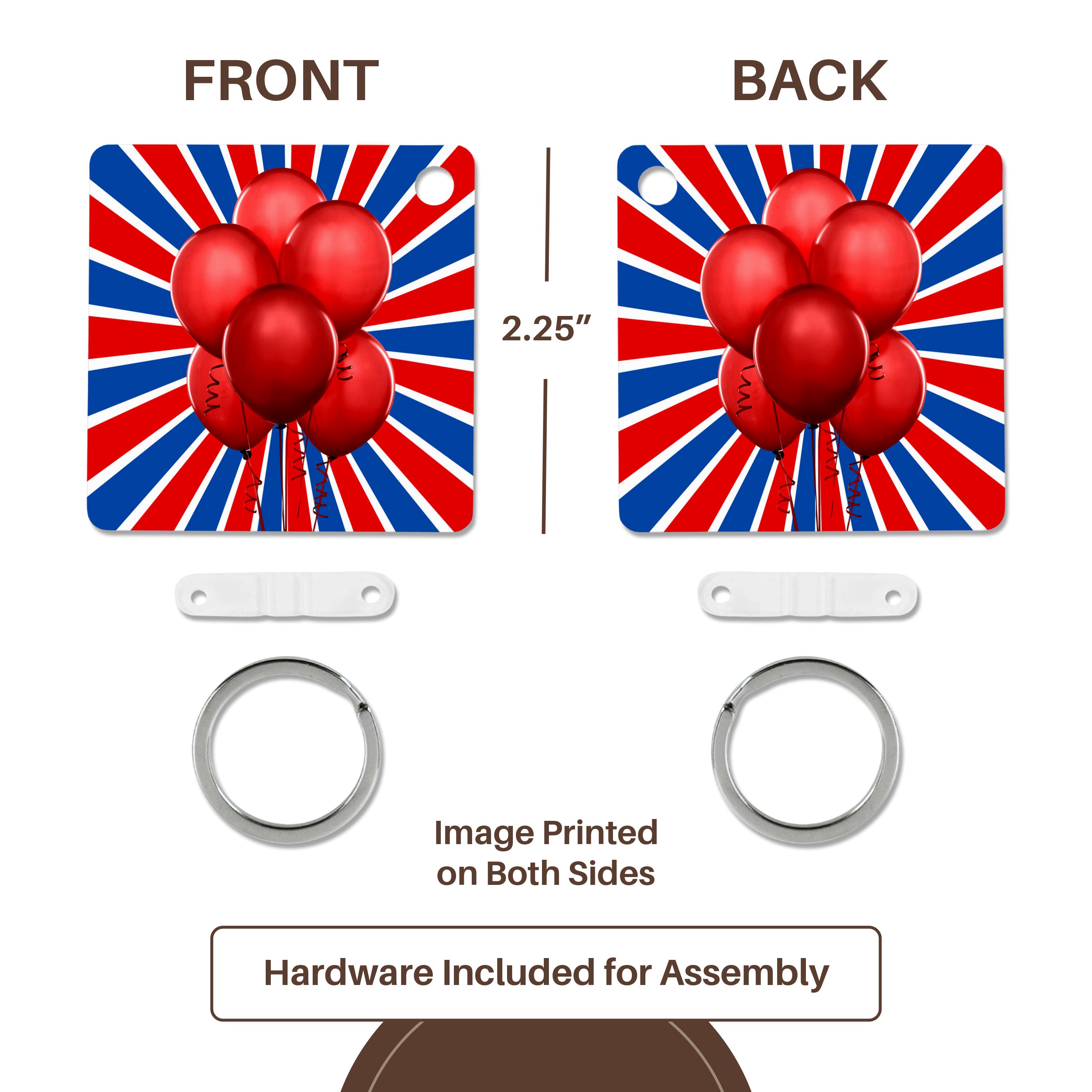 Red White and Blue Stripe Sunburst with Red Balloons Key Chain is available in sets of 2, 4 and 6; making them perfect for sharing. Image is printed on both sides and has a high gloss finish. Measures 2 3/8" x 2 3/8" x 3/8" and are made of heavy duty durable plastic. Rings and plastic clips included.