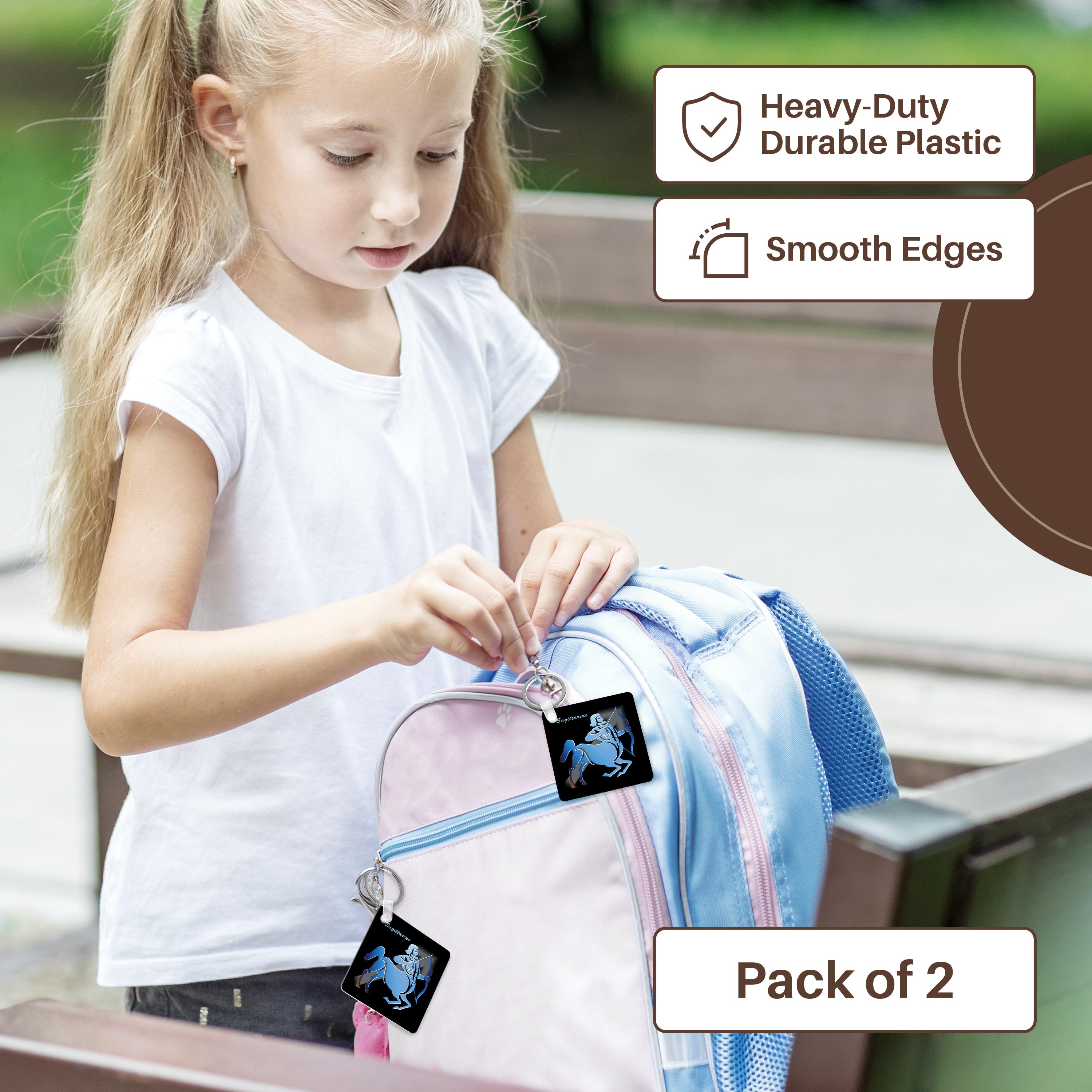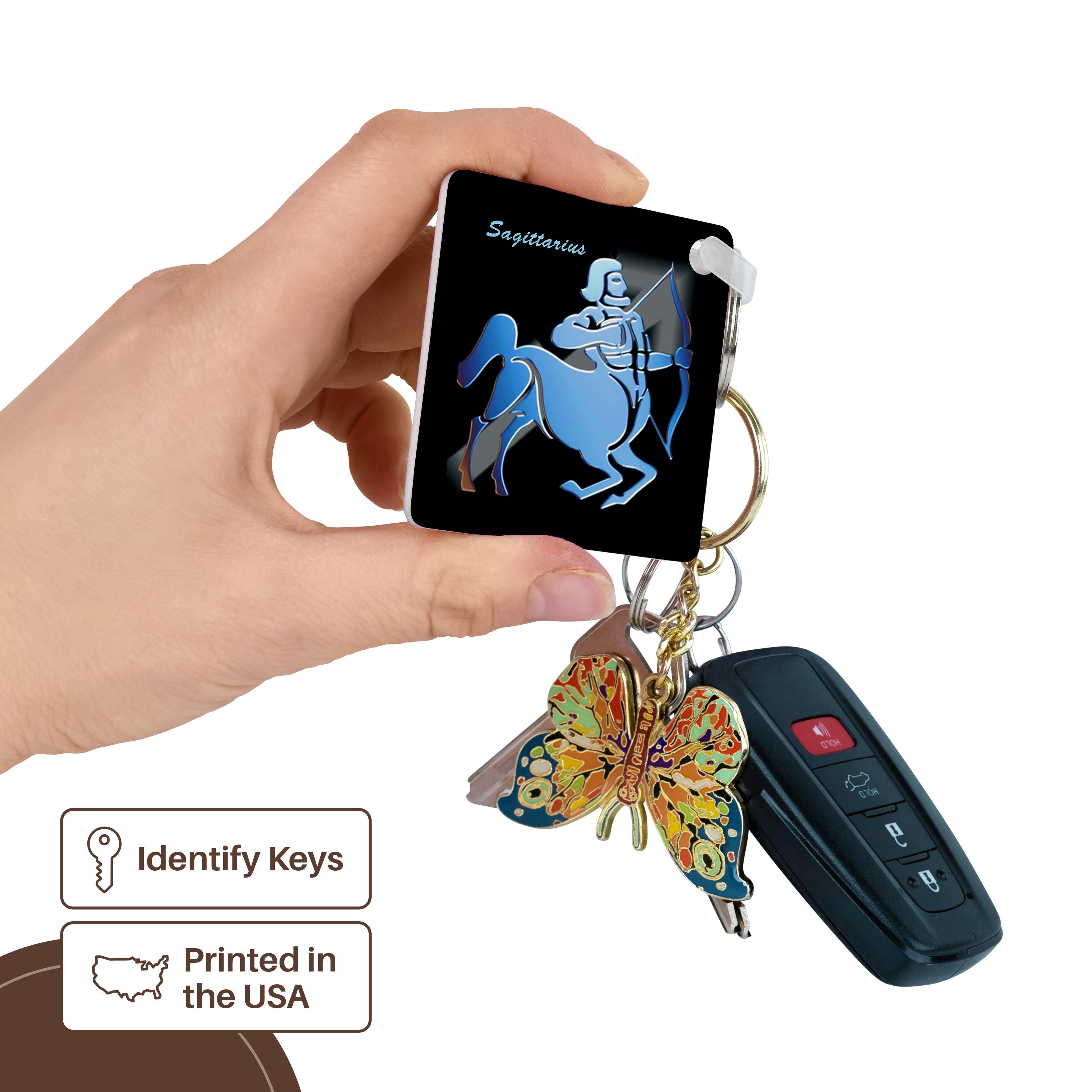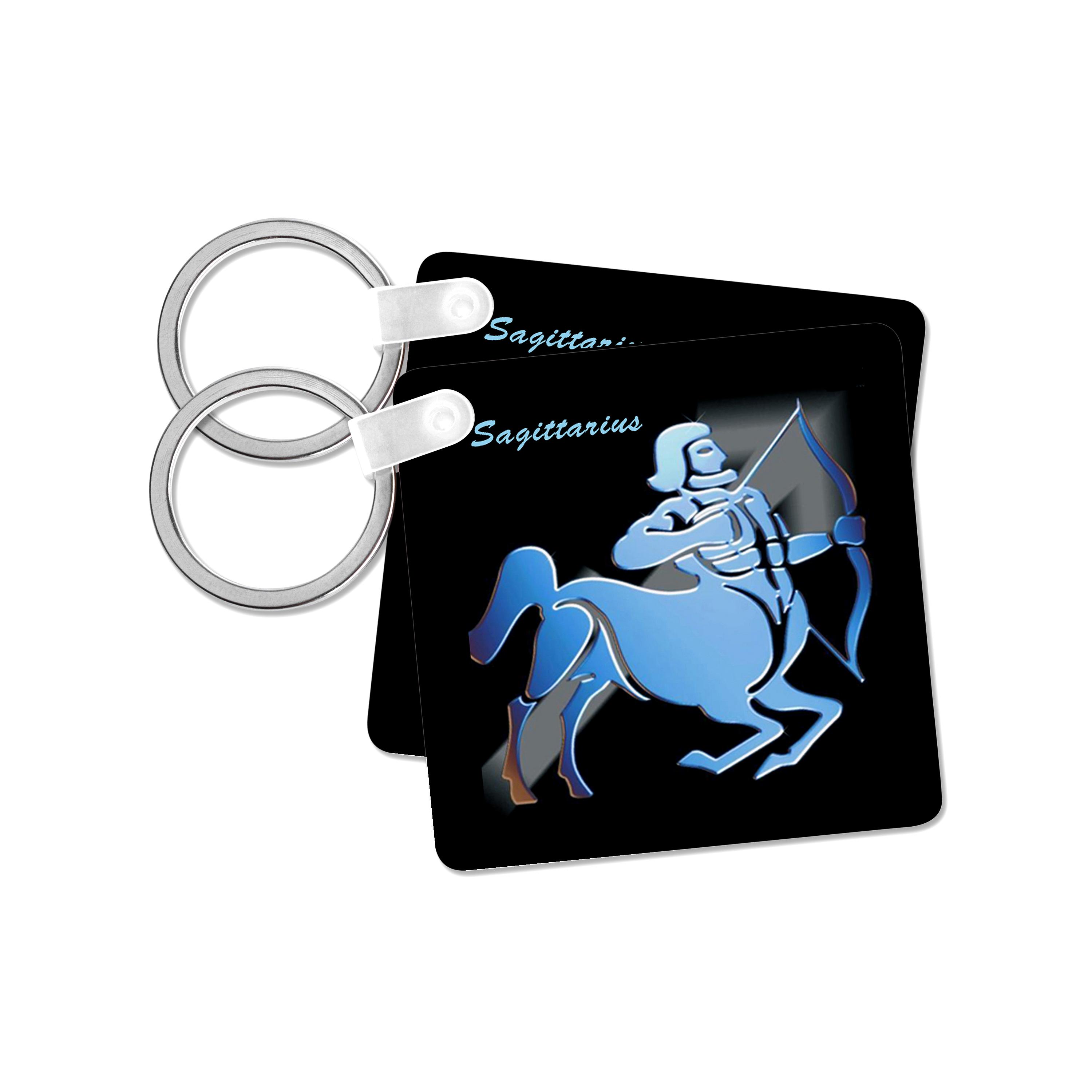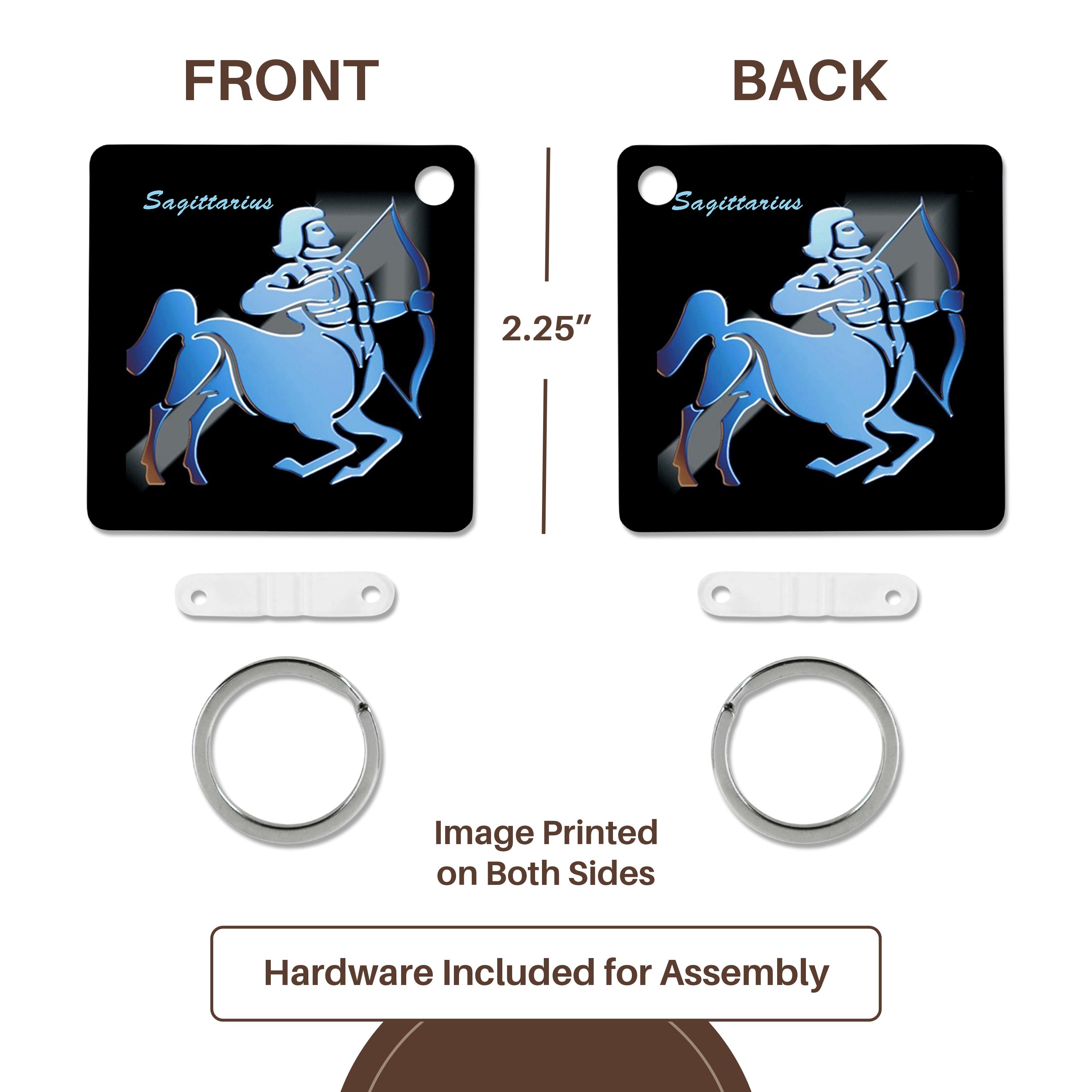 Sagittarius Zodiac Sign Key Chain is available in sets of 2, 4 and 6; making them perfect for sharing. Image is printed on both sides and has a high gloss finish. Measures 2 3/8" x 2 3/8" x 3/8" and are made of heavy duty durable plastic. Rings and plastic clips included.