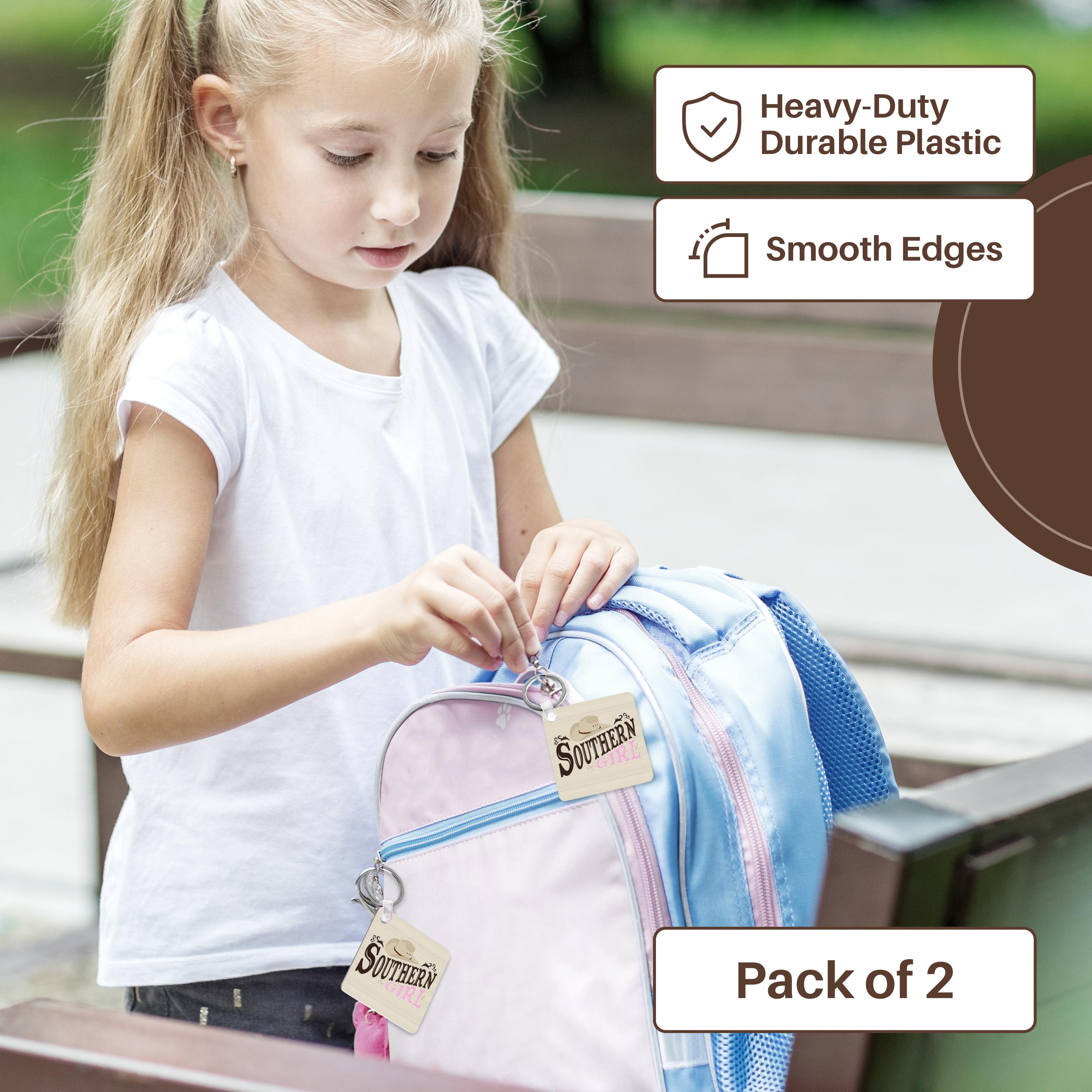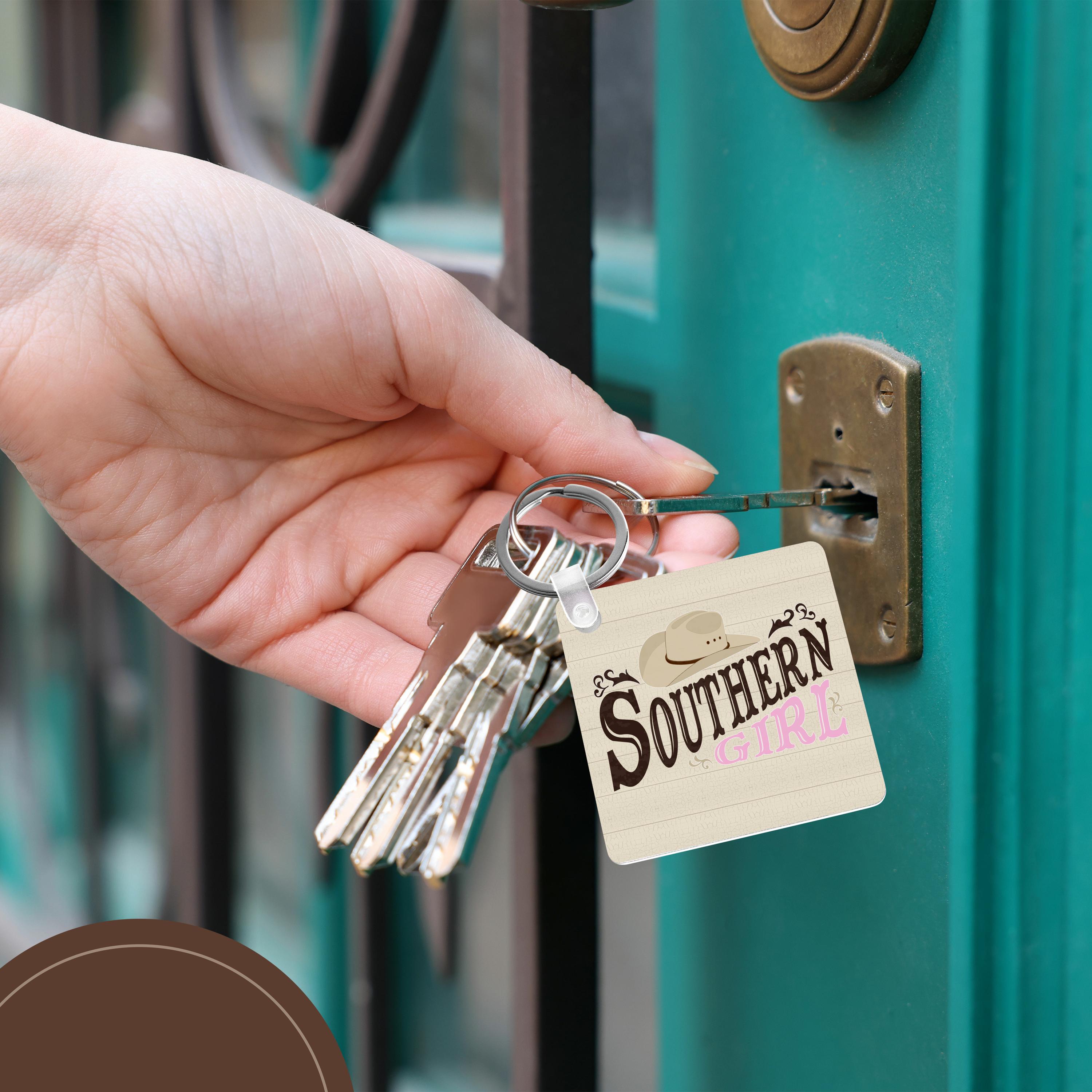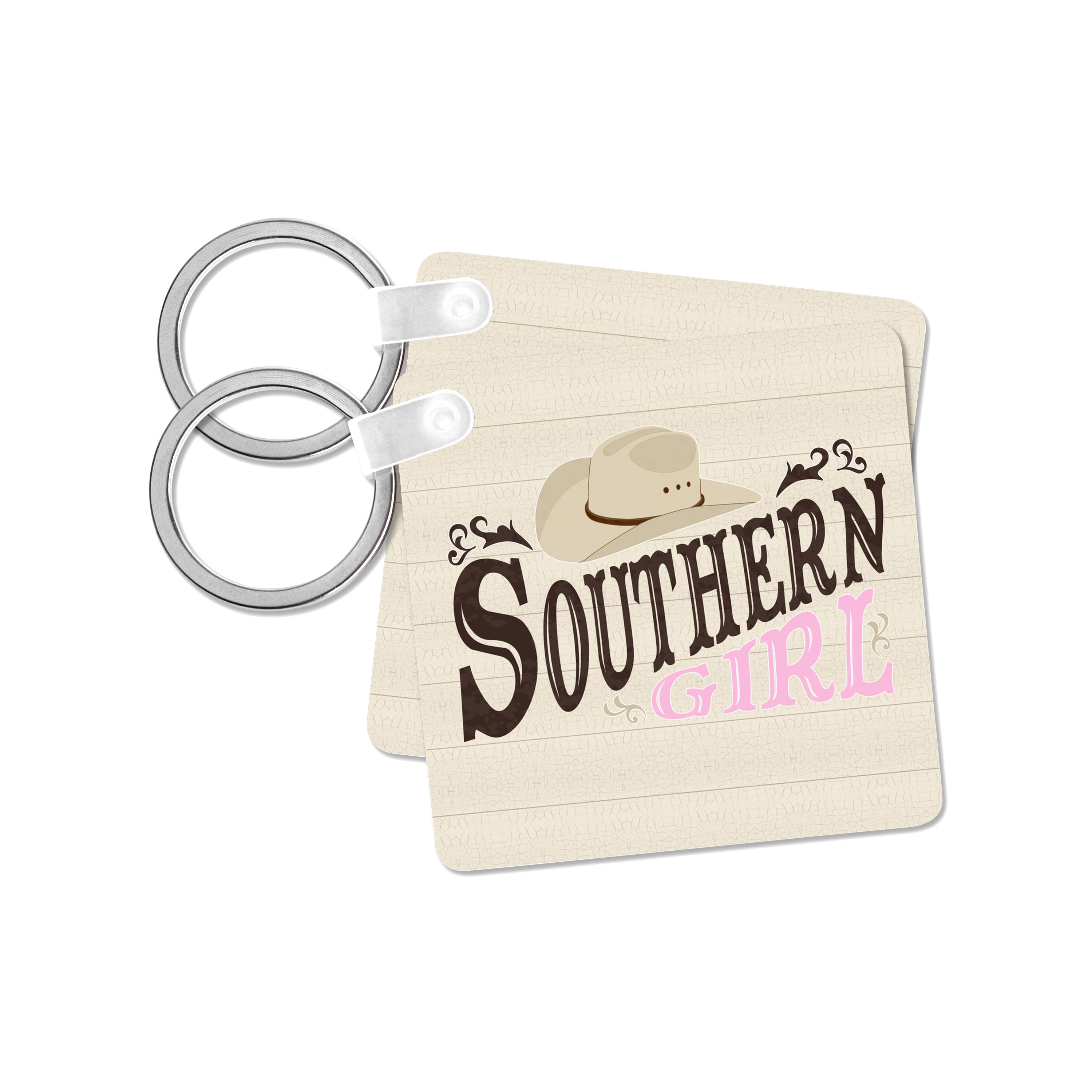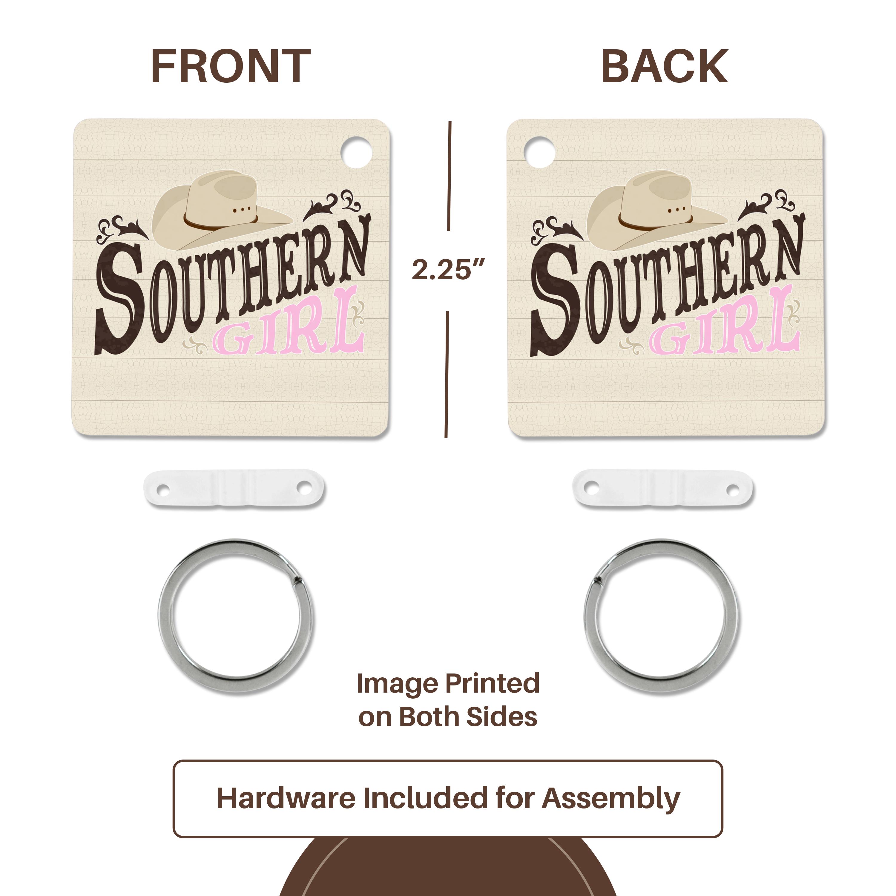 Southern Girl Pink Key Chain is available in sets of 2, 4 and 6; making them perfect for sharing. Image is printed on both sides and has a high gloss finish. Measures 2 3/8" x 2 3/8" x 3/8" and are made of heavy duty durable plastic. Rings and plastic clips included.