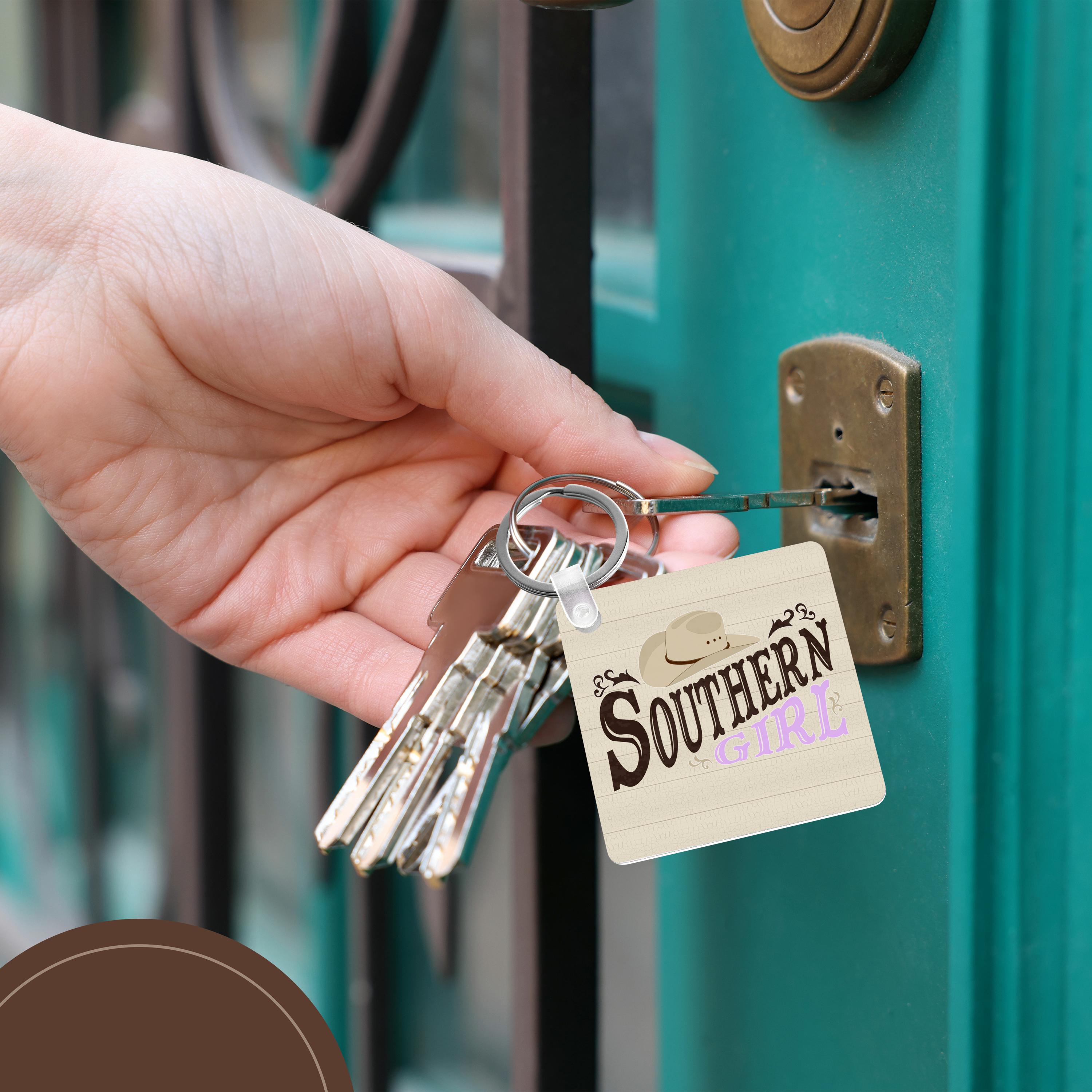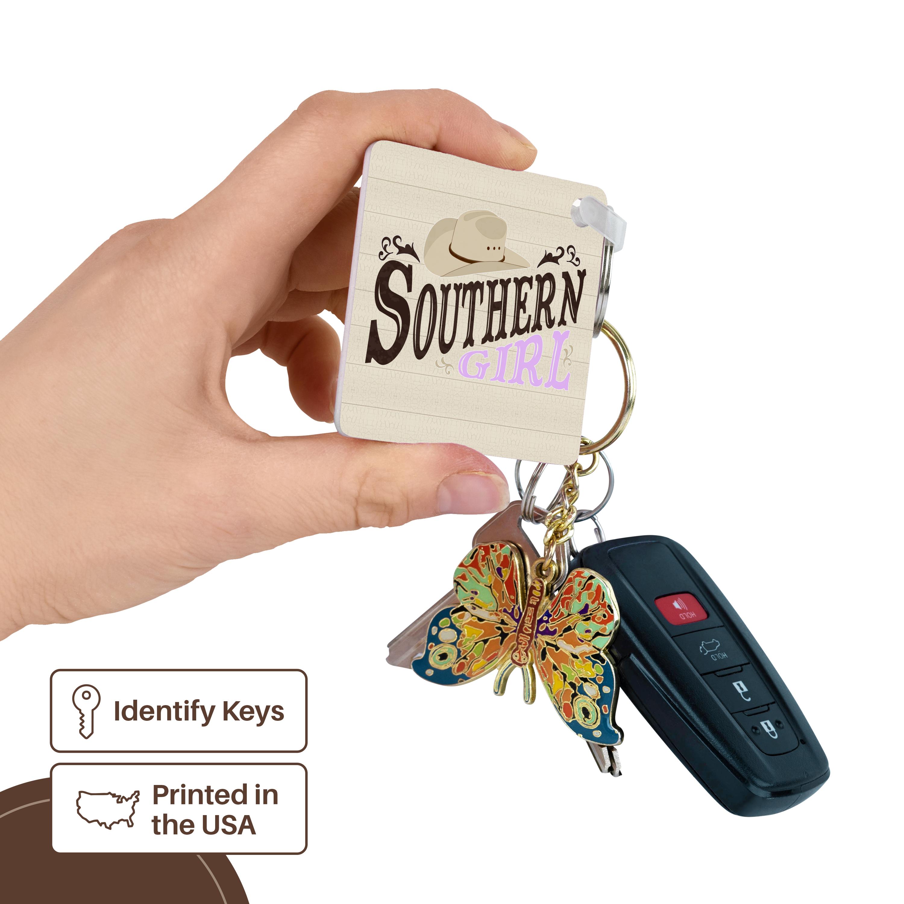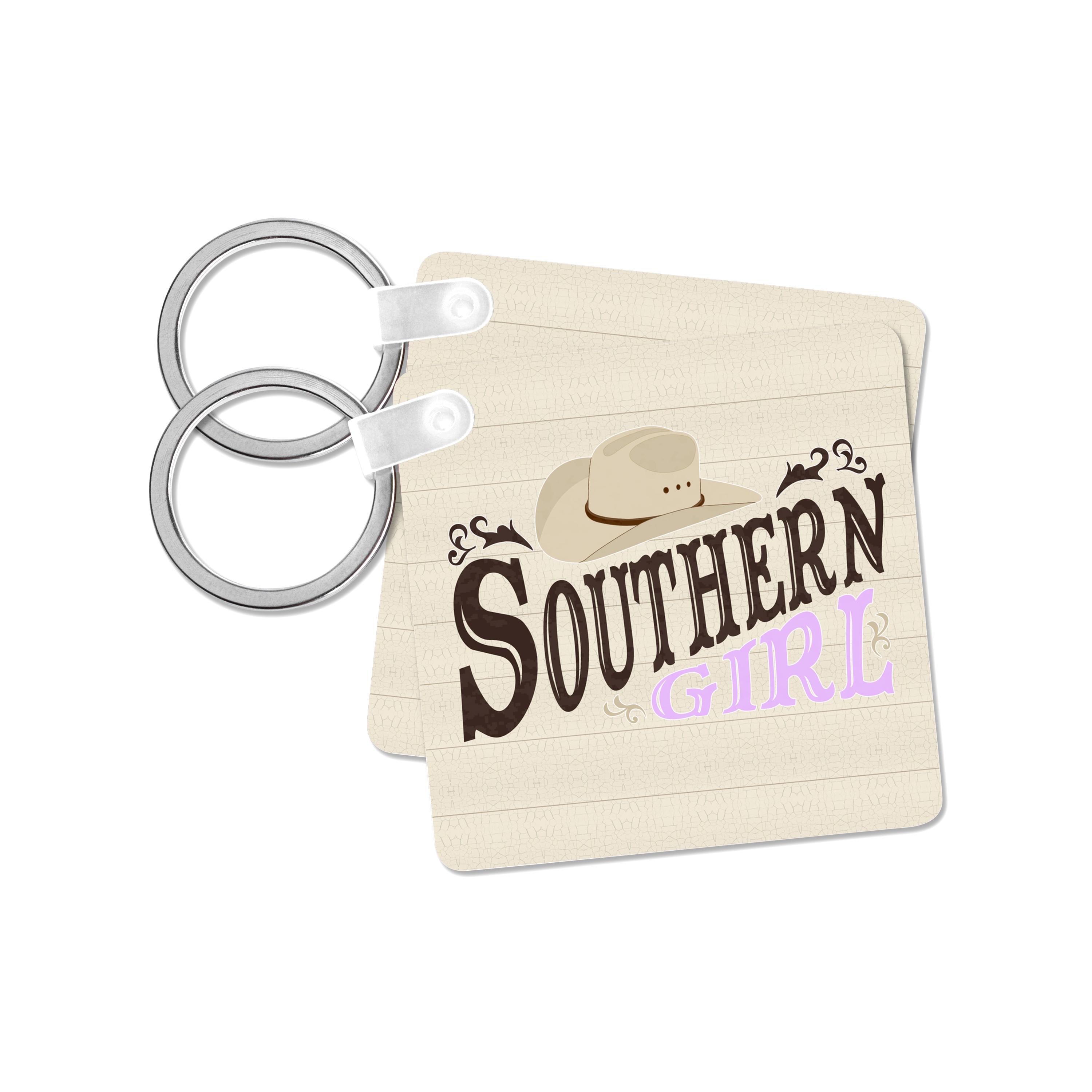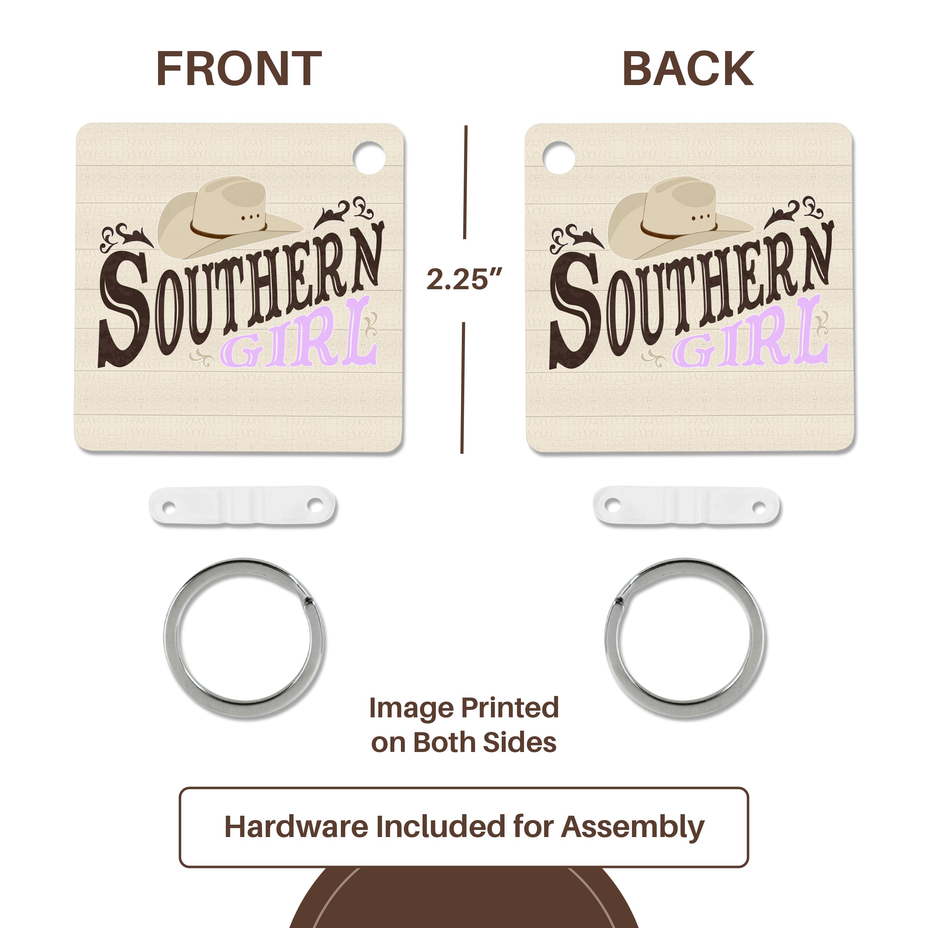 Southern Girl Purple Key Chain is available in sets of 2, 4 and 6; making them perfect for sharing. Image is printed on both sides and has a high gloss finish. Measures 2 3/8" x 2 3/8" x 3/8" and are made of heavy duty durable plastic. Rings and plastic clips included.