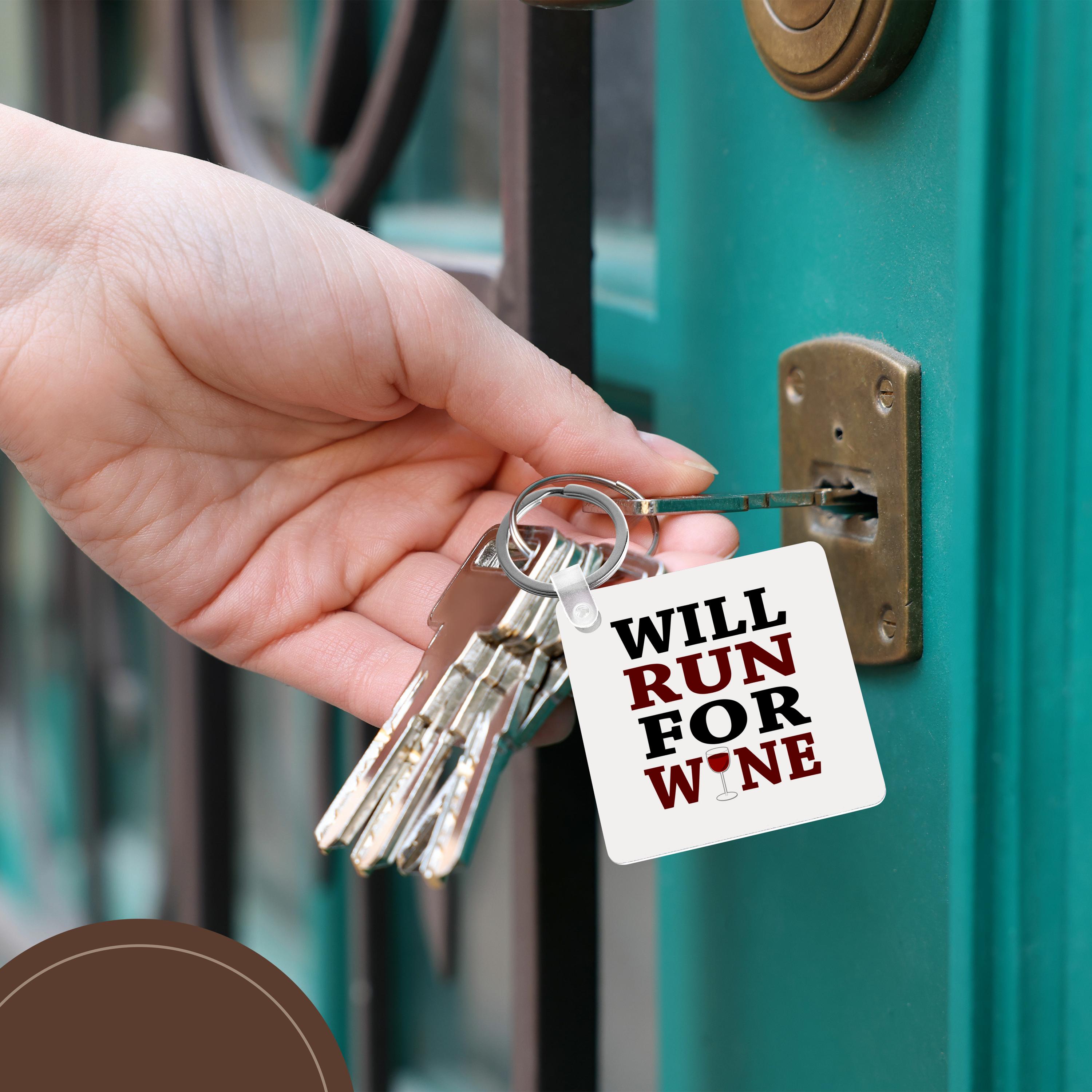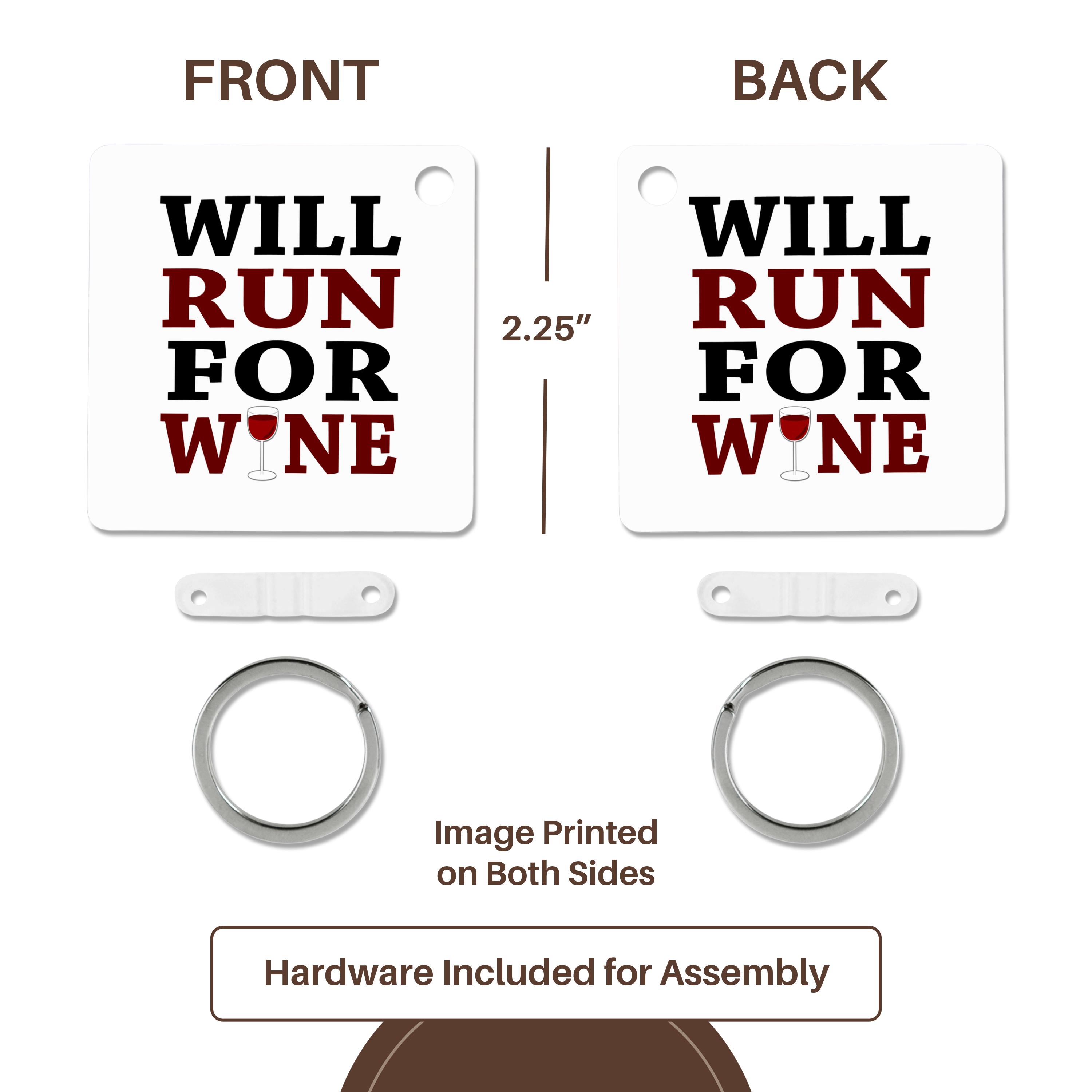 Wine Run For Wine - Red Key Chain is available in sets of 2, 4 and 6; making them perfect for sharing. Image is printed on both sides and has a high gloss finish. Measures 2 3/8" x 2 3/8" x 3/8" and are made of heavy duty durable plastic. Rings and plastic clips included.