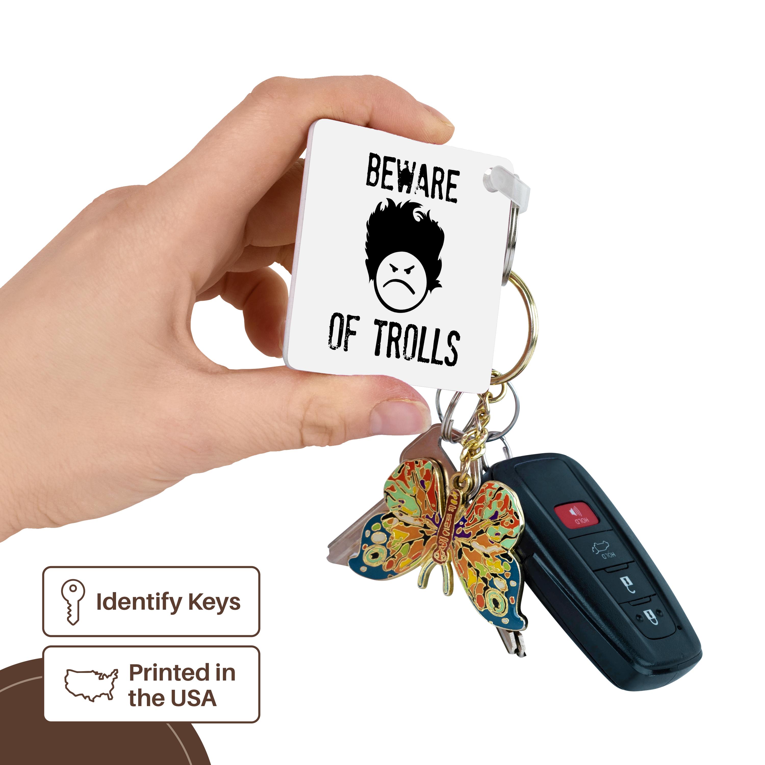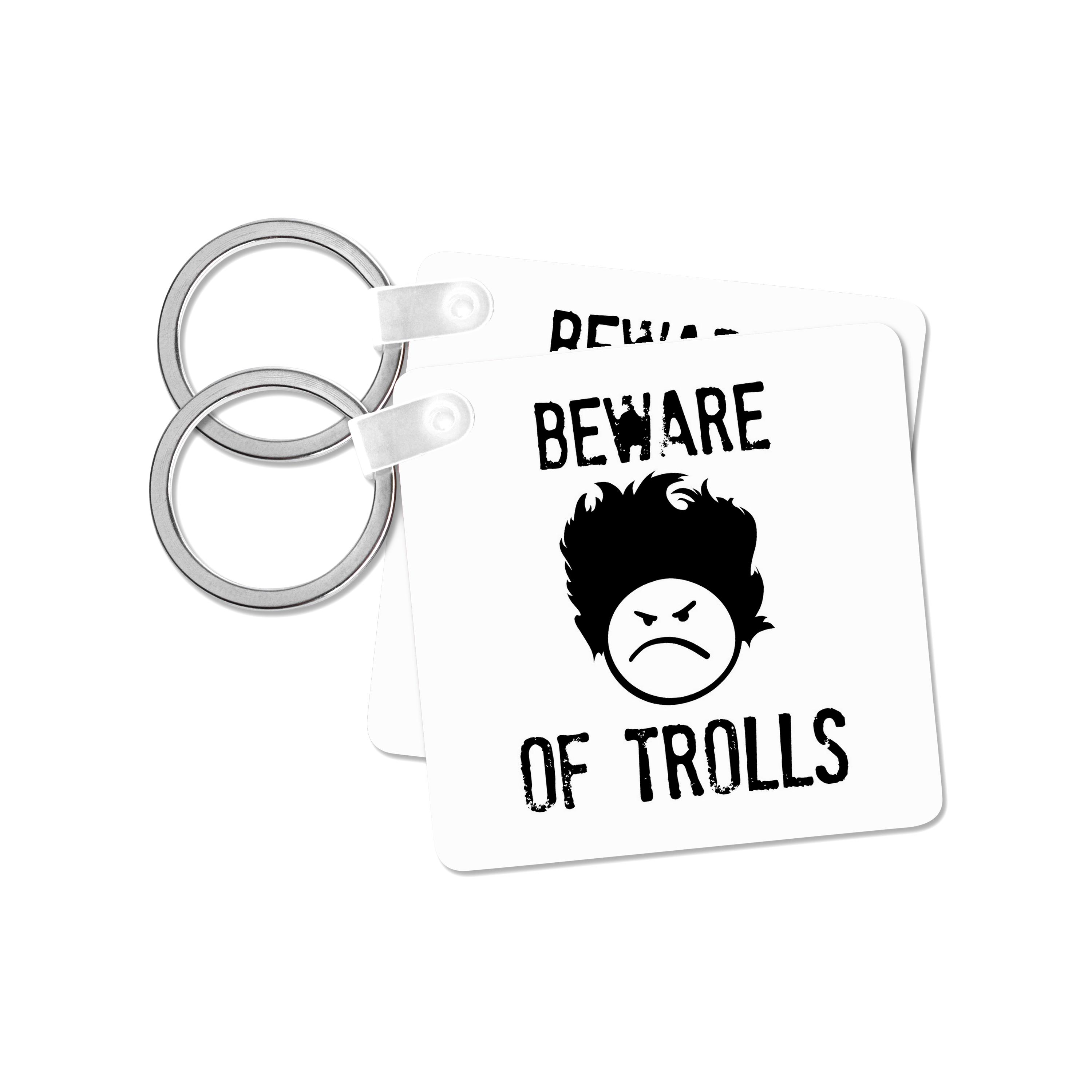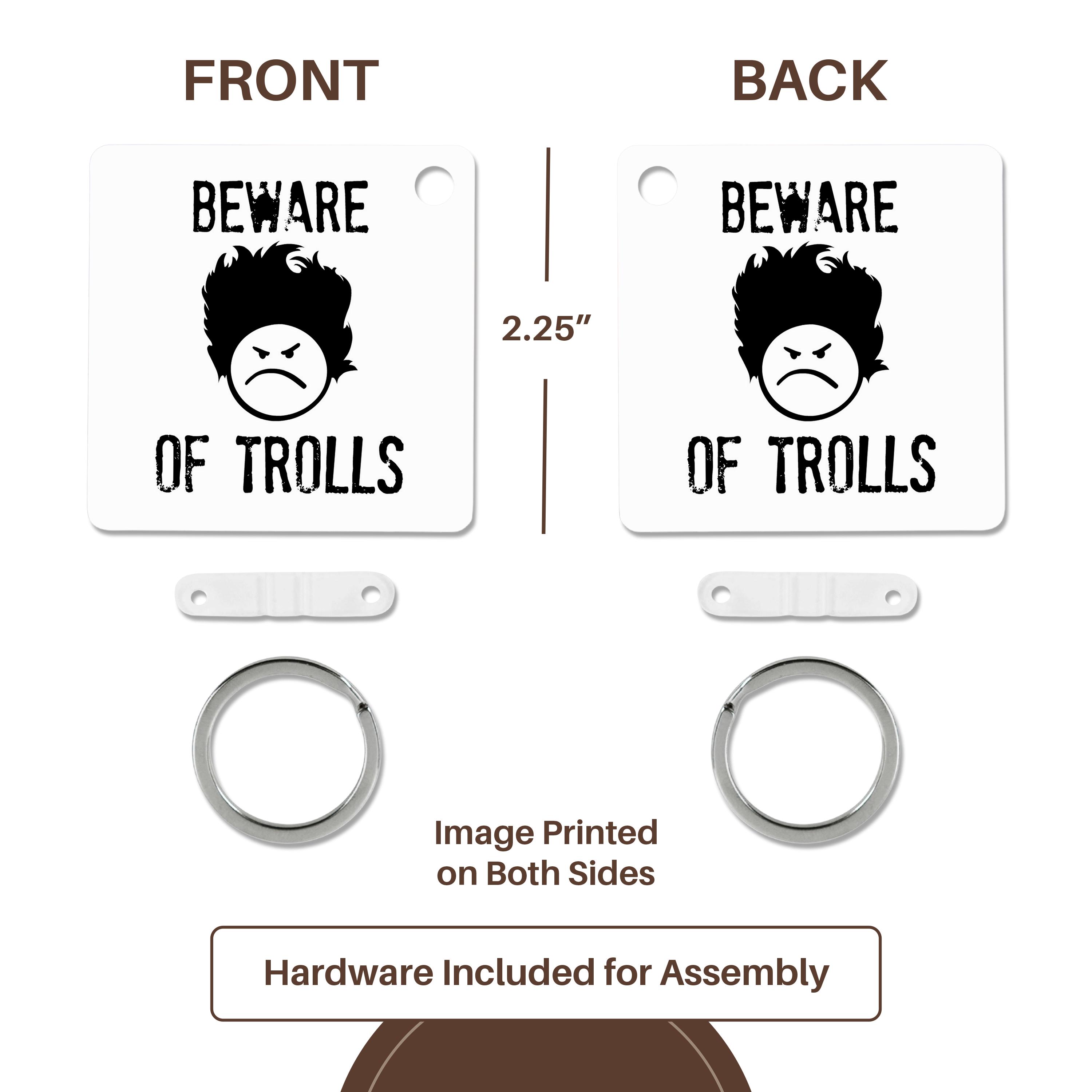Image of Beware of Trolls Key Chain is available in sets of 2, 4 and 6; making them perfect for sharing. Image is printed on both sides and has a high gloss finish. Measures 2 3/8" x 2 3/8" x 3/8" and are made of heavy duty durable plastic. Rings and plastic clips included.