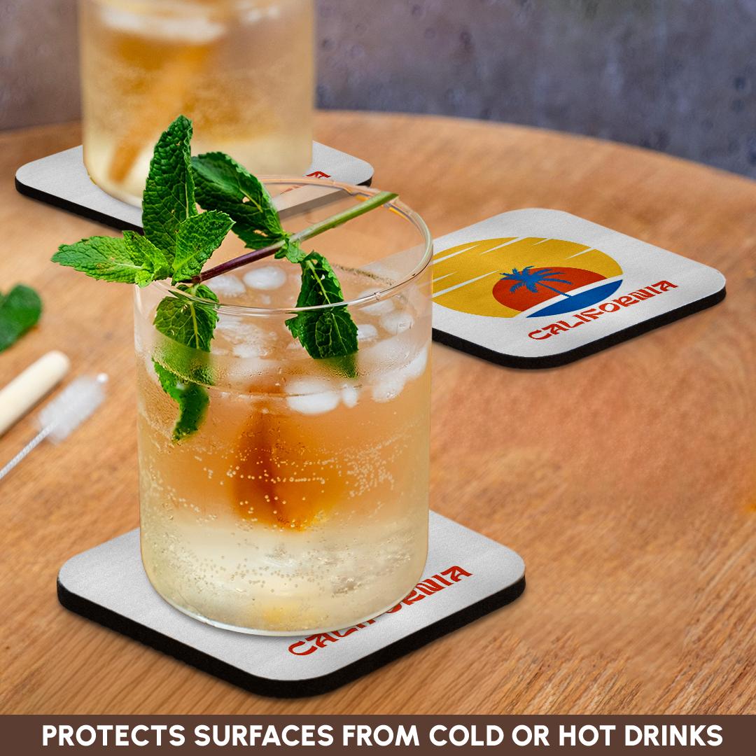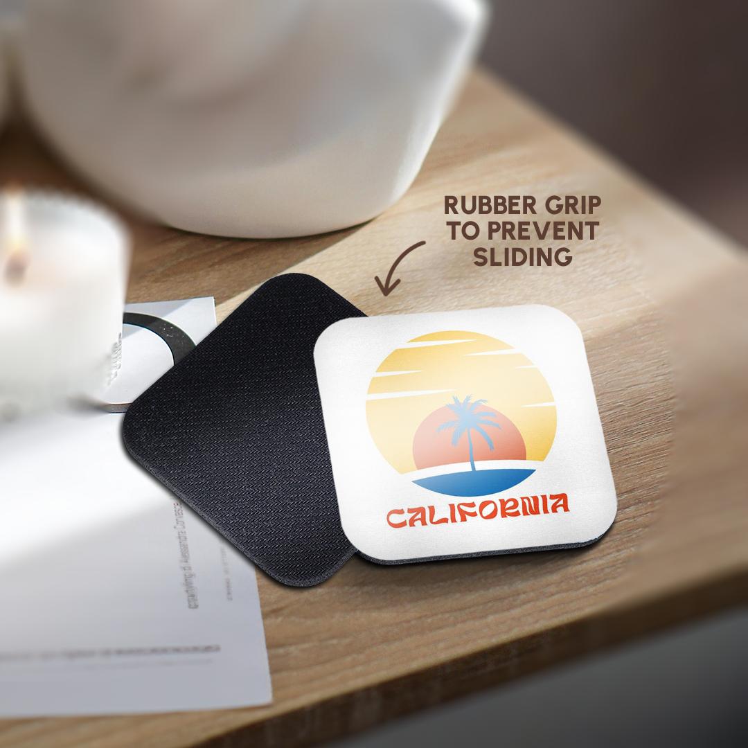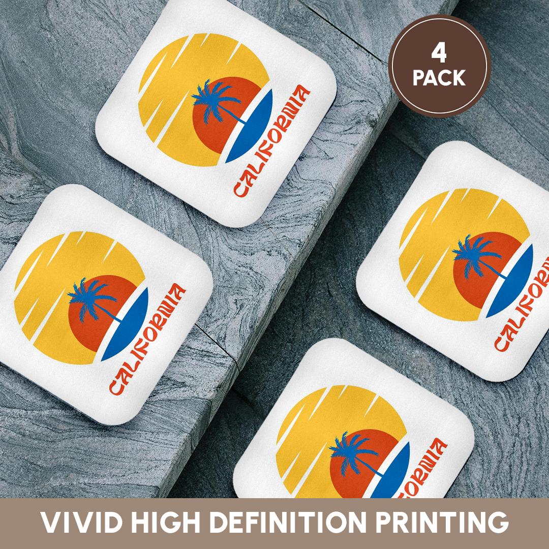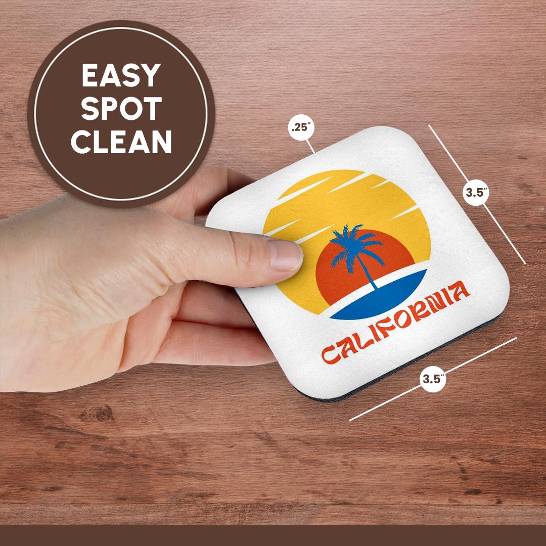 California Summer Vibes Coaster is a great complement to any home décor. Soft coasters are 3.5" x 3.5", are absorbent, and can be washed. Ceramic coasters are 4.25" x 4.25", non absorbent and come with felt corner pads. Available in sets of 4 and 8.