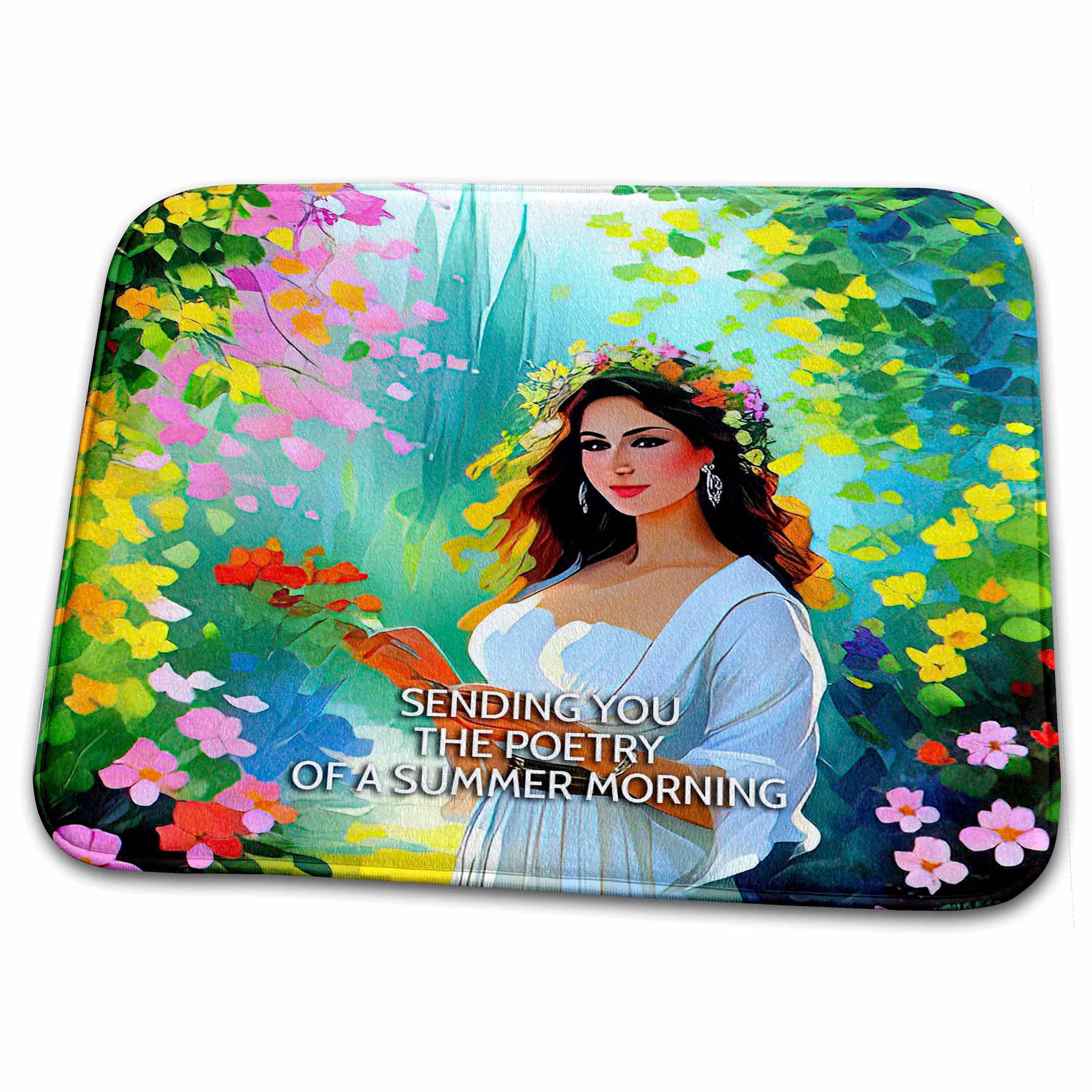 Sending you the poetry of a summer morning. Woman in the garden card Dish Drying Mat is a high quality dish drying mat, 23" x 18" with 0.125" thickness. Printed with exquisite sublimated designs. Versatile for all types of countertops. Optimized for comfort and durability. Made of soft polyester.