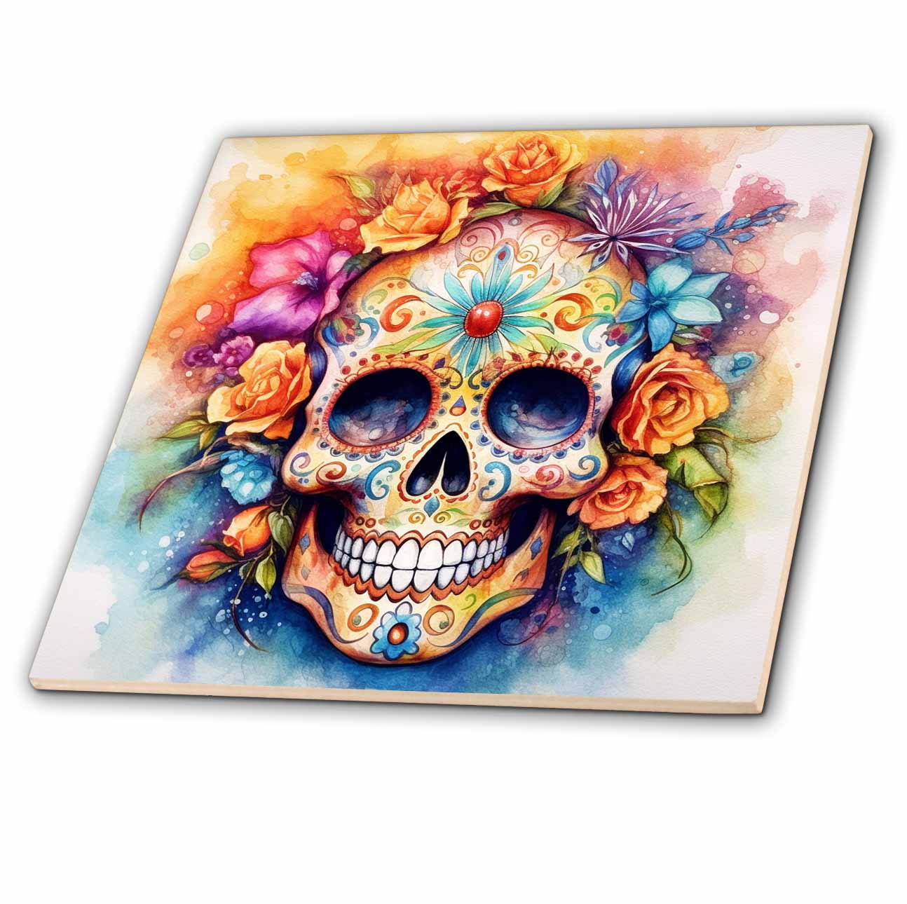3dRose Anne Marie Baugh - Illustrations - Floral Sugar Skull Illustration - Tiles (ct-384106)