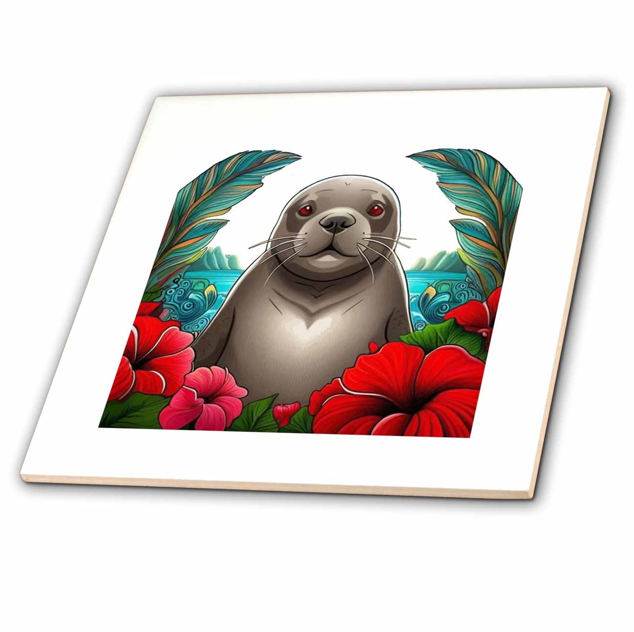 3dRose Cartoon Tattoo Art of Hawaiian Monk Seal with Hibiscus - Tiles (ct-384049)