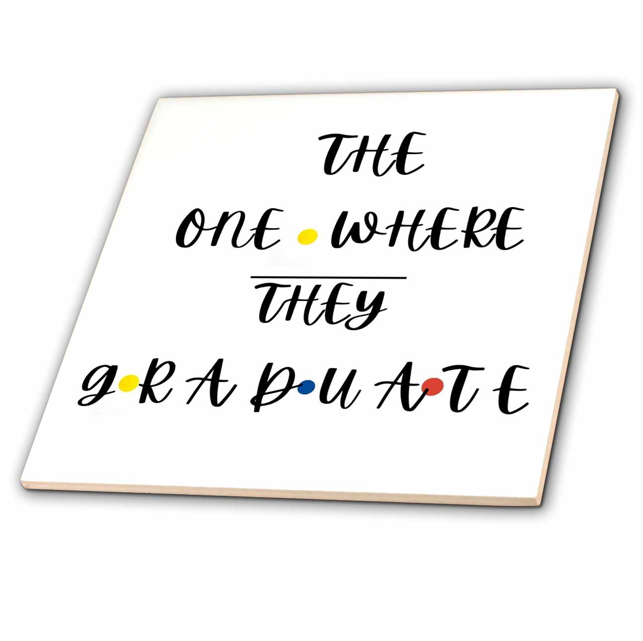 Image with a text the one where they graduate Tile is great for a backsplash, countertop or as an accent. This commercial quality construction grade tile has a high gloss finish. The image is applied to the top surface and can be cleaned with a mild detergent.