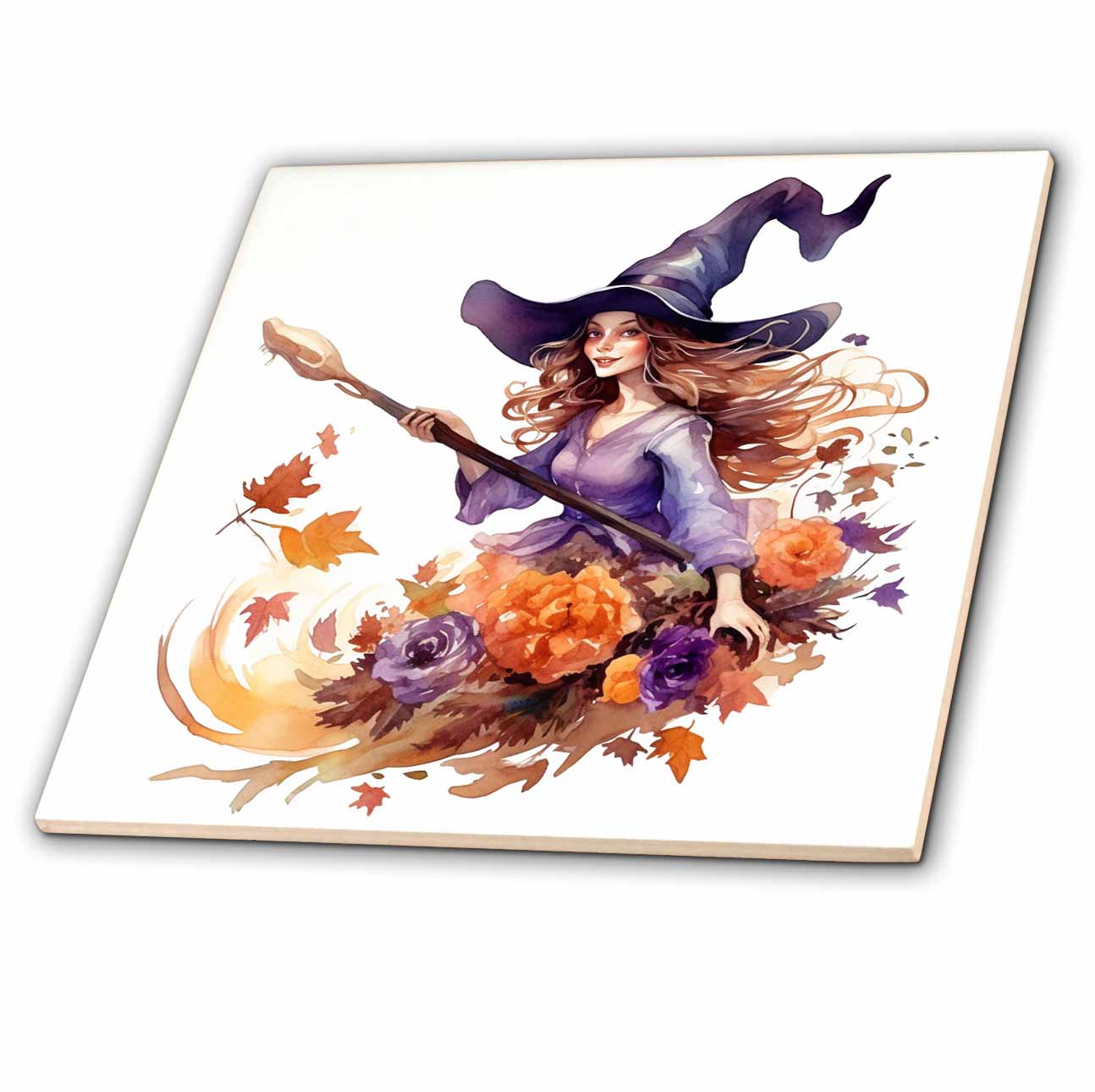 Pretty Floral Witch and Her Broom Illustration Tile is great for a backsplash, countertop or as an accent. This commercial quality construction grade tile has a high gloss finish. The image is applied to the top surface and can be cleaned with a mild detergent.