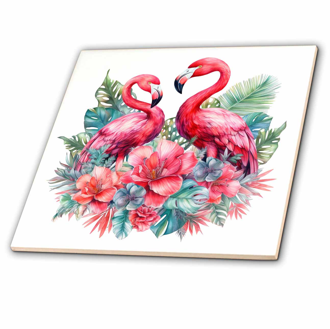 3dRose Two Pink Flamingos in A Tropical Floral Illustration - Tiles (ct-384171)