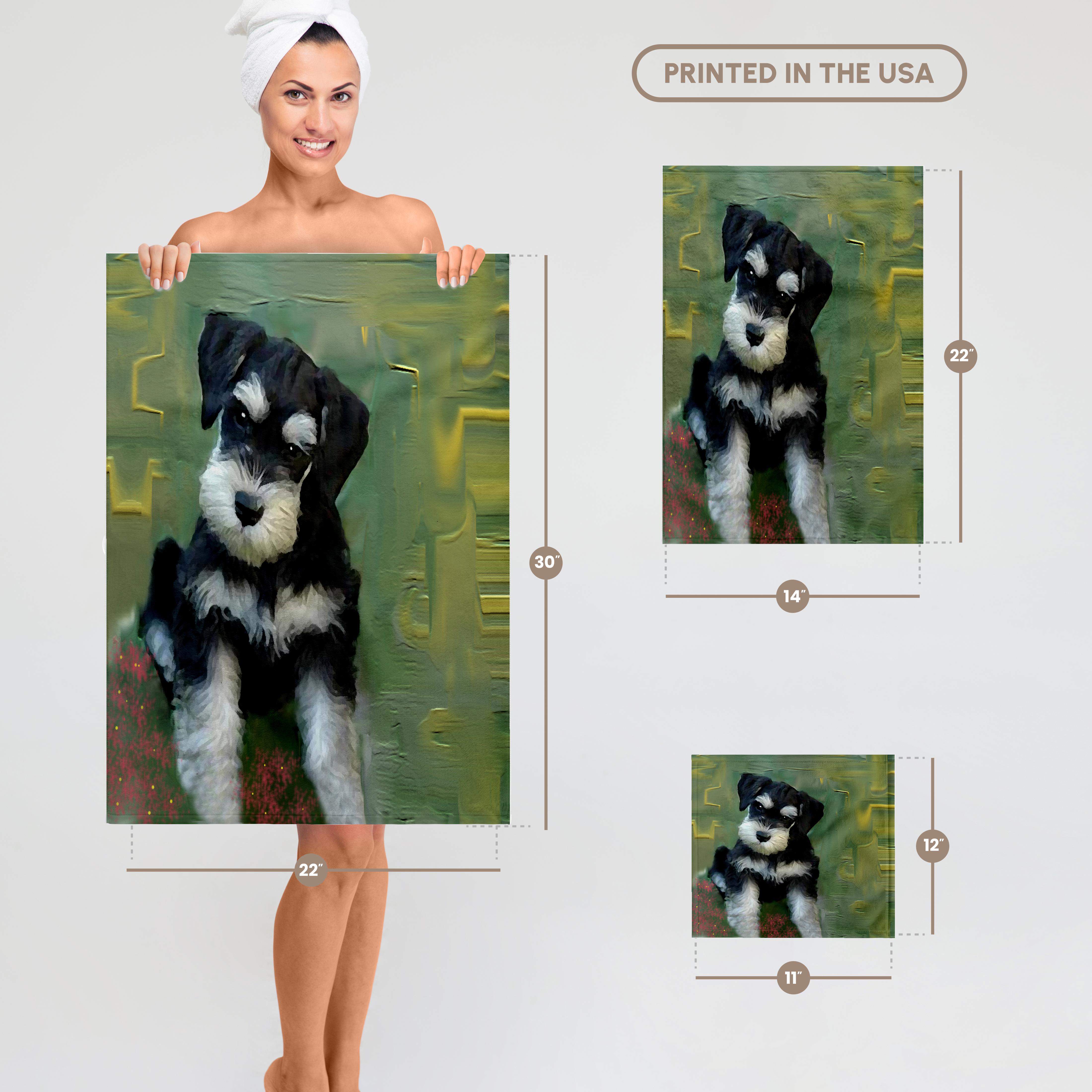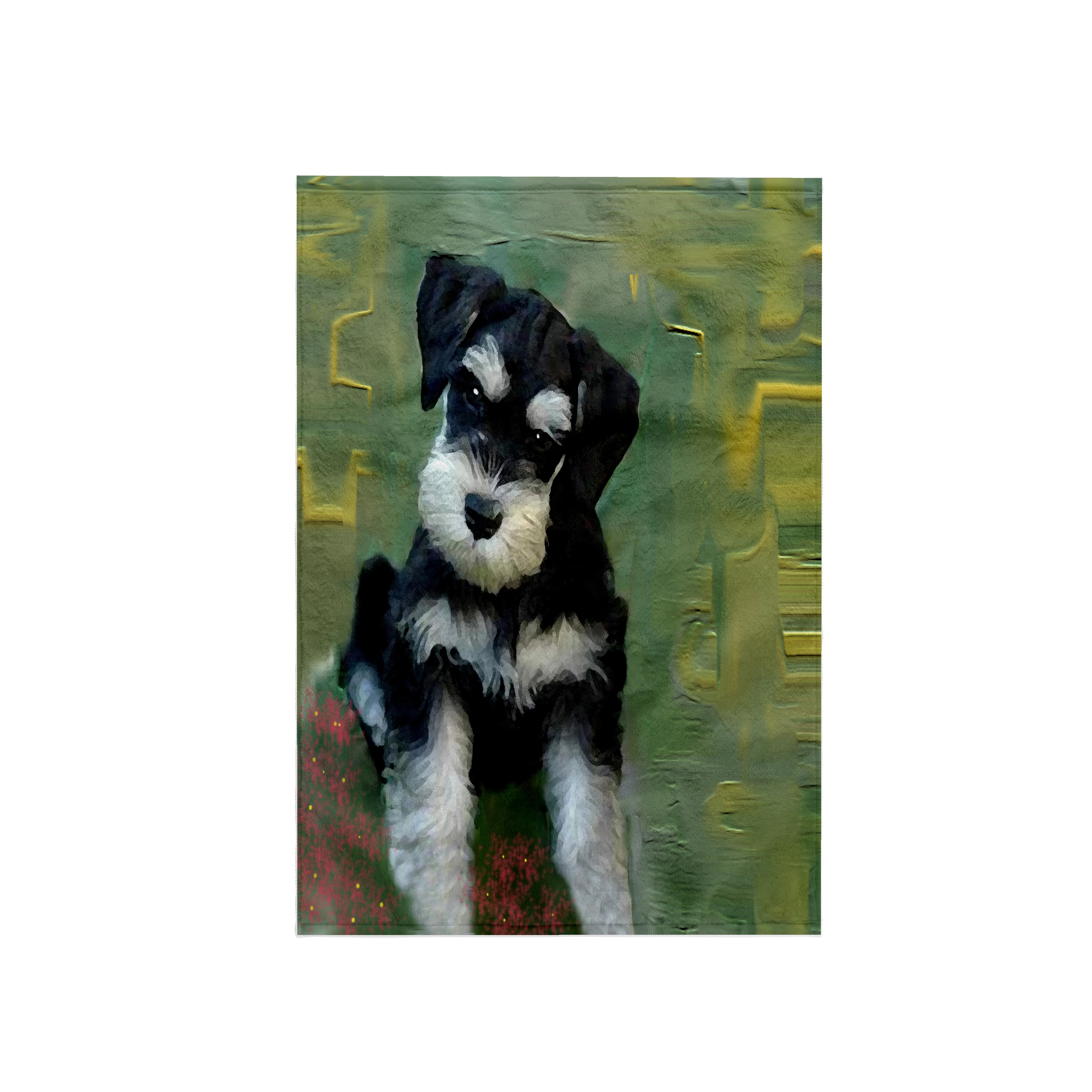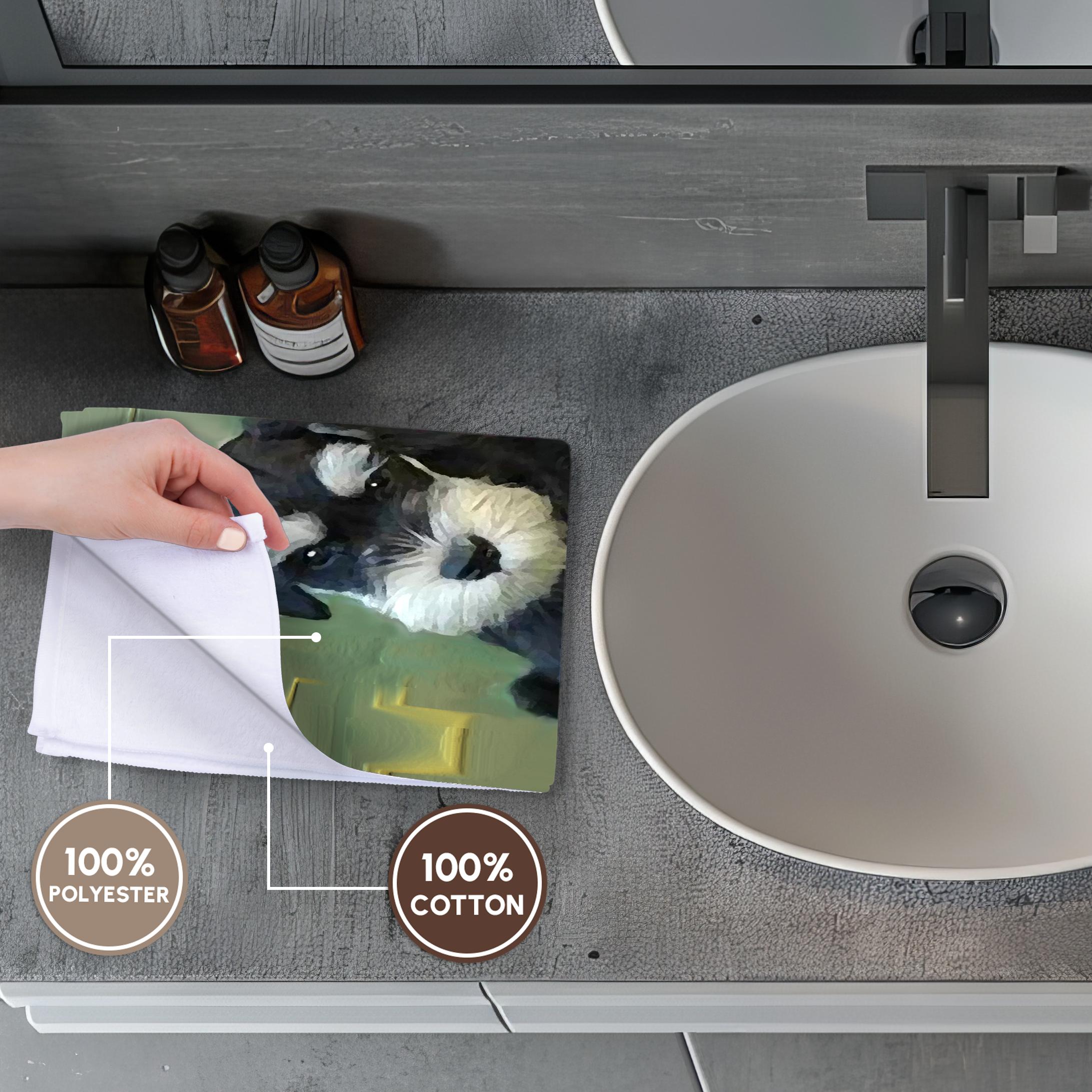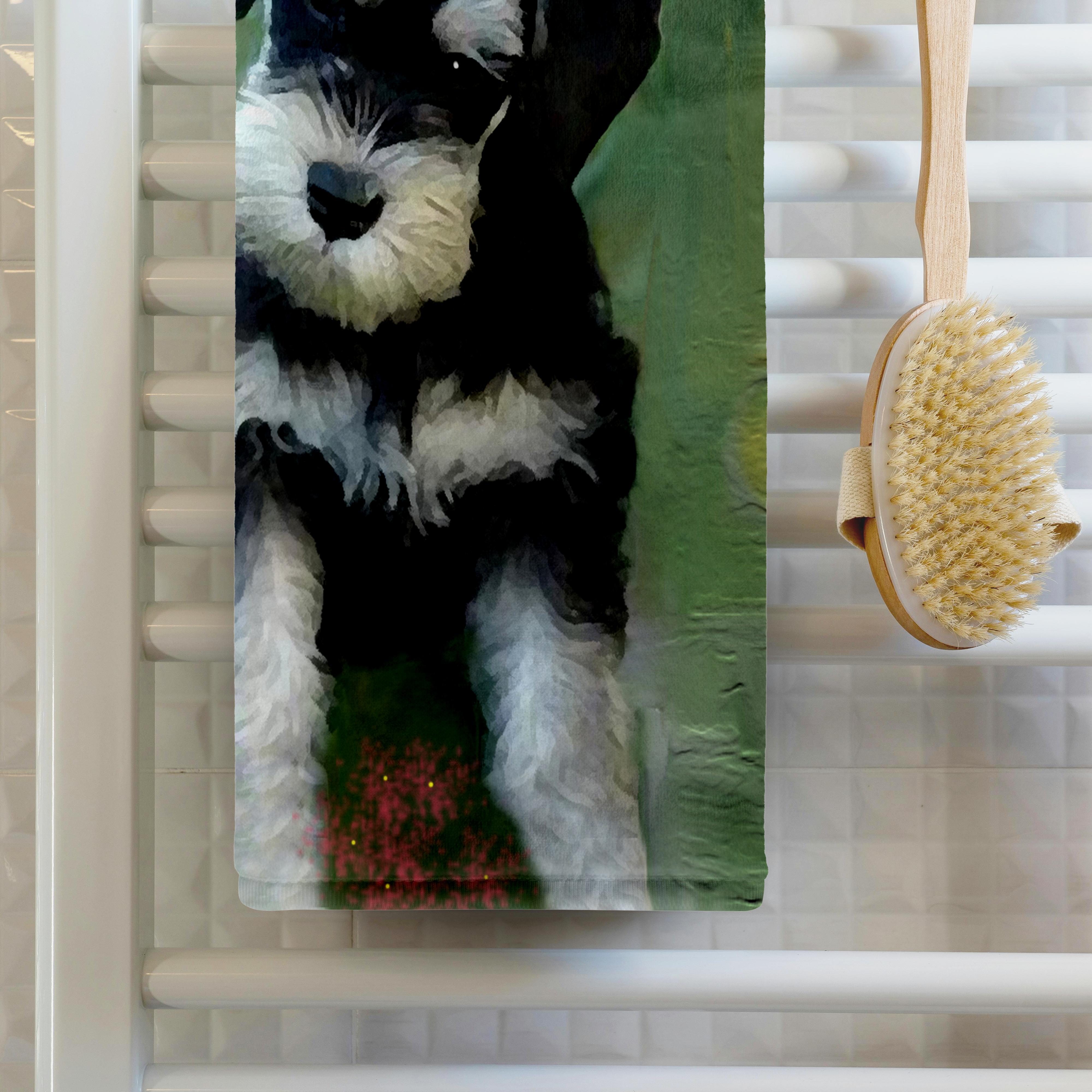 Miniature Schnauzer Towel is great to use in the kitchen, bathroom or gym. This 15 by 22 inch, hand/sports towel allows you to customize your room with a special design or color. Great for drying dishes, hands and faces. Suitable to put in any sports bag. Image will not fade after washing. Machine wash, tumble dry low, do not bleach. Towel will regain its fullness after the first washing. Made of: Printed side 100% polyester and reverse side 100% Terrycloth cotton. Image printed on polyester side/ terry cloth side is blank white.