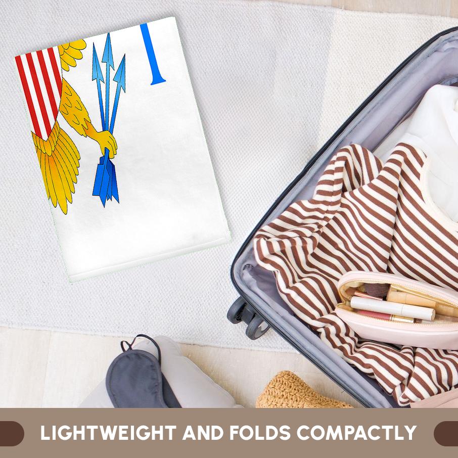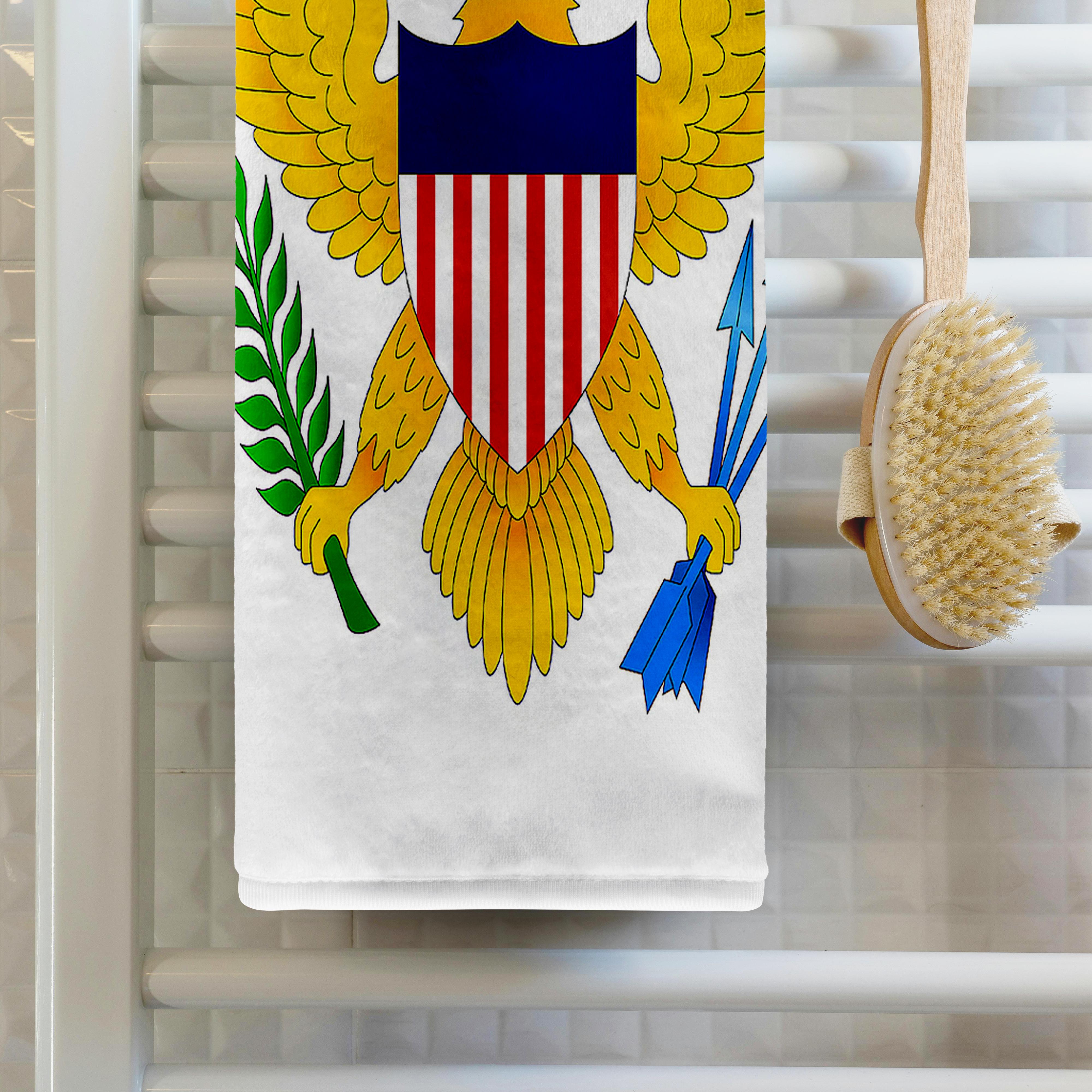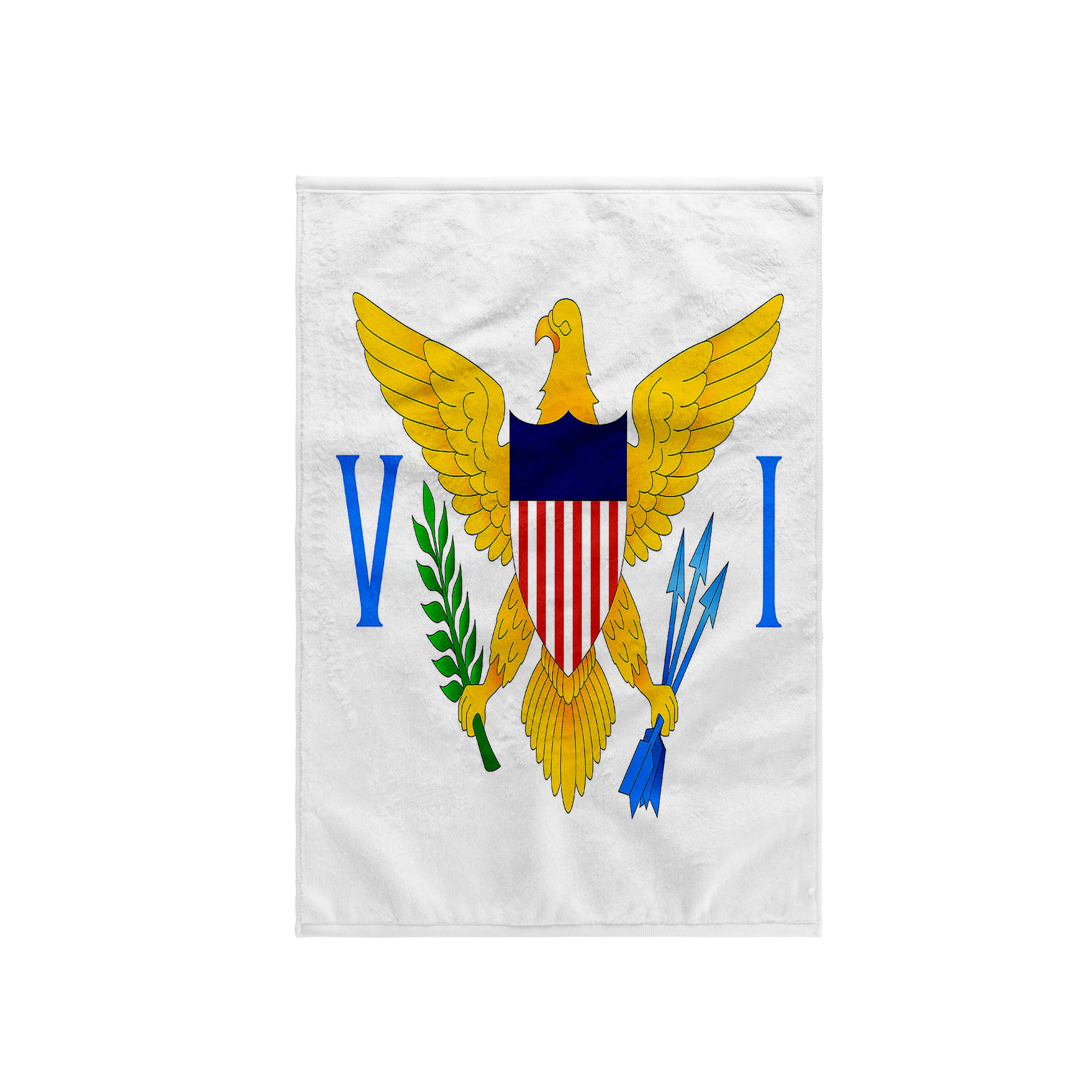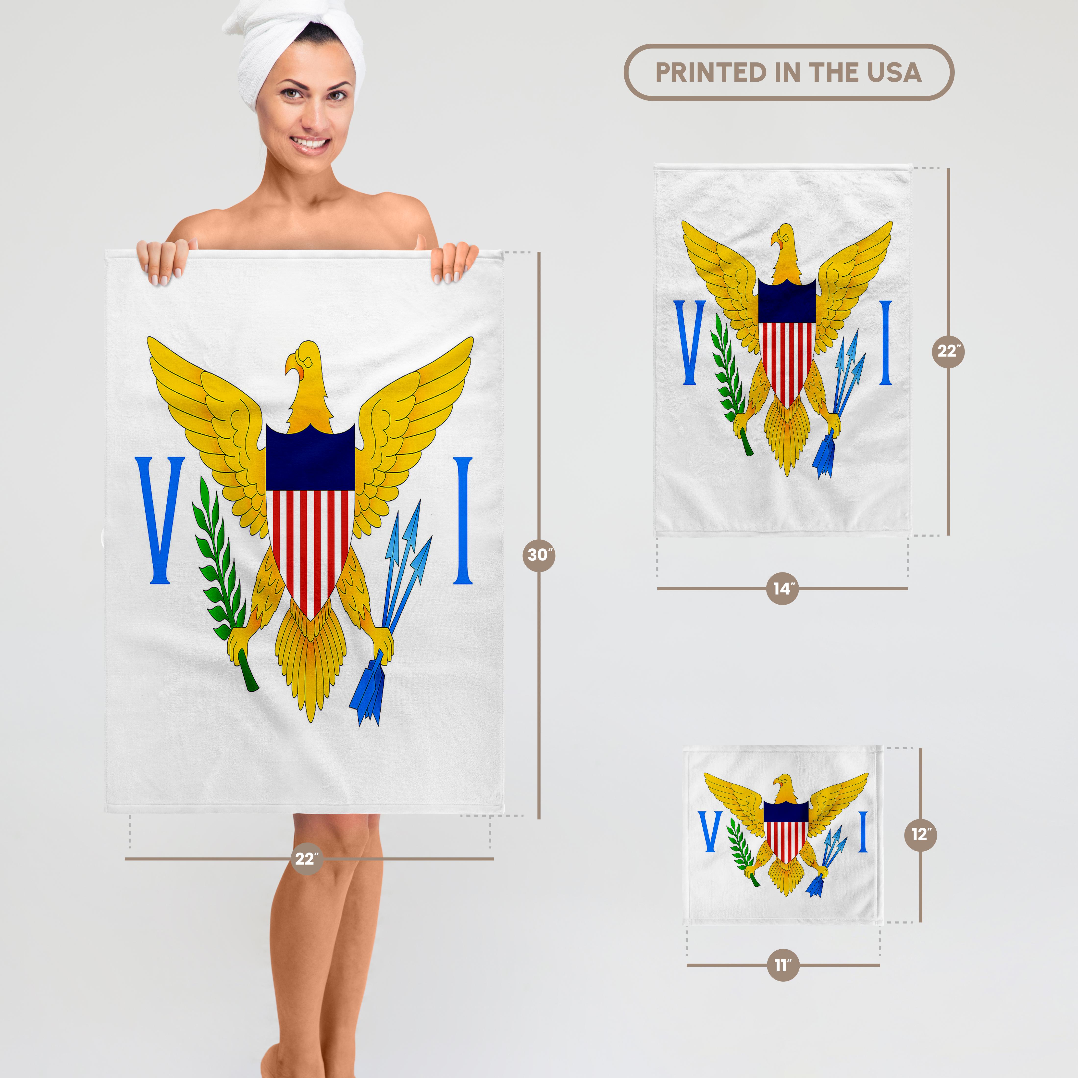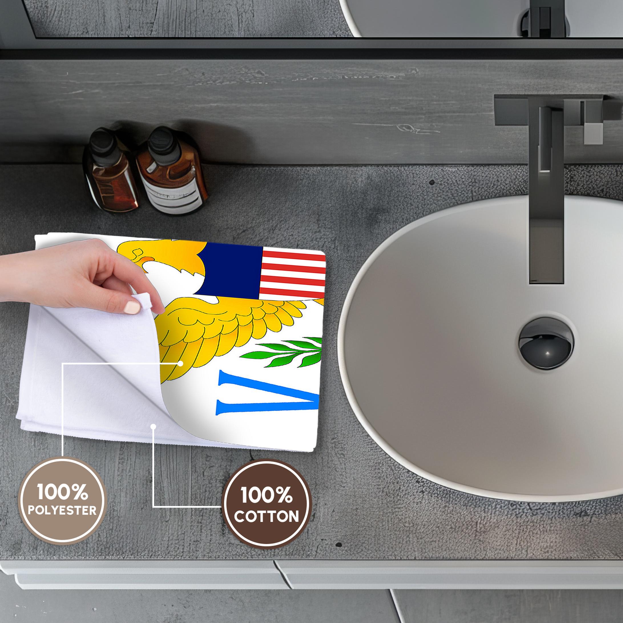 Virgin Islands Flag Towel is great to use in the kitchen, bathroom or gym. This 15 by 22 inch, hand/sports towel allows you to customize your room with a special design or color. Great for drying dishes, hands and faces. Suitable to put in any sports bag. Image will not fade after washing. Machine wash, tumble dry low, do not bleach. Towel will regain its fullness after the first washing. Made of: Printed side 100% polyester and reverse side 100% Terrycloth cotton. Image printed on polyester side/ terry cloth side is blank white.