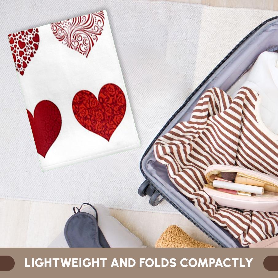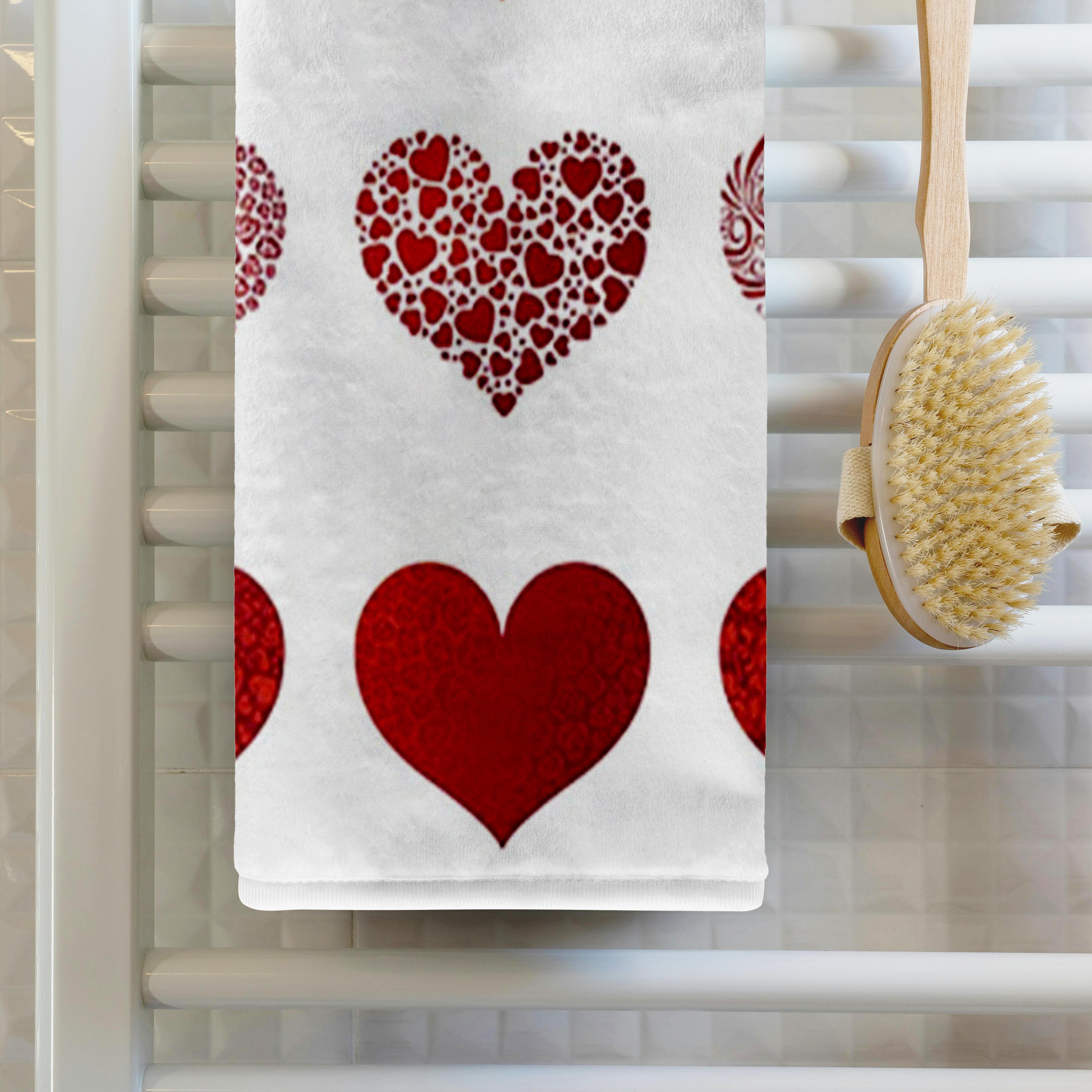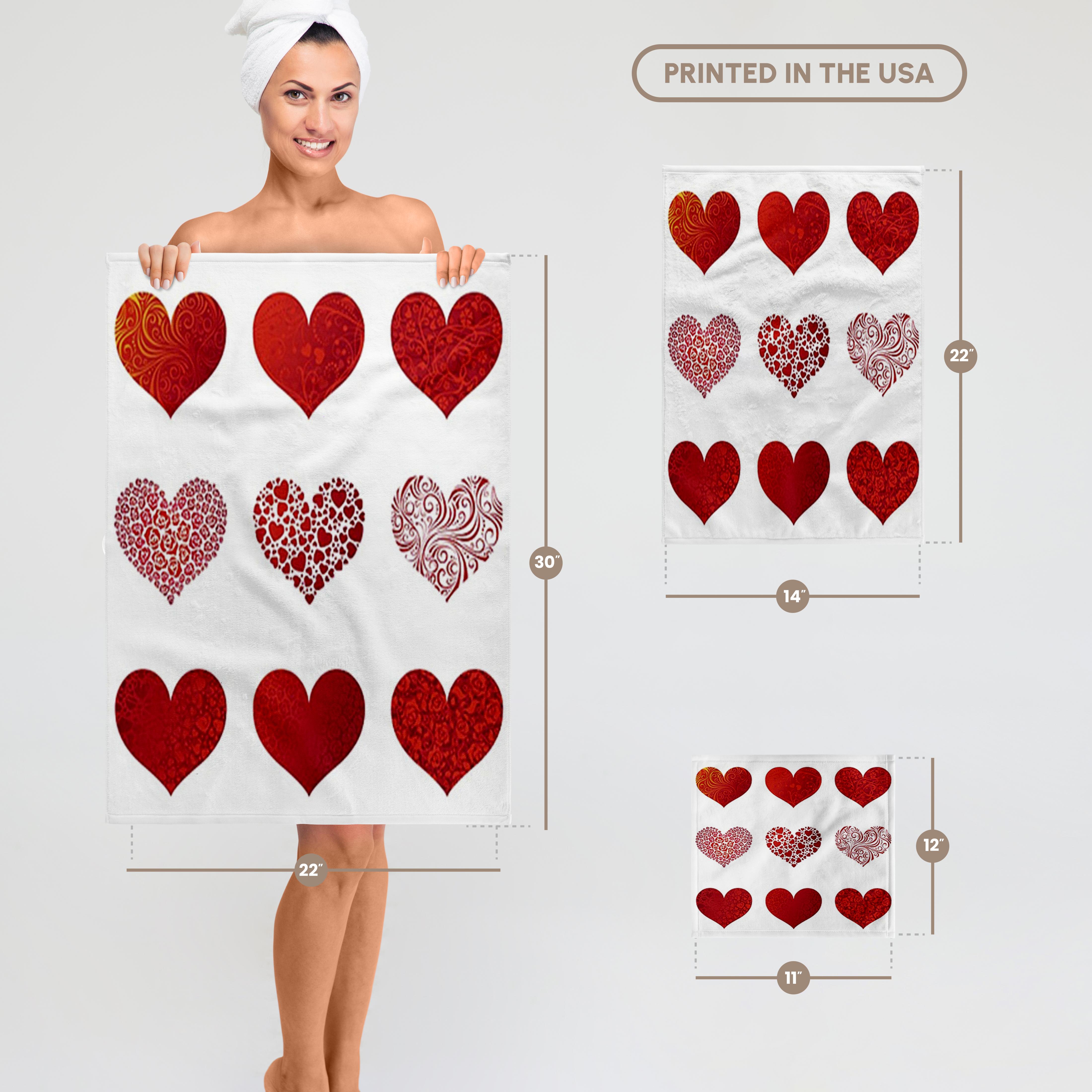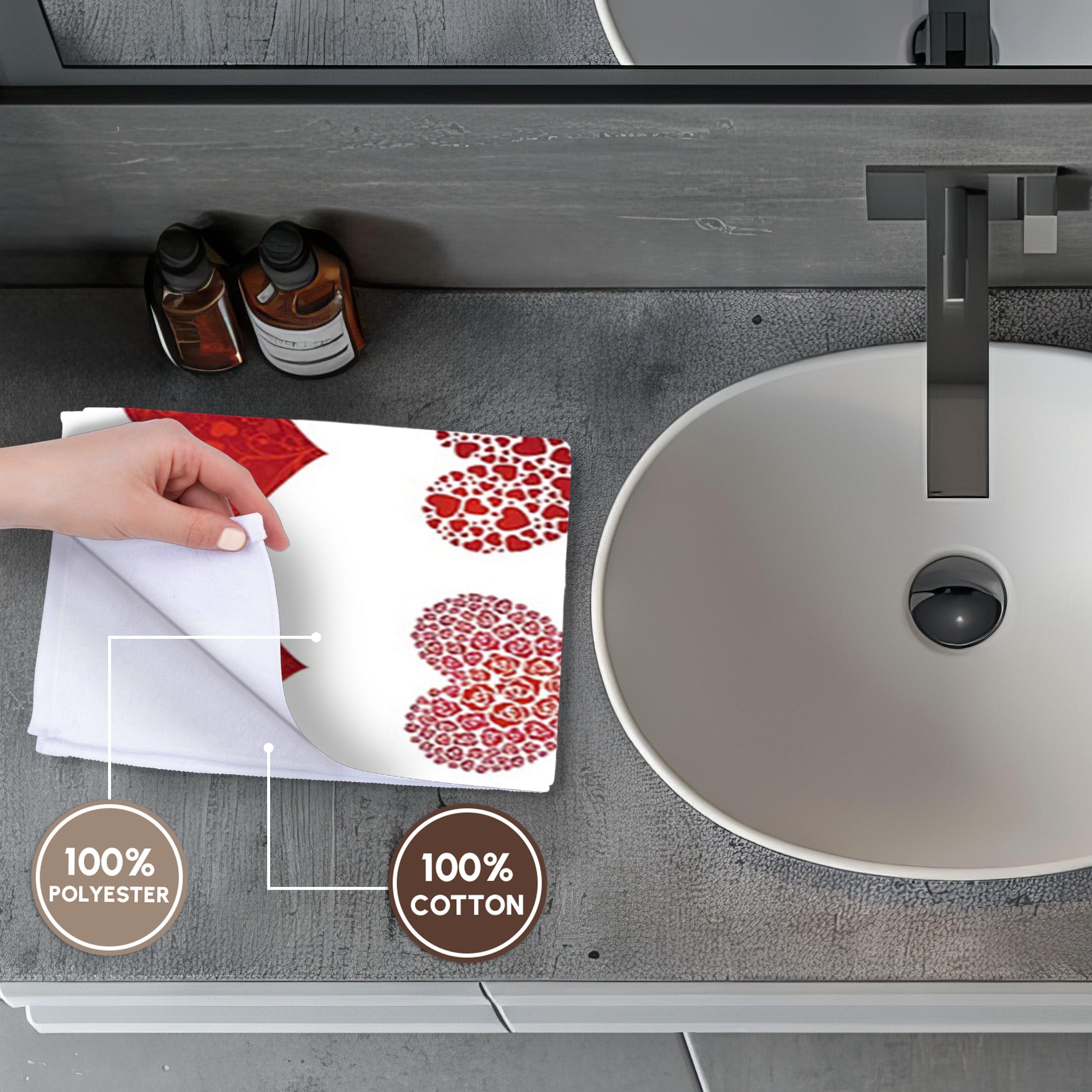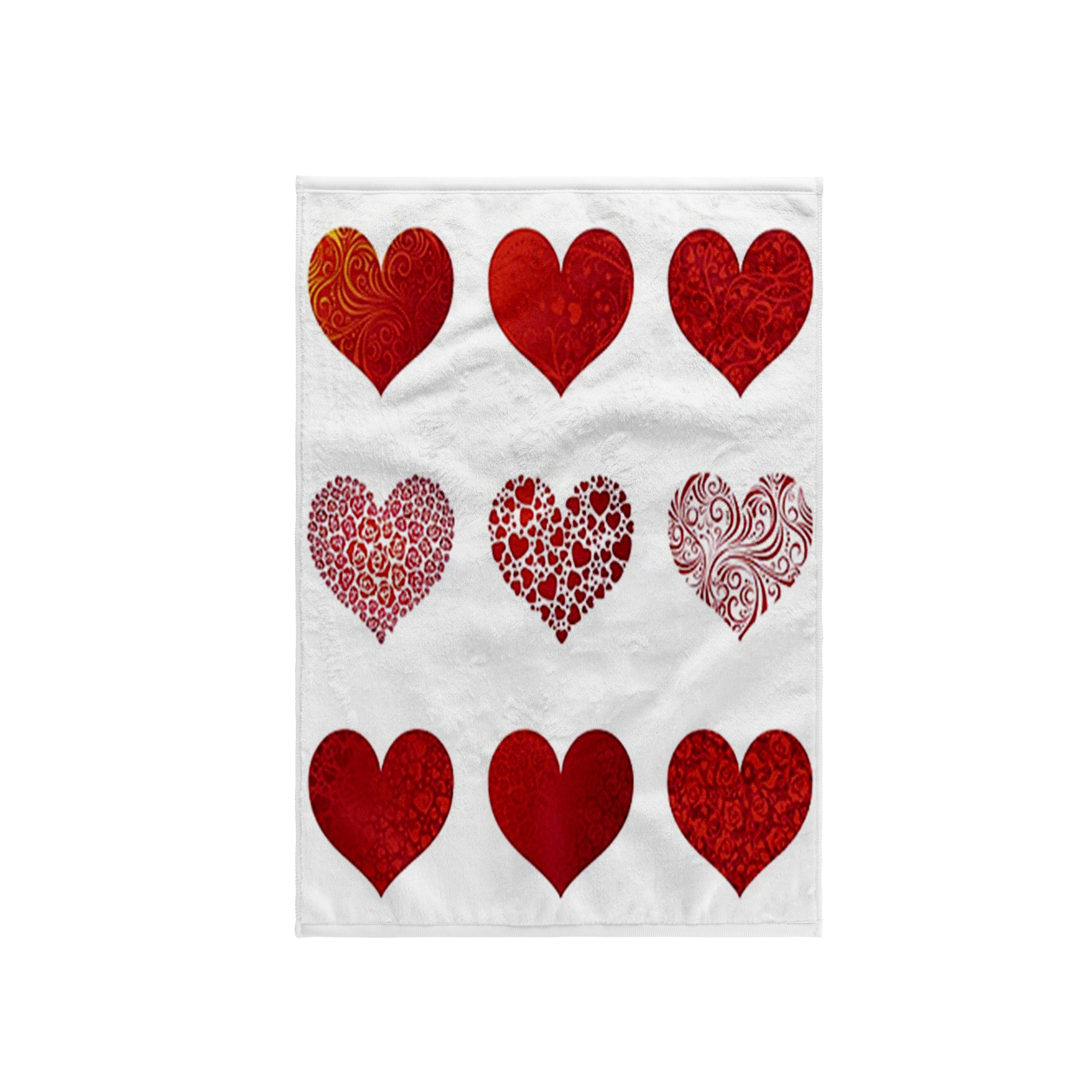 Valentine 9 Red Hearts Towel is great to use in the kitchen, bathroom or gym. This 15 by 22 inch, hand/sports towel allows you to customize your room with a special design or color. Great for drying dishes, hands and faces. Suitable to put in any sports bag. Image will not fade after washing. Machine wash, tumble dry low, do not bleach. Towel will regain its fullness after the first washing. Made of: Printed side 100% polyester and reverse side 100% Terrycloth cotton. Image printed on polyester side/ terry cloth side is blank white.