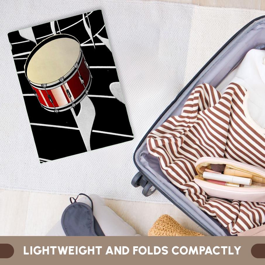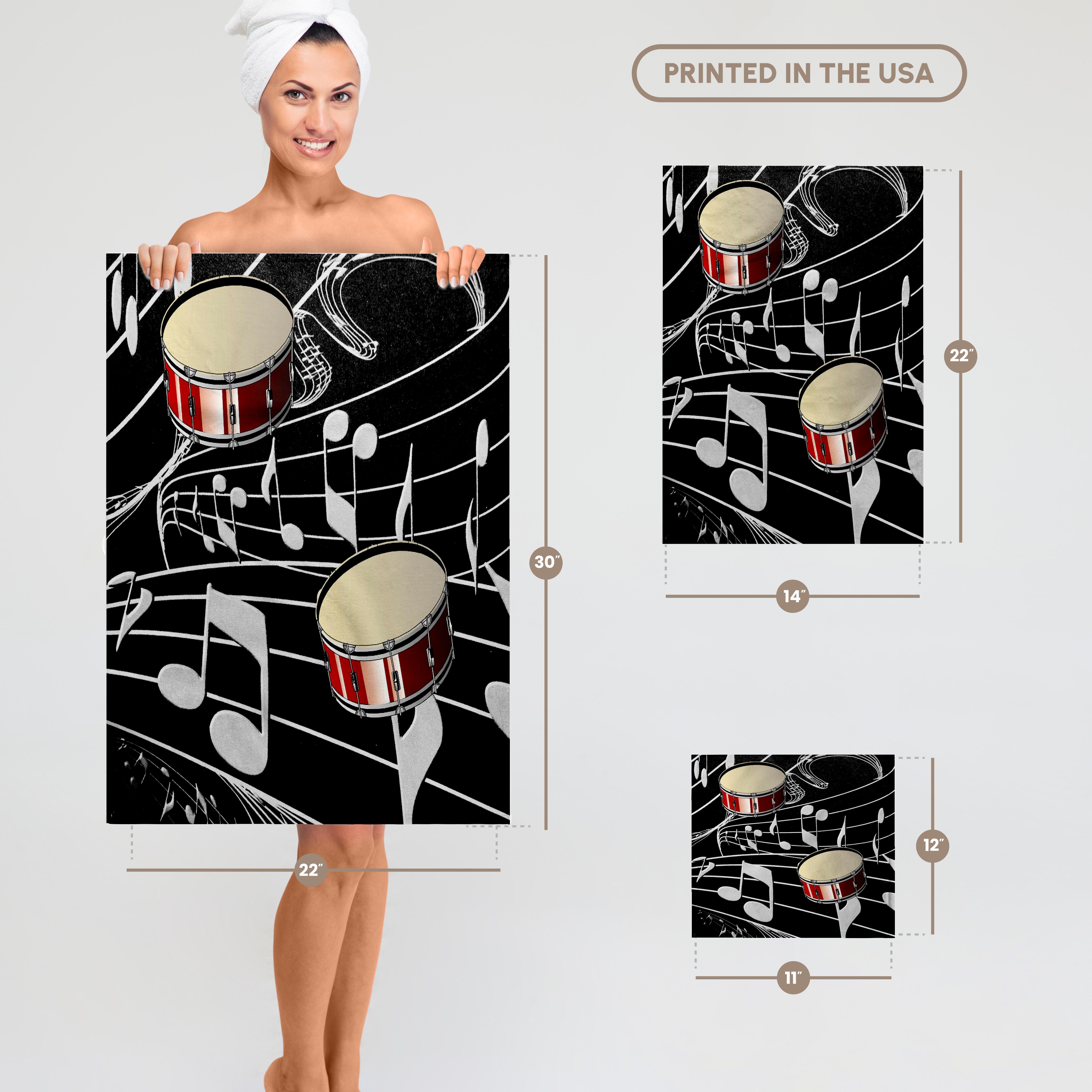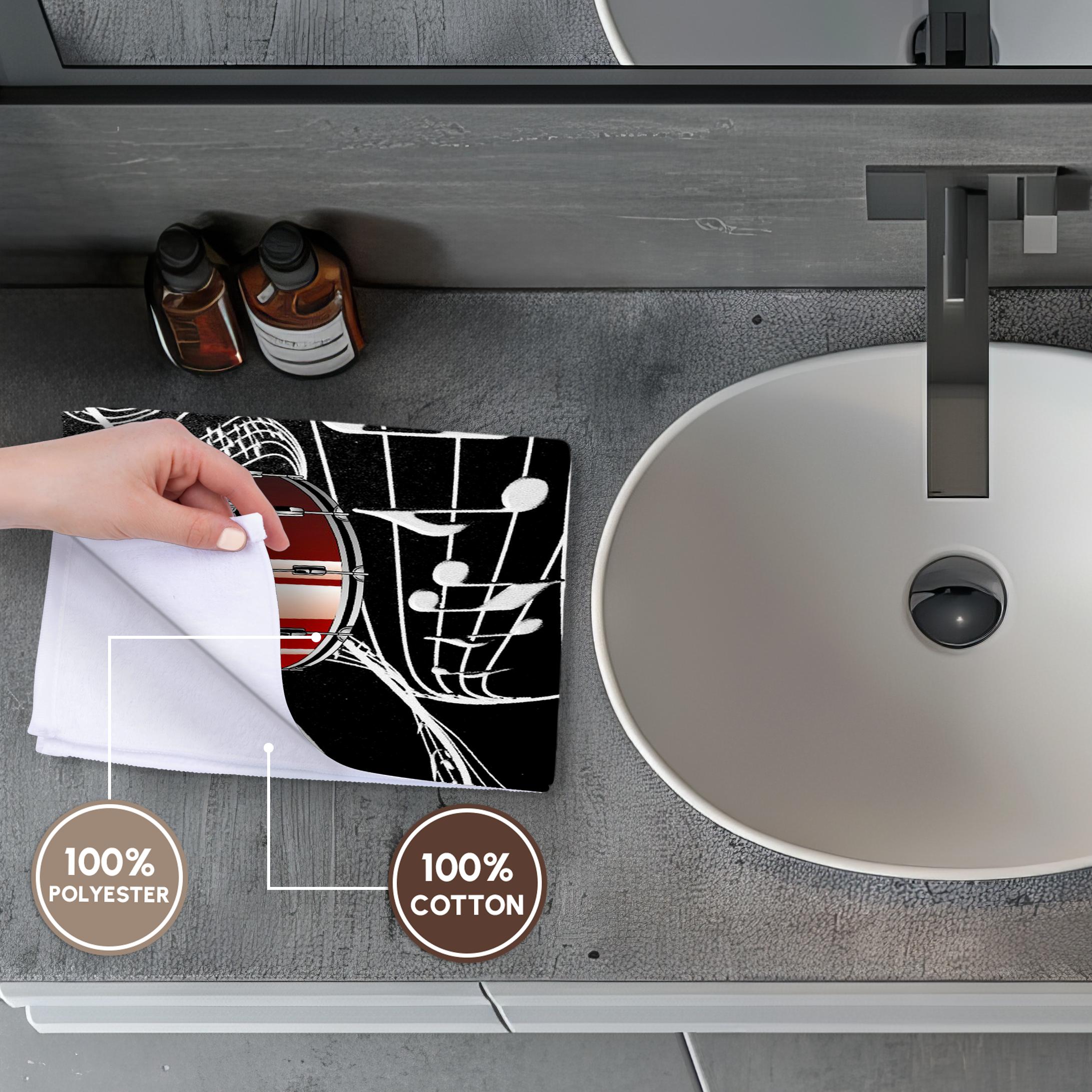 Red Drums On Music Notes Towel is great to use in the kitchen, bathroom or gym. This 15 by 22 inch, hand/sports towel allows you to customize your room with a special design or color. Great for drying dishes, hands and faces. Suitable to put in any sports bag. Image will not fade after washing. Machine wash, tumble dry low, do not bleach. Towel will regain its fullness after the first washing. Made of: Printed side 100% polyester and reverse side 100% Terrycloth cotton. Image printed on polyester side/ terry cloth side is blank white.