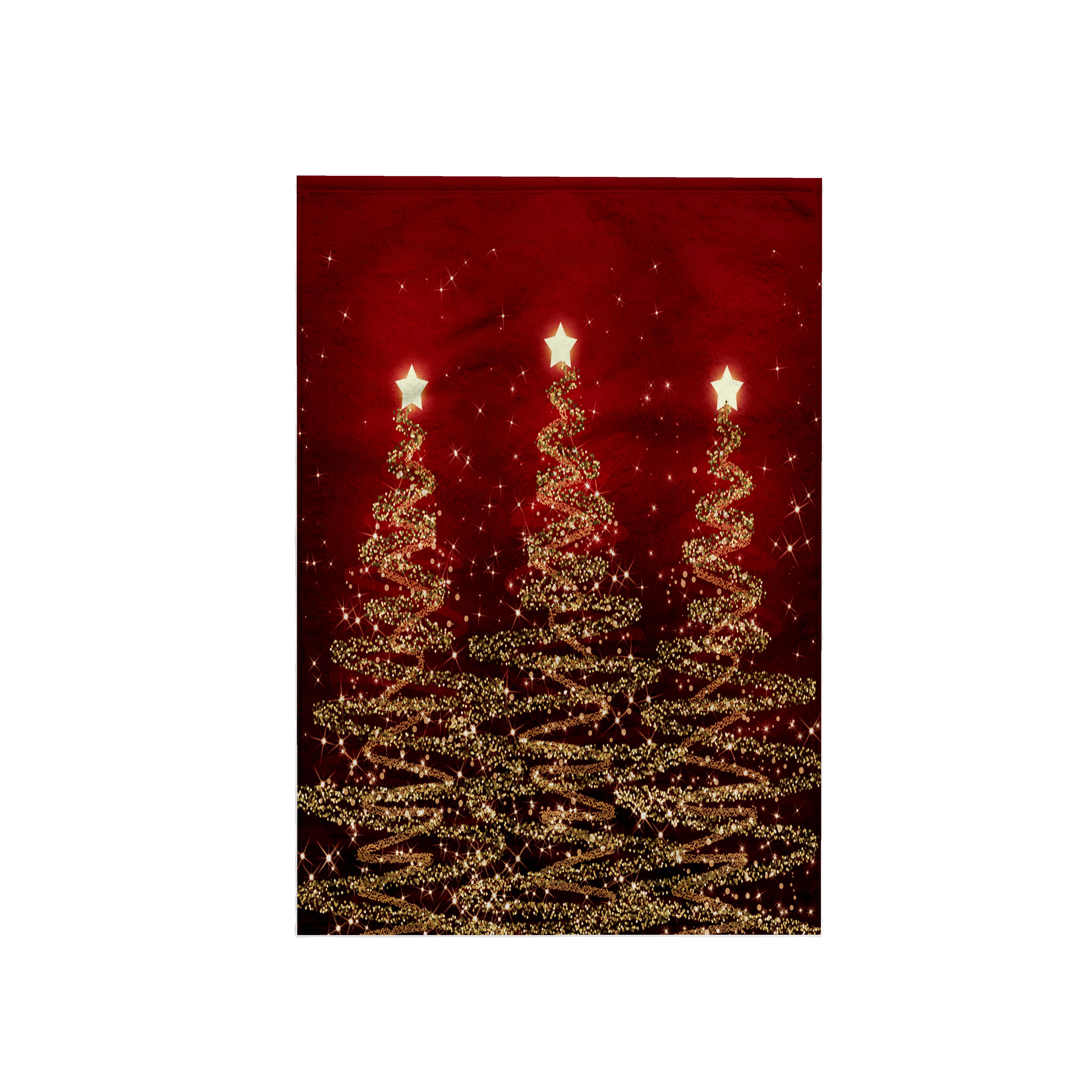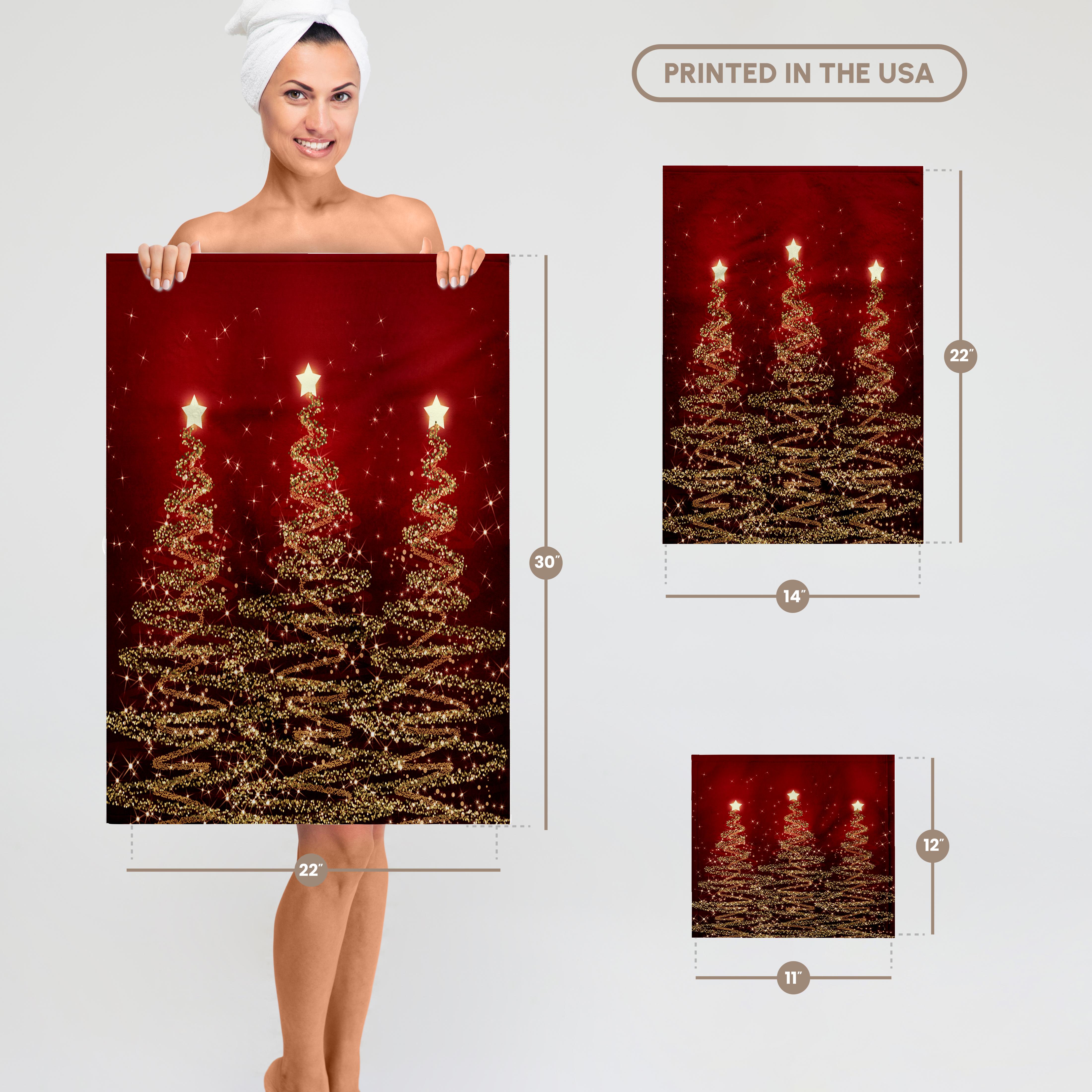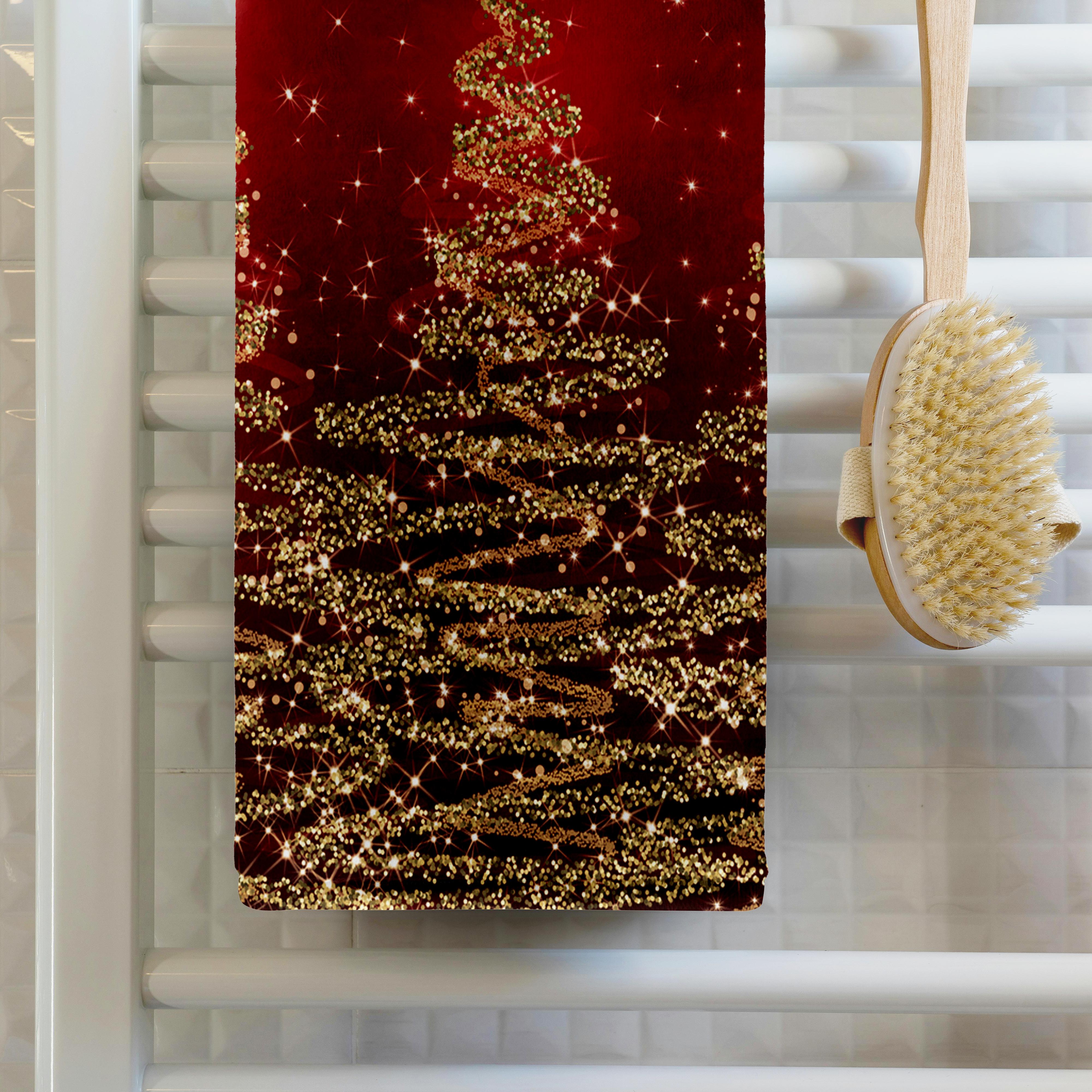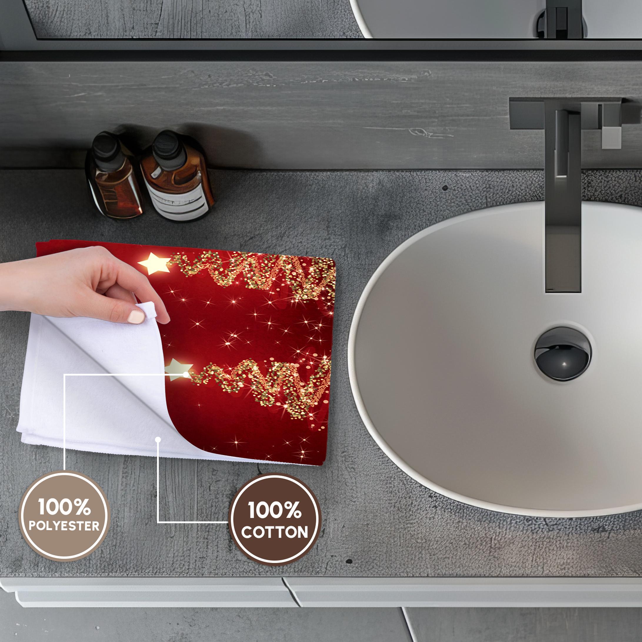 Sparkling Christmas Trees Red Towel is great to use in the kitchen, bathroom or gym. This 15 by 22 inch, hand/sports towel allows you to customize your room with a special design or color. Great for drying dishes, hands and faces. Suitable to put in any sports bag. Image will not fade after washing. Machine wash, tumble dry low, do not bleach. Towel will regain its fullness after the first washing. Made of: Printed side 100% polyester and reverse side 100% Terrycloth cotton. Image printed on polyester side/ terry cloth side is blank white.