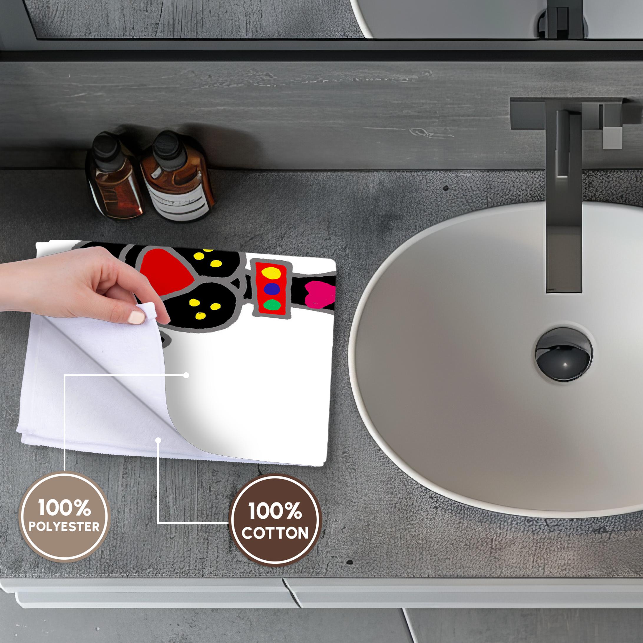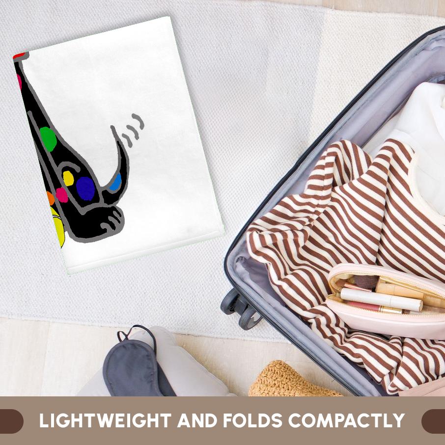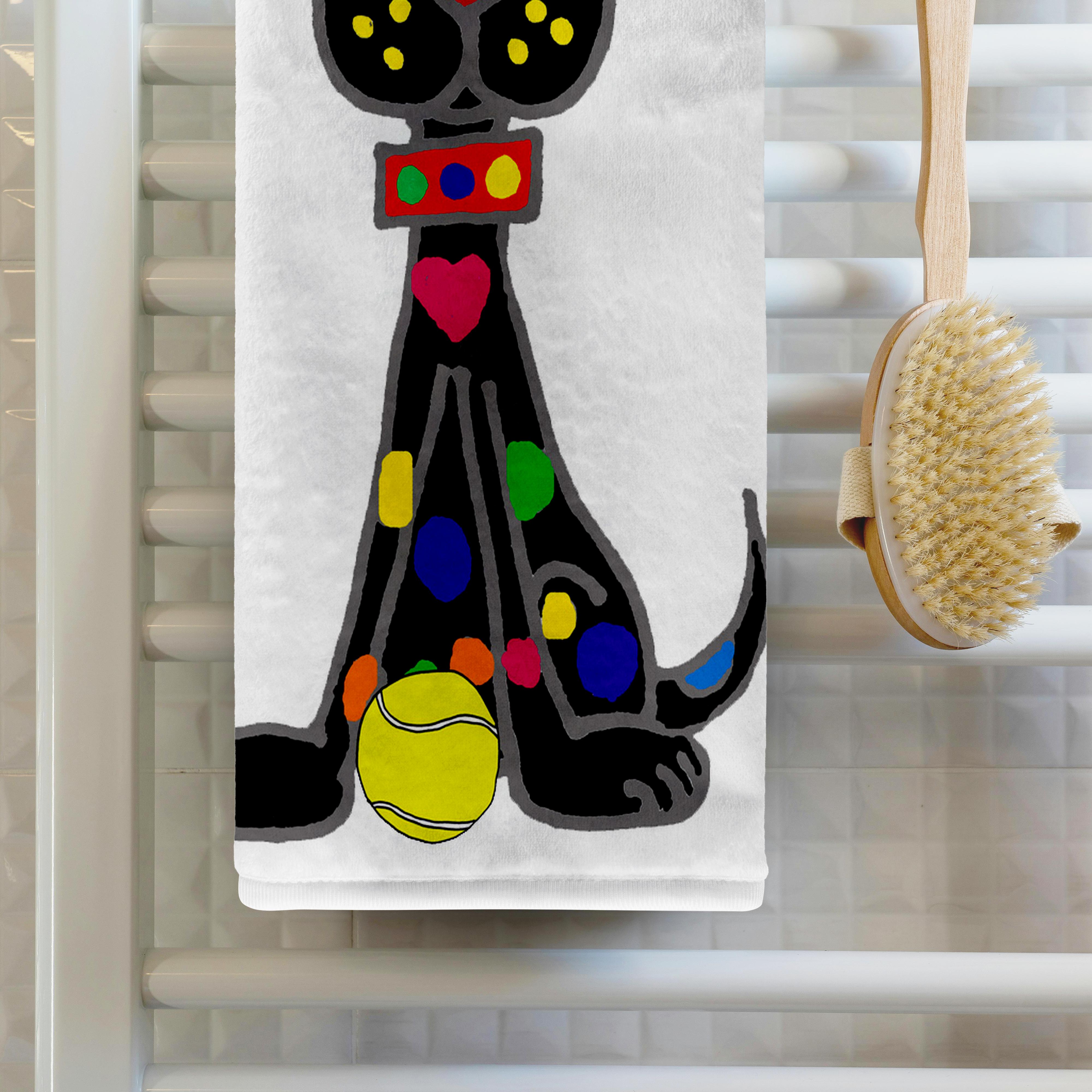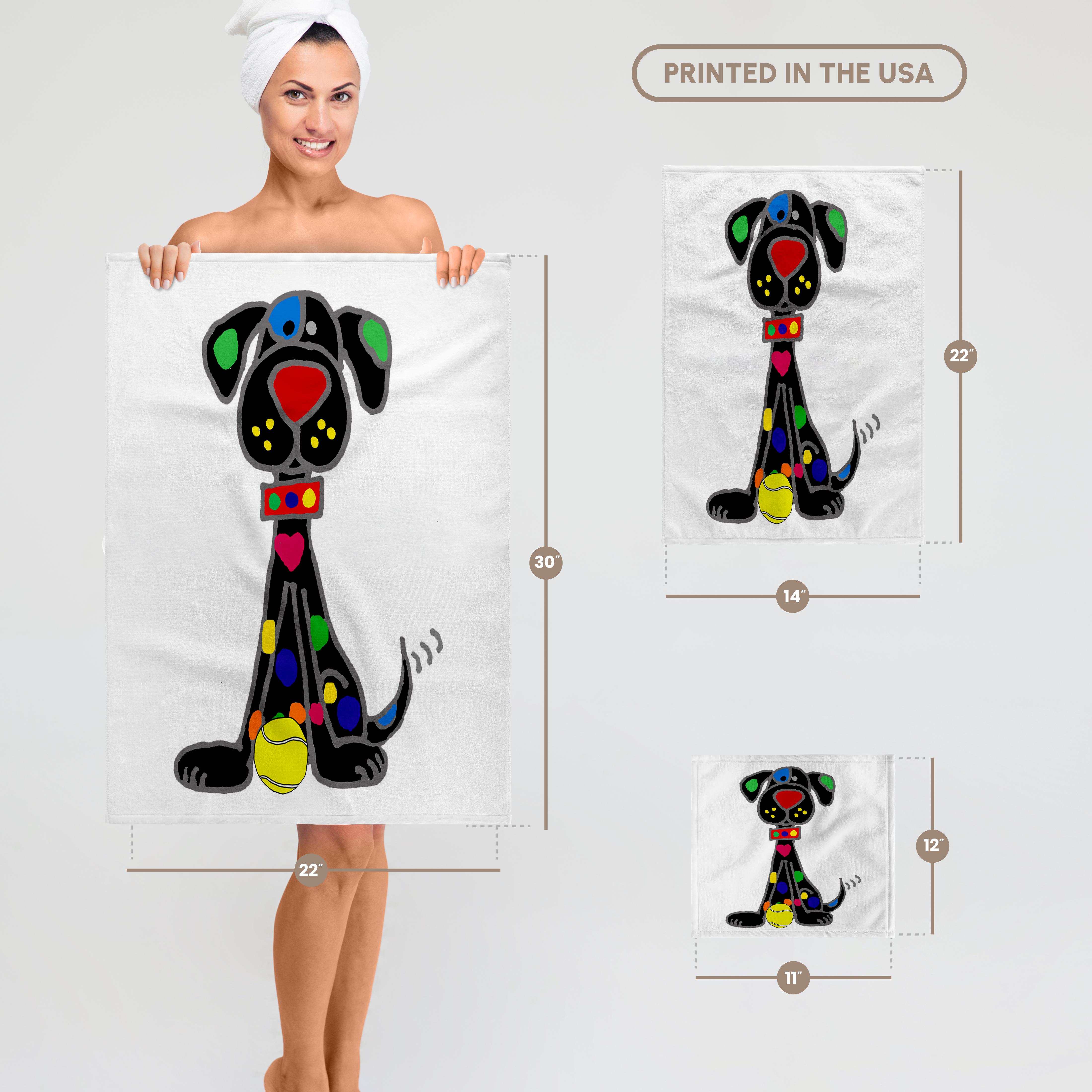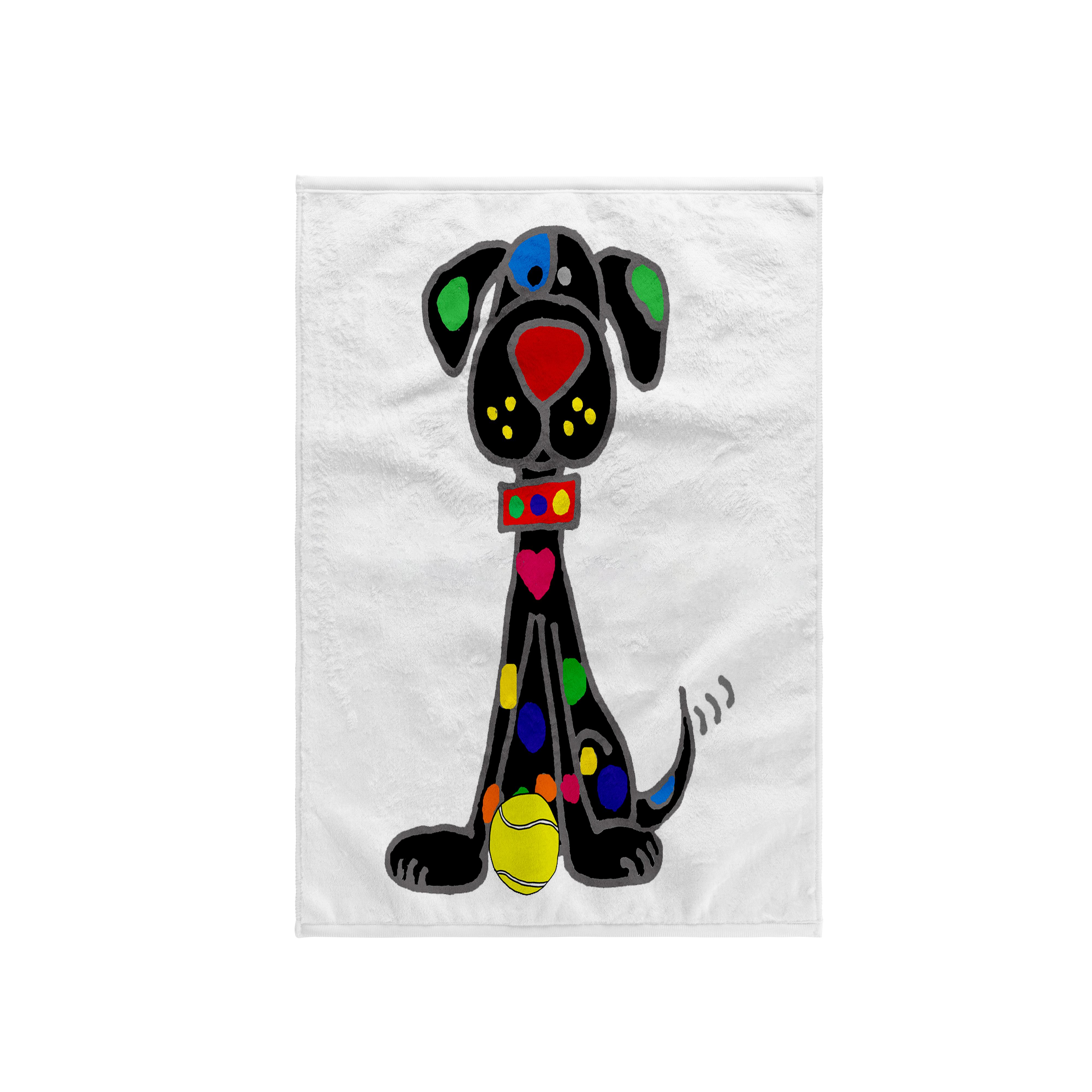 Funny Cute Black Dog with Spots and Tennis Ball for Dog Lovers Towel is great to use in the kitchen, bathroom or gym. This 15 by 22 inch, hand/sports towel allows you to customize your room with a special design or color. Great for drying dishes, hands and faces. Suitable to put in any sports bag. Image will not fade after washing. Machine wash, tumble dry low, do not bleach. Towel will regain its fullness after the first washing. Made of: Printed side 100% polyester and reverse side 100% Terrycloth cotton. Image printed on polyester side/ terry cloth side is blank white.