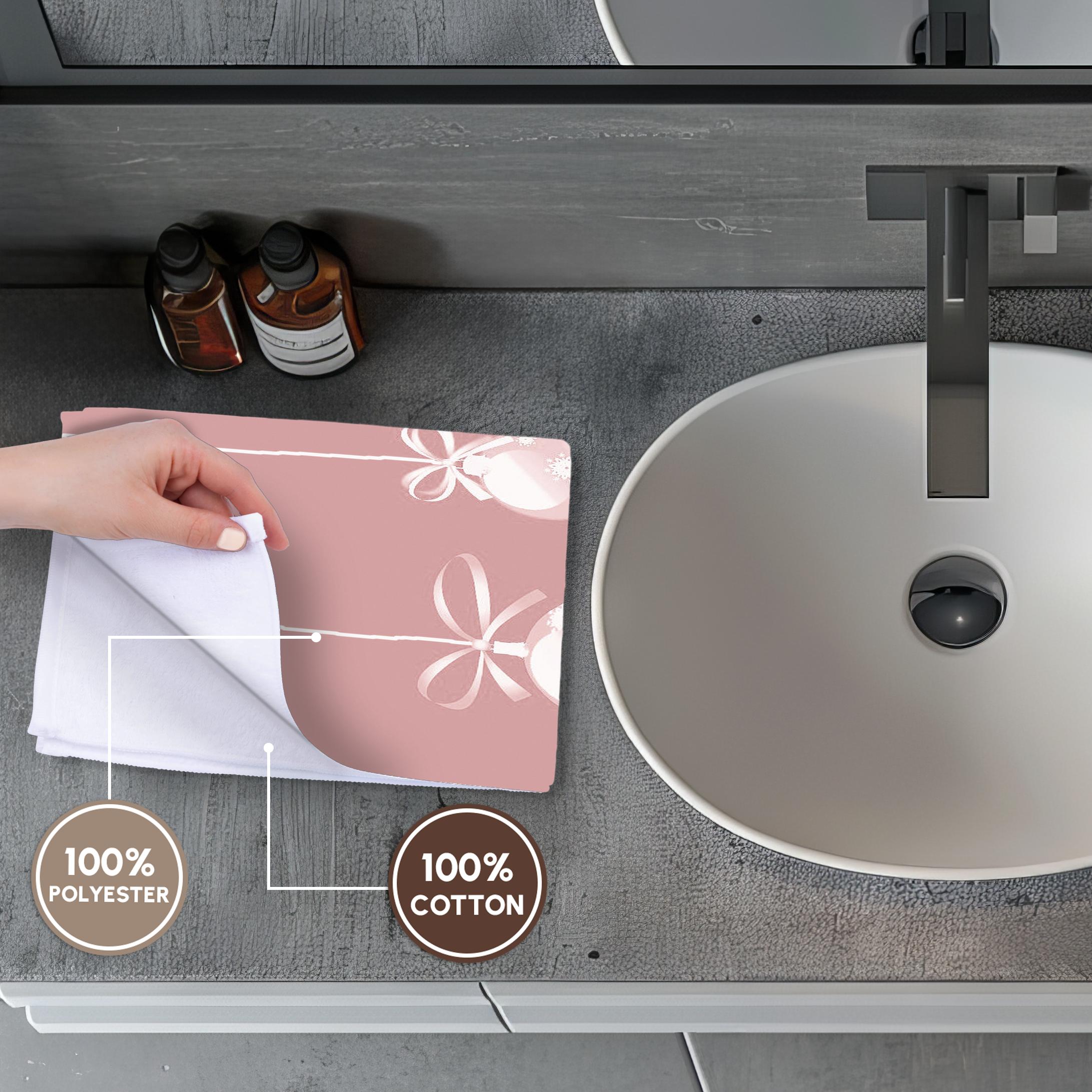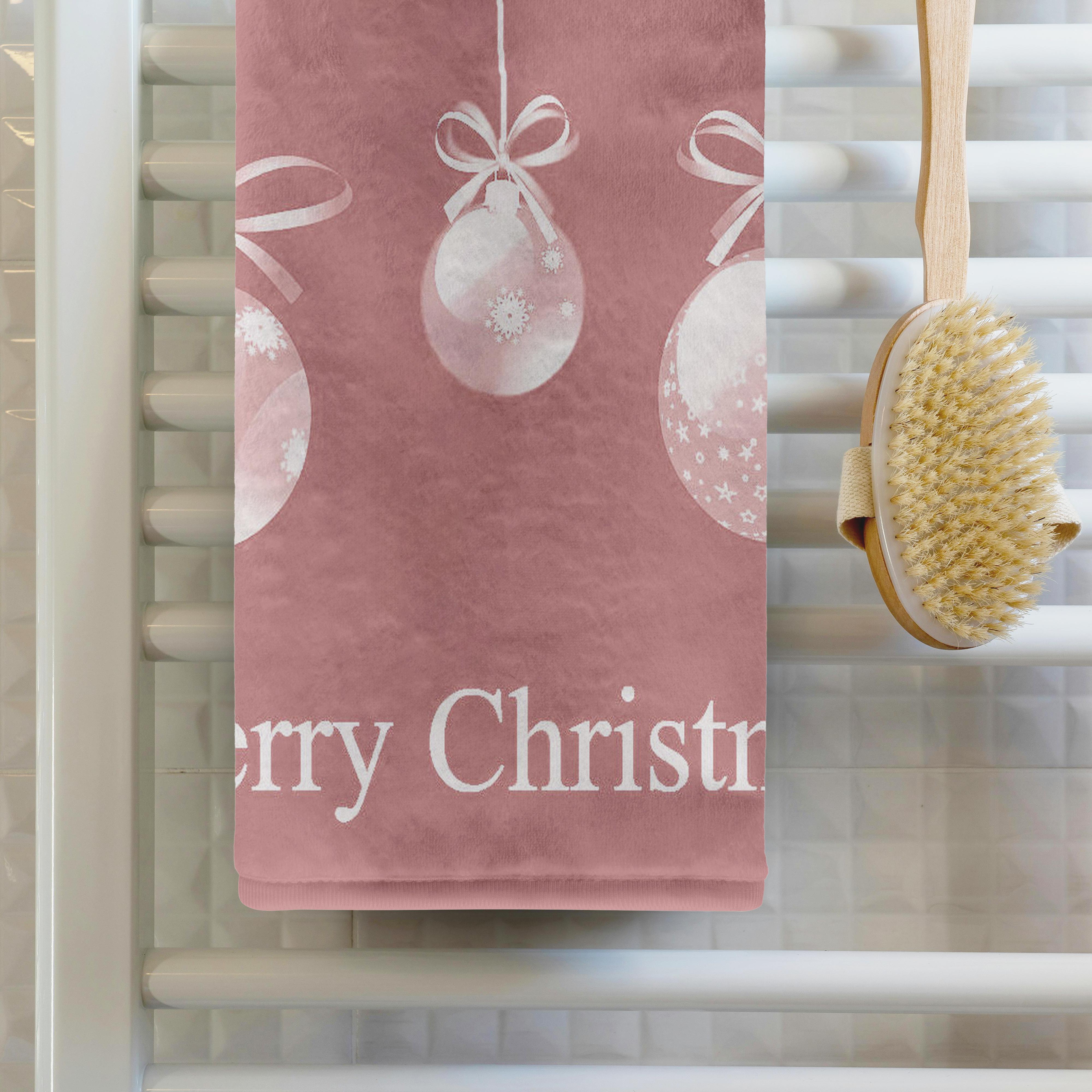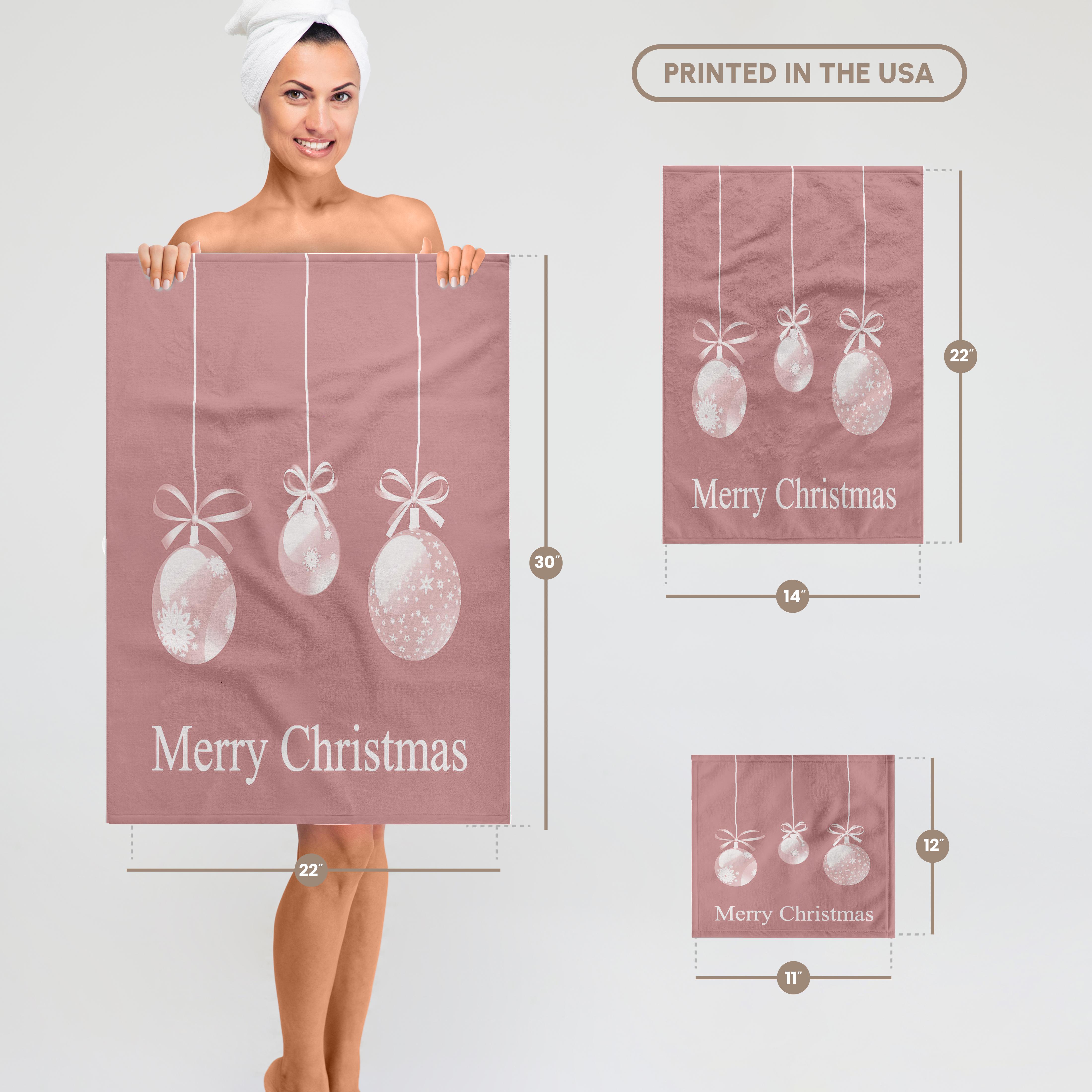 White Ornaments Pink Christmas- Holiday Inspirations Towel is great to use in the kitchen, bathroom or gym. This 15 by 22 inch, hand/sports towel allows you to customize your room with a special design or color. Great for drying dishes, hands and faces. Suitable to put in any sports bag. Image will not fade after washing. Machine wash, tumble dry low, do not bleach. Towel will regain its fullness after the first washing. Made of: Printed side 100% polyester and reverse side 100% Terrycloth cotton. Image printed on polyester side/ terry cloth side is blank white.