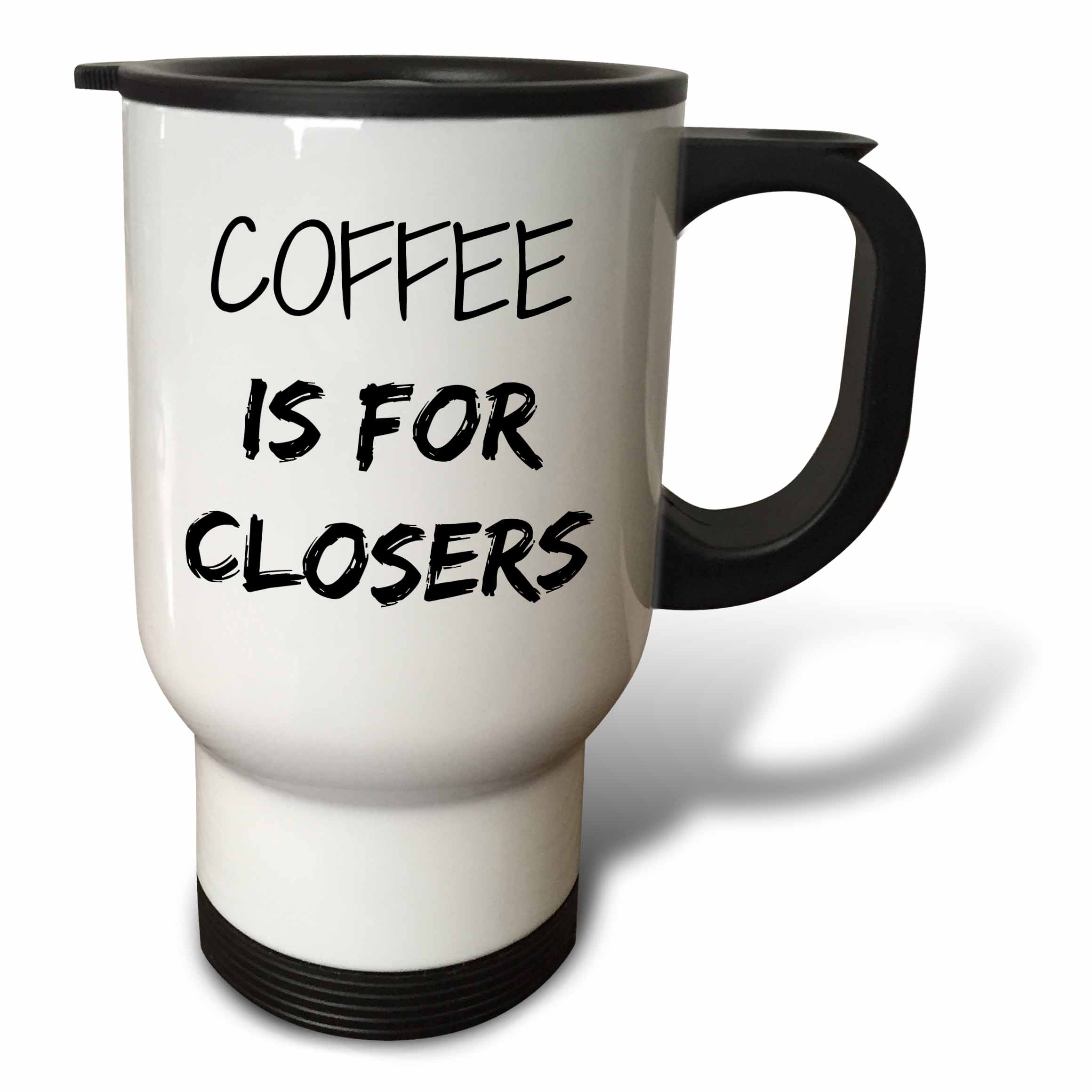 Coffee is for closers Travel Mug is a great way to take your favorite hot or cold drink along. With a tapered bottom this stylish 14oz mug fits in a standard cup holder and features an easy-grip handle with thumb rest, slide opening lid and slanted drinking surface. This travel mug is made of stainless steel. Not microwave safe, hand washing is recommended.