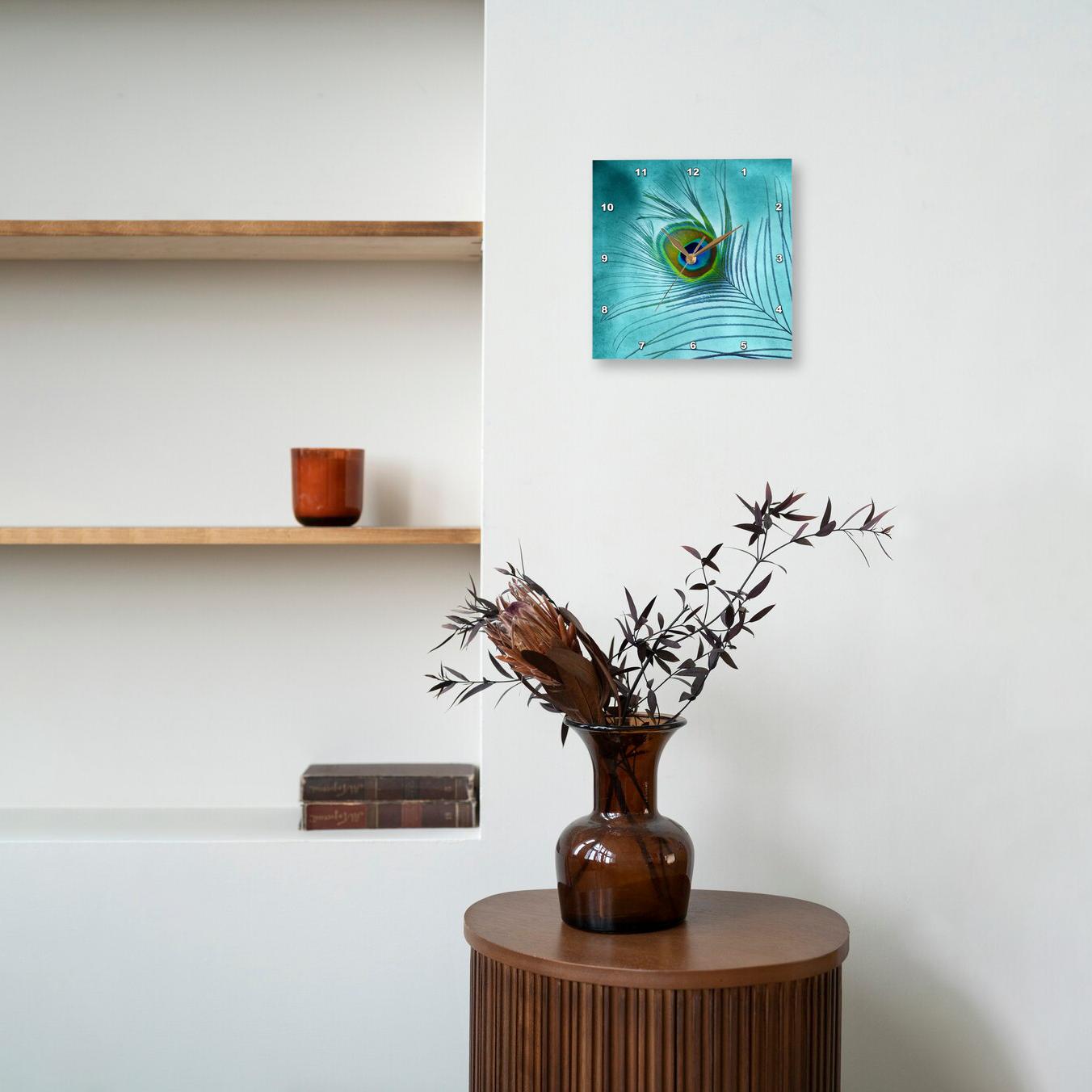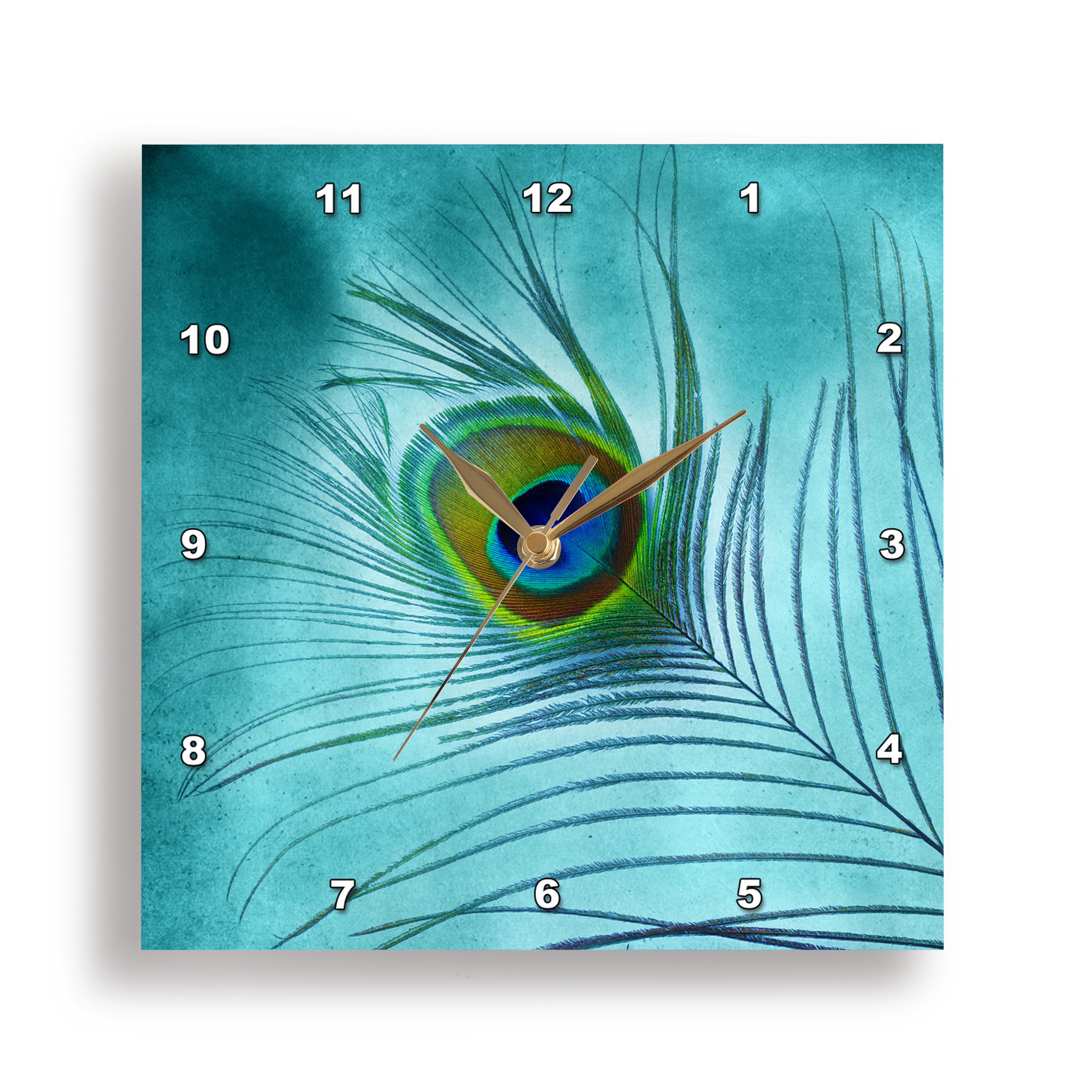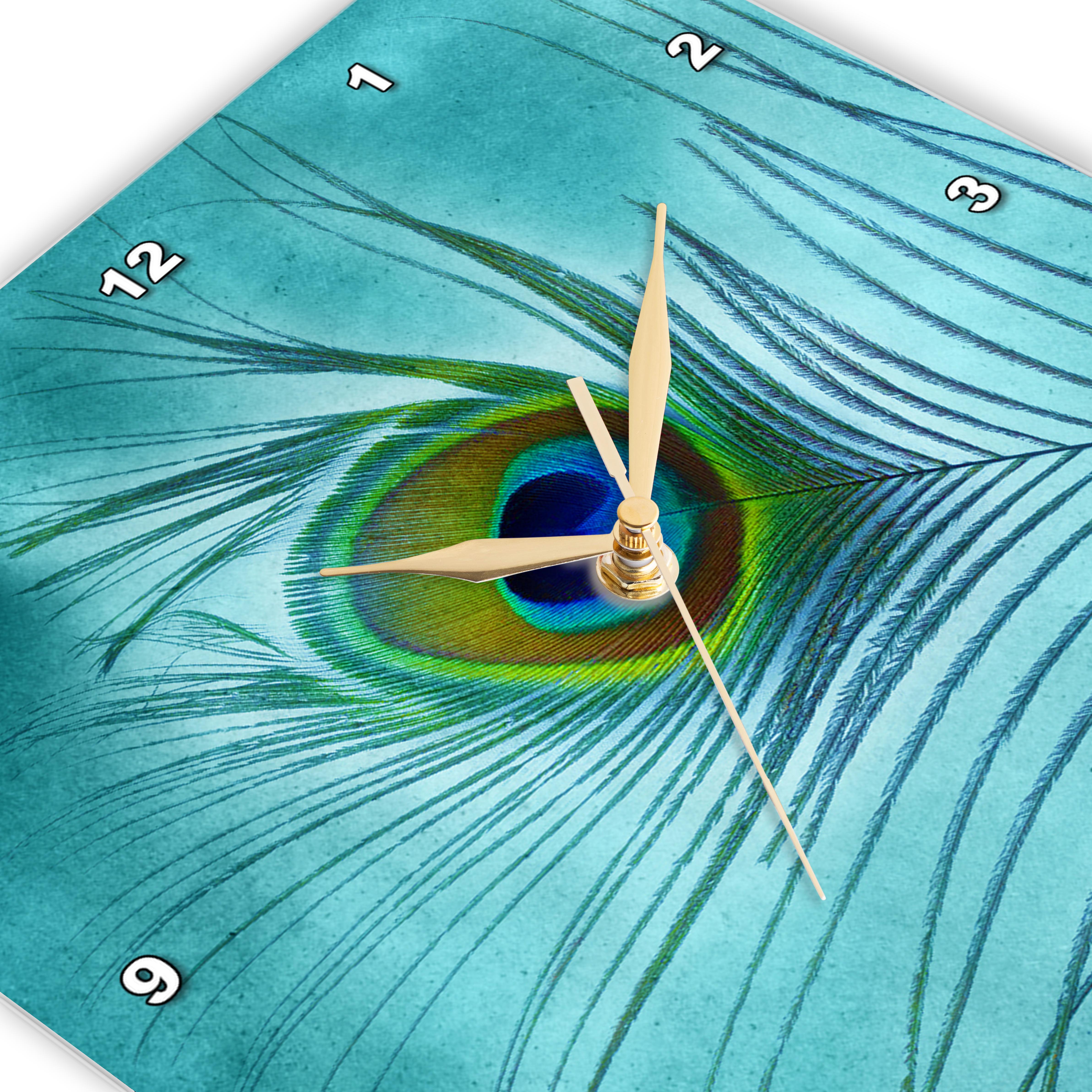 3dRose Doreen Erhardt Birds - Peacock Feather on Turquoise Background - Wall Clocks (DPP_211236)