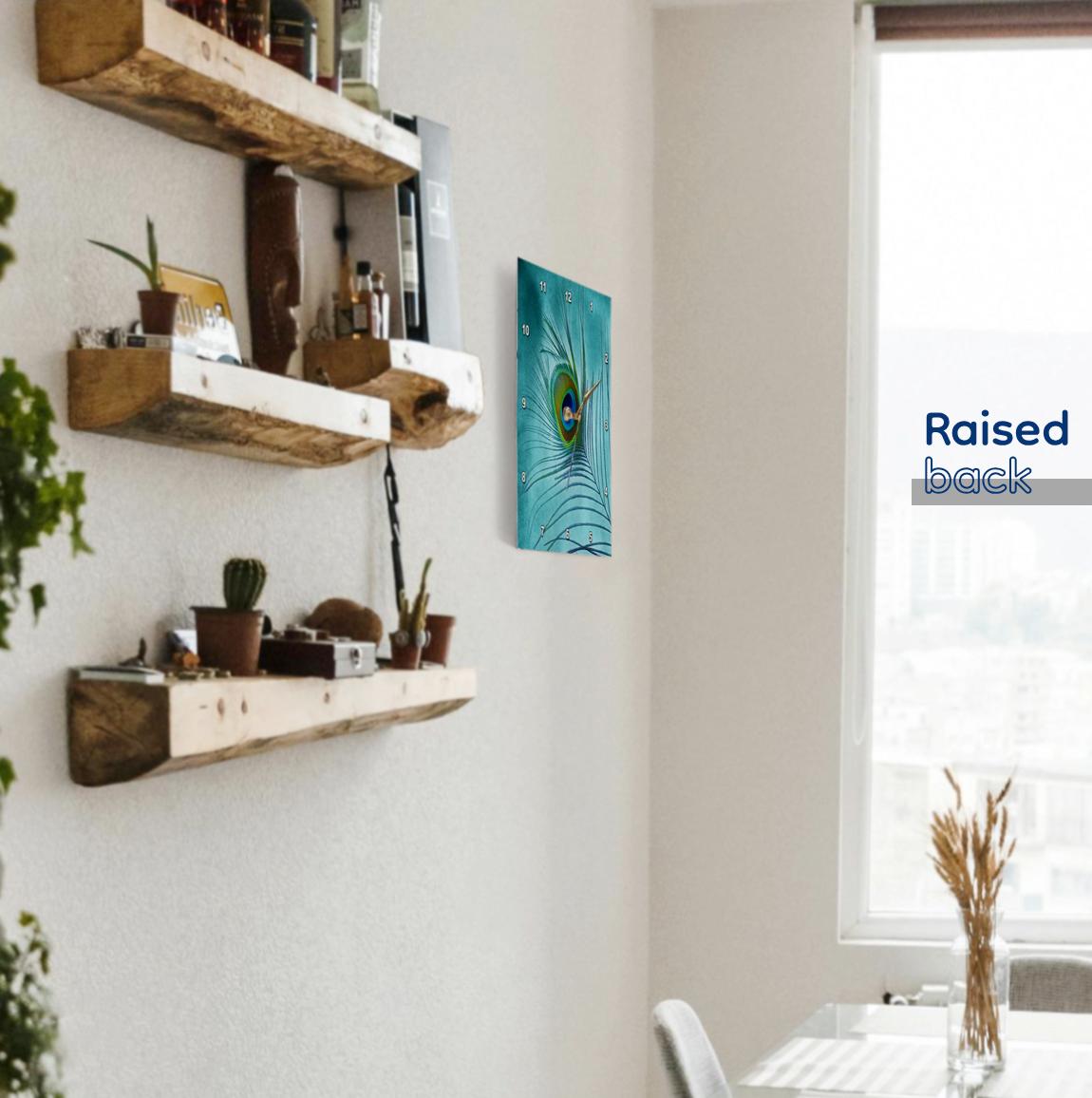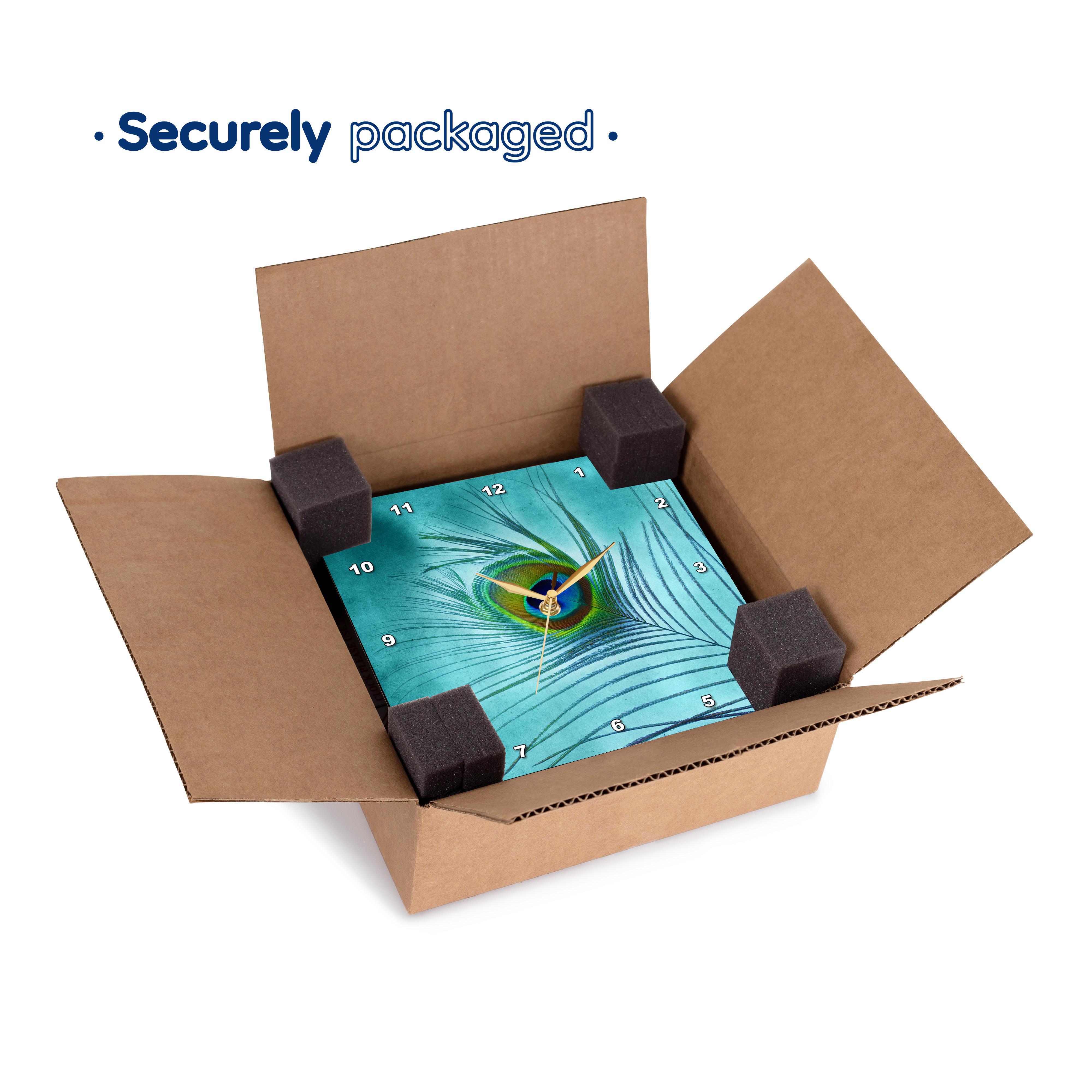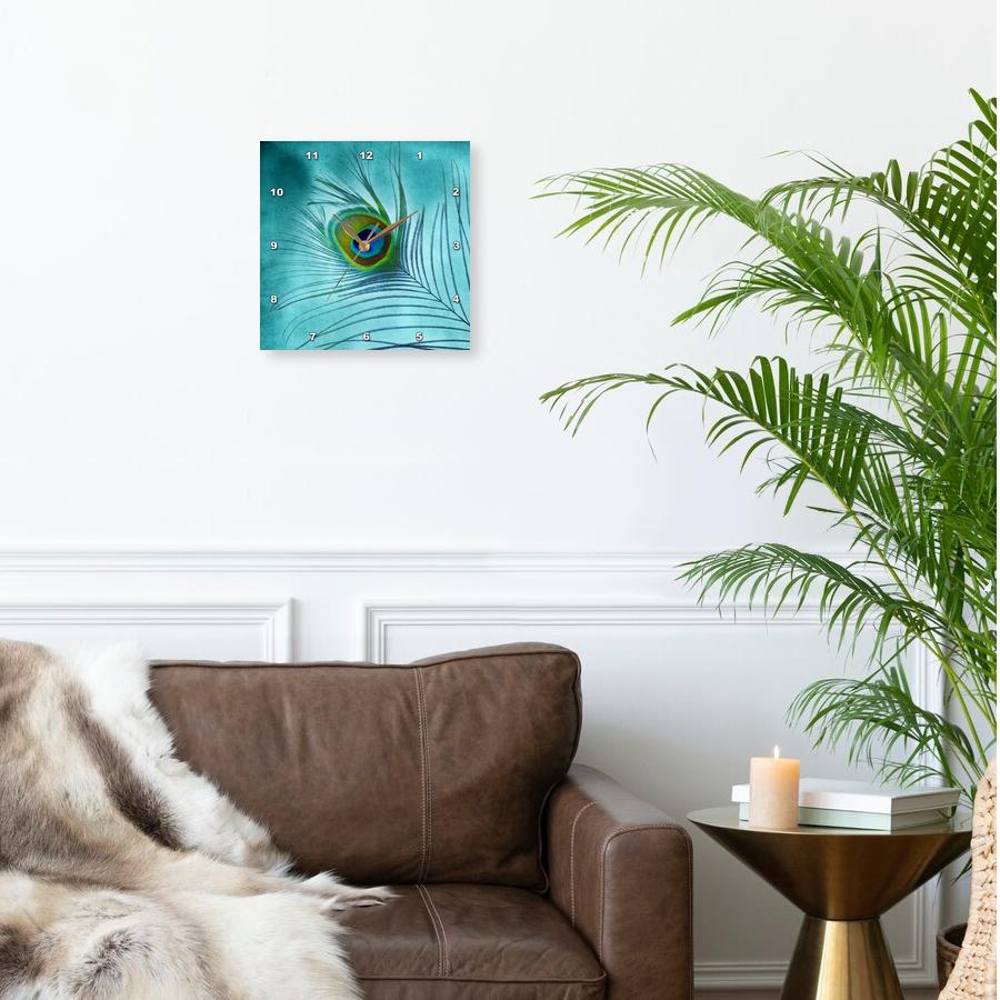 3dRose Doreen Erhardt Birds - Peacock Feather on Turquoise Background - Wall Clocks (DPP_211236)
