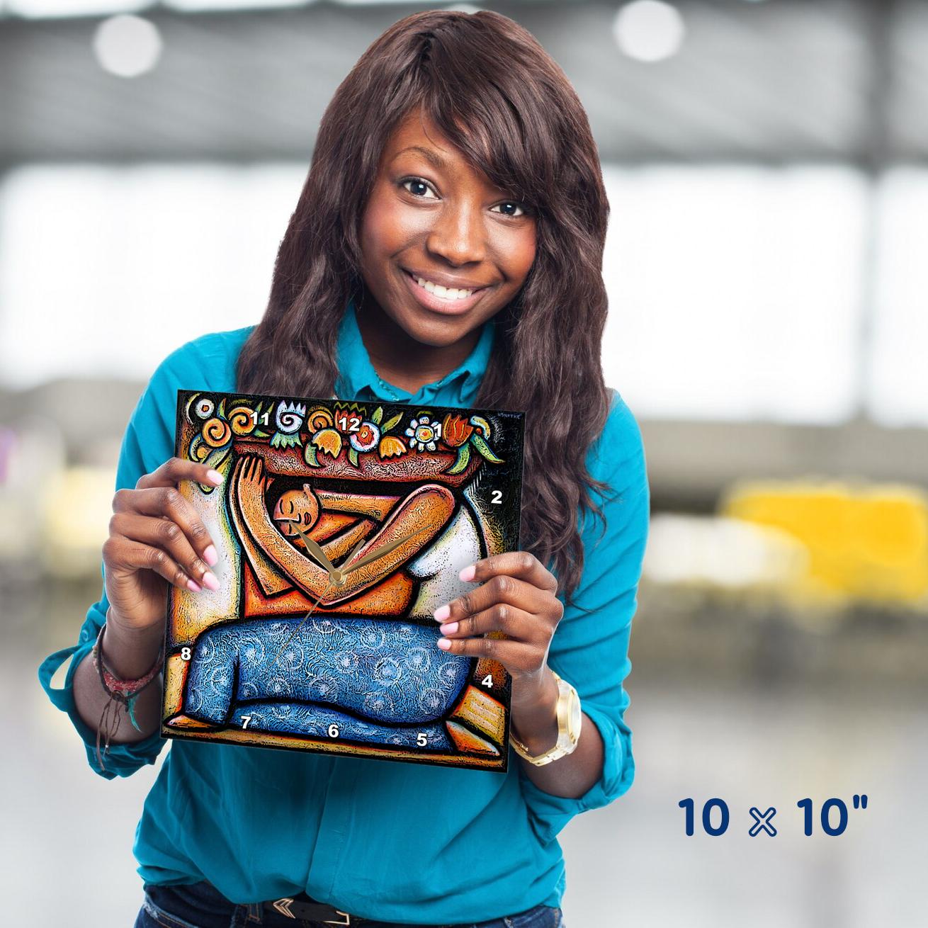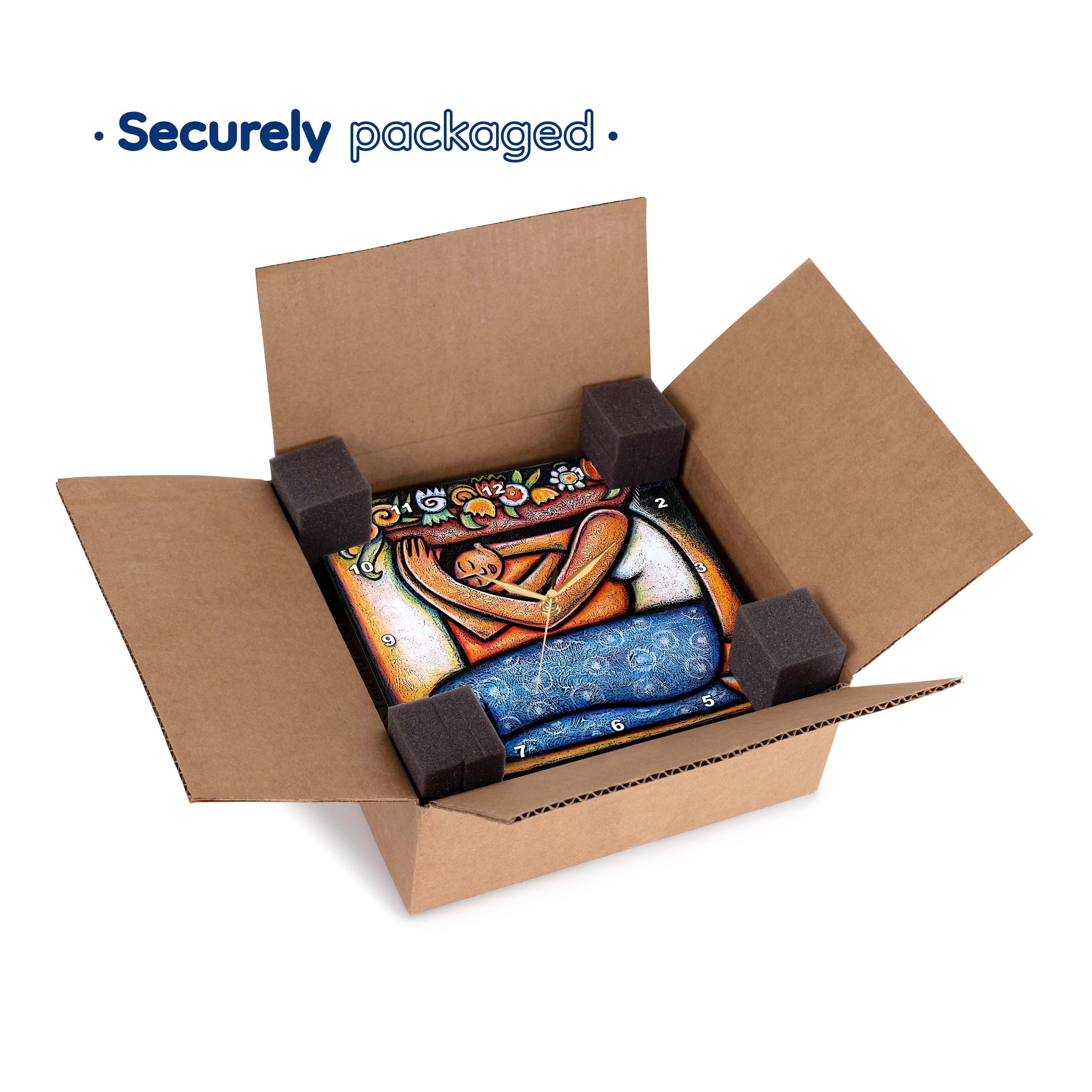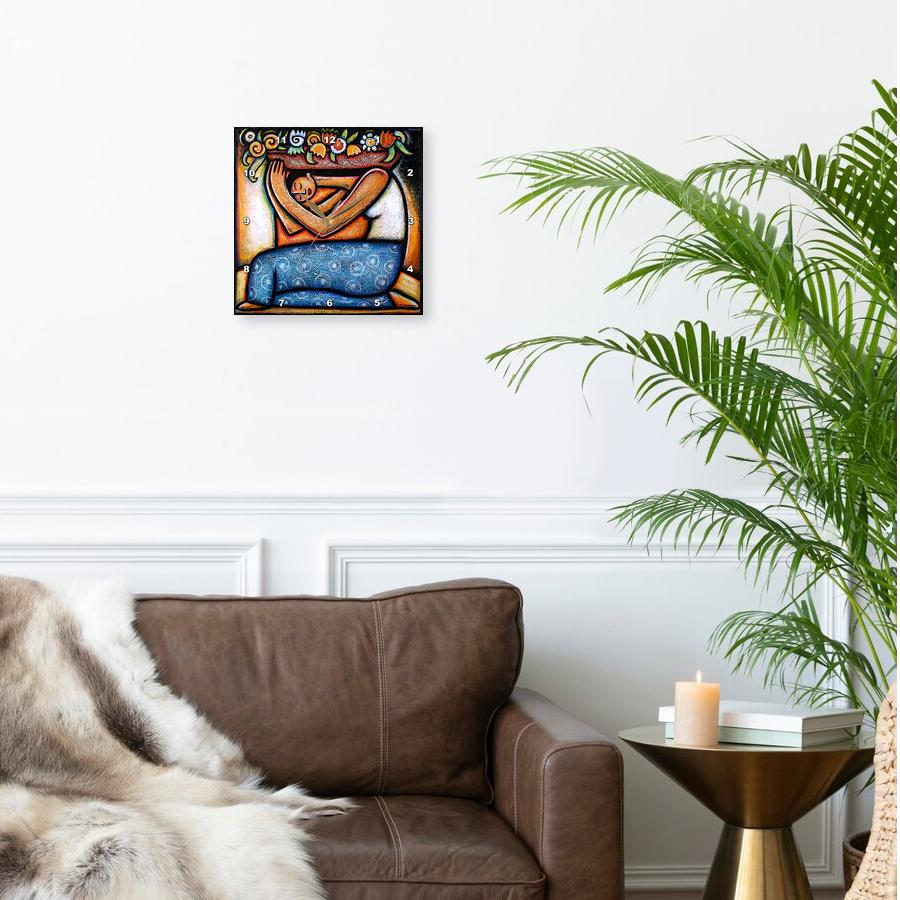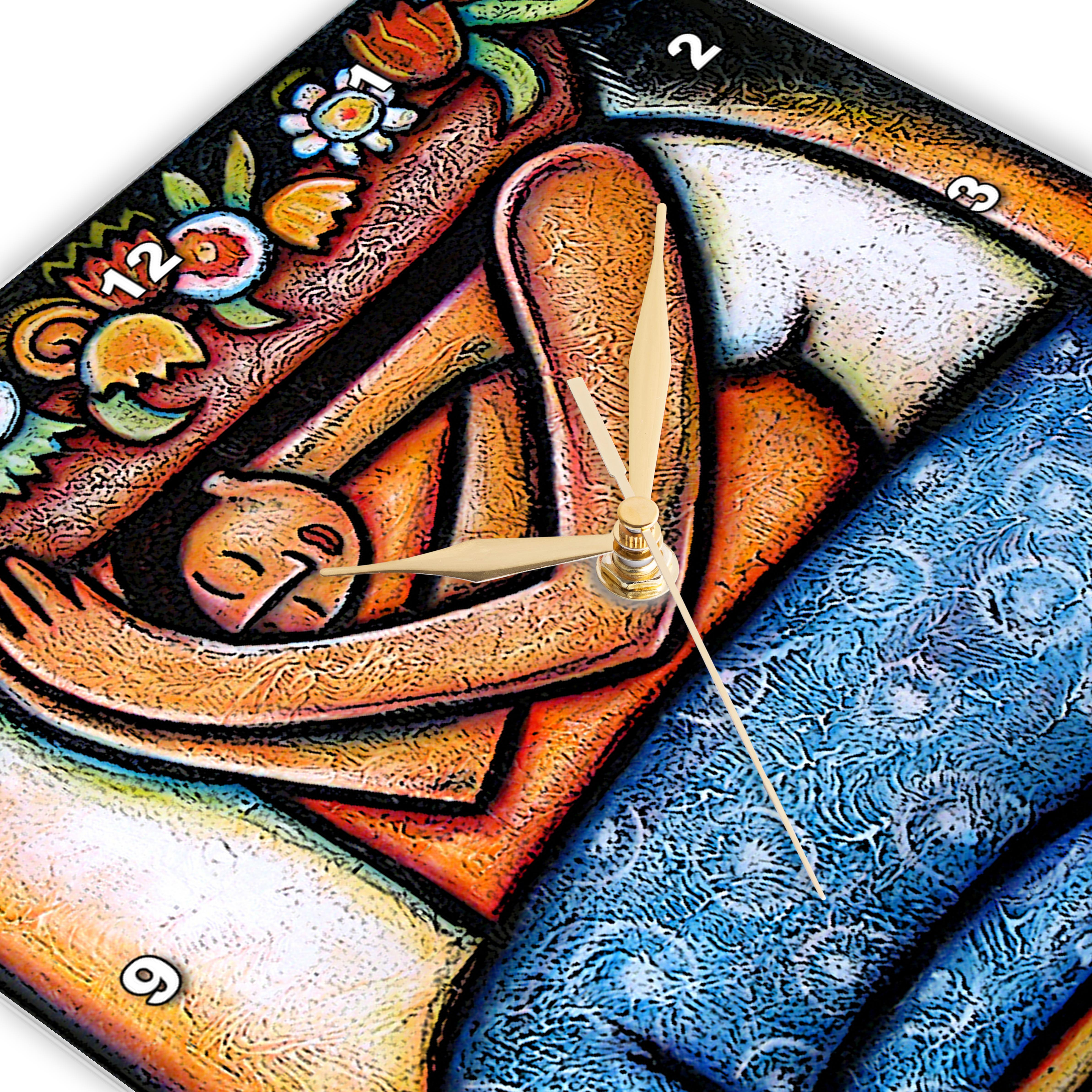 Shape & Style: Square clock with a sleek frameless edge, showcasing vibrant floral artwork inspired by Mexican culture.