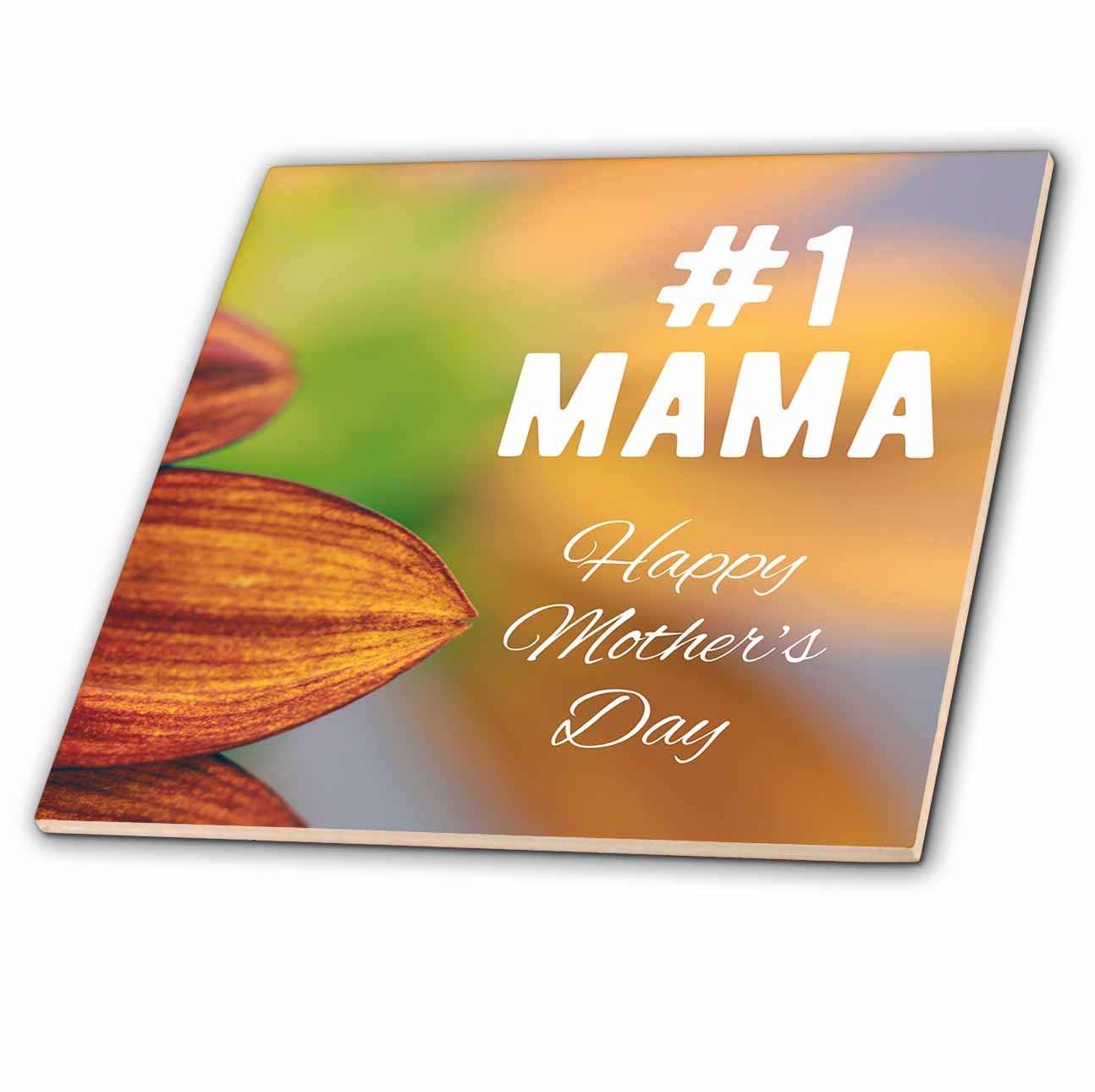 #1 Mama Happy Mothers Day written on a photo of sunflower petals. Tile is great for a backsplash, countertop or as an accent. This commercial quality construction grade tile has a high gloss finish. The image is applied to the top surface and can be cleaned with a mild detergent.