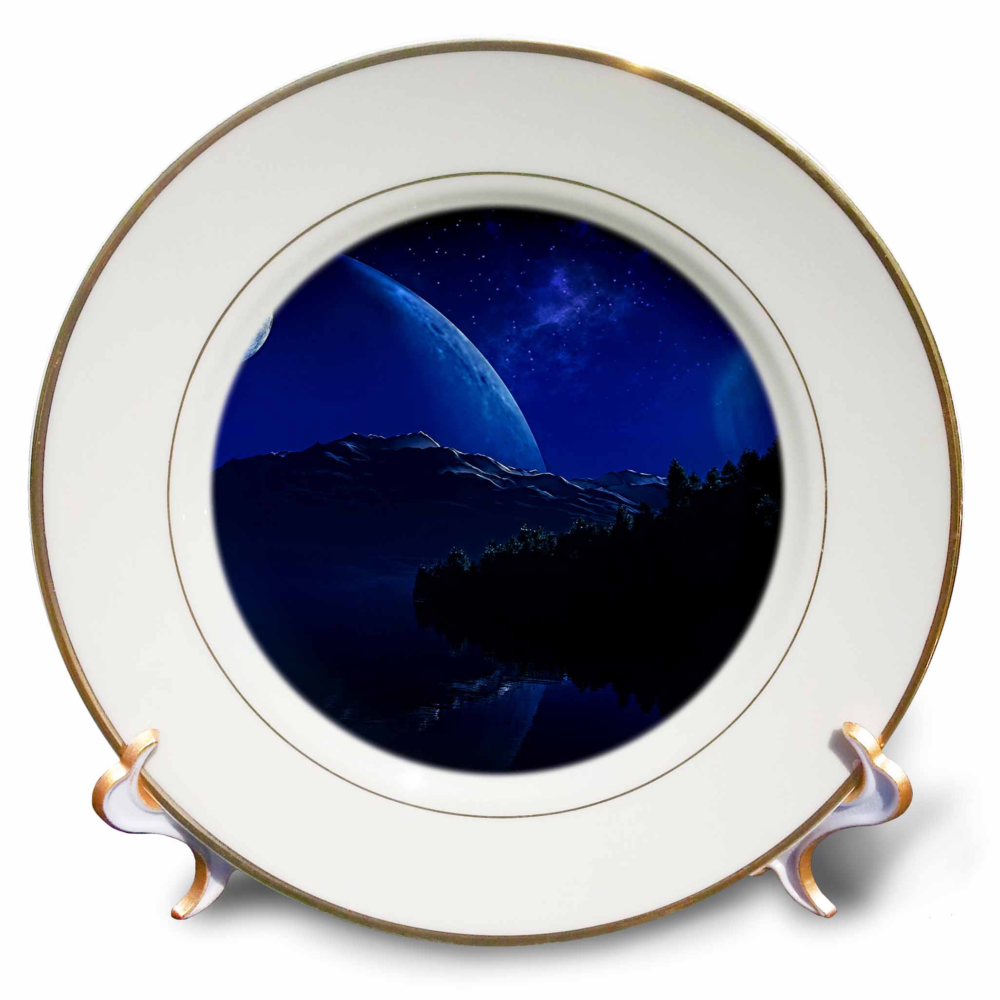 A new earth in the night. Green northern lights shimmer Plate is 7.5" in diameter. Made of white porcelain featuring two 24k gold rims. Excellent to give as a gift commemorating a special person or event. Stand included. Decorative use only.