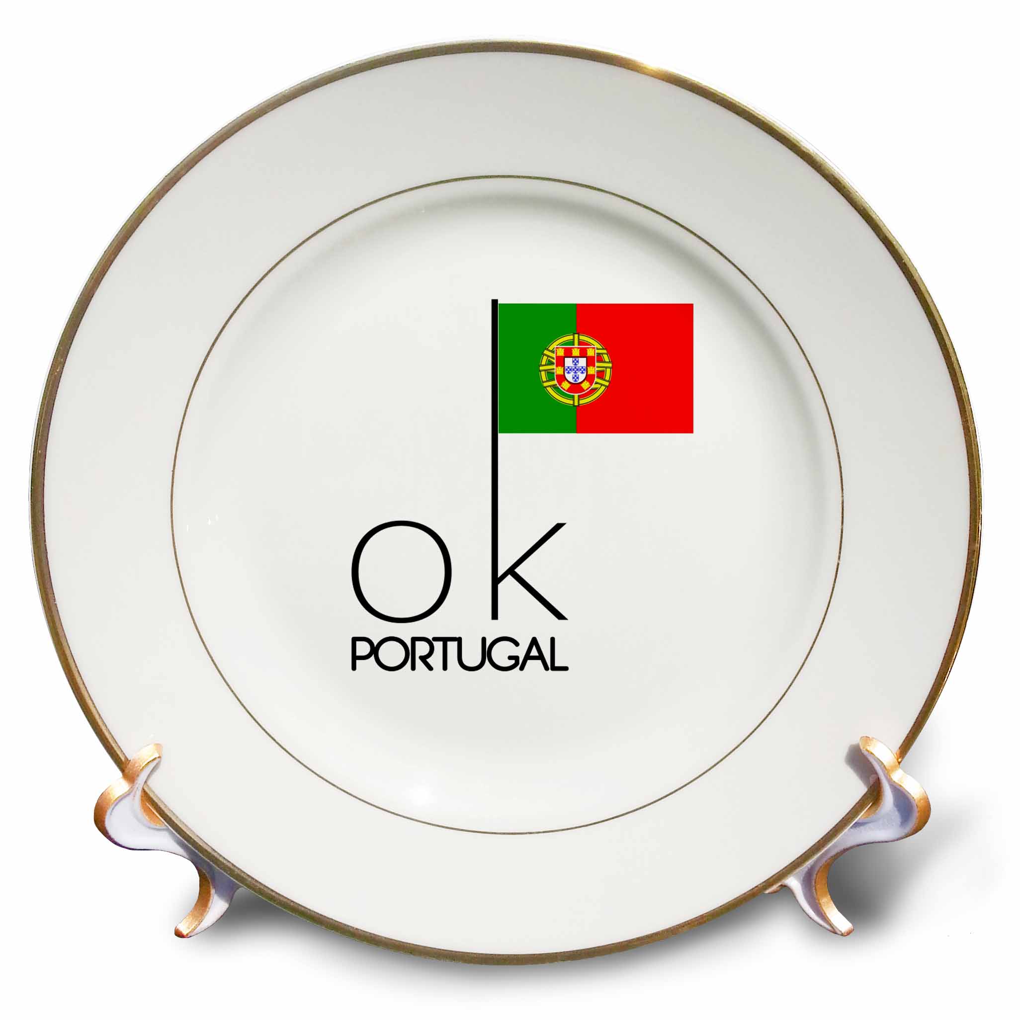 View full detailsStylish text OK PORTUGAL and an image of the Portuguese flag Plate is 7.5" in diameter. Made of white porcelain featuring two 24k gold rims. Excellent to give as a gift commemorating a special person or event. Stand included. Decorative use only.