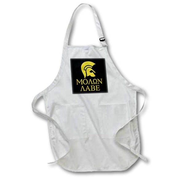 3dRose Ancient Greek helmet. Molon Labe - Come and take text. Yellow, black - Aprons (apr_326156)