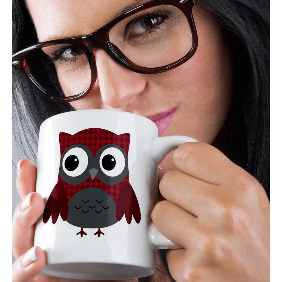 3dRose Anne Marie Baugh Owls - Cute Ruby Red Houndstooth Patterned Owl - Mugs (mug_61031)