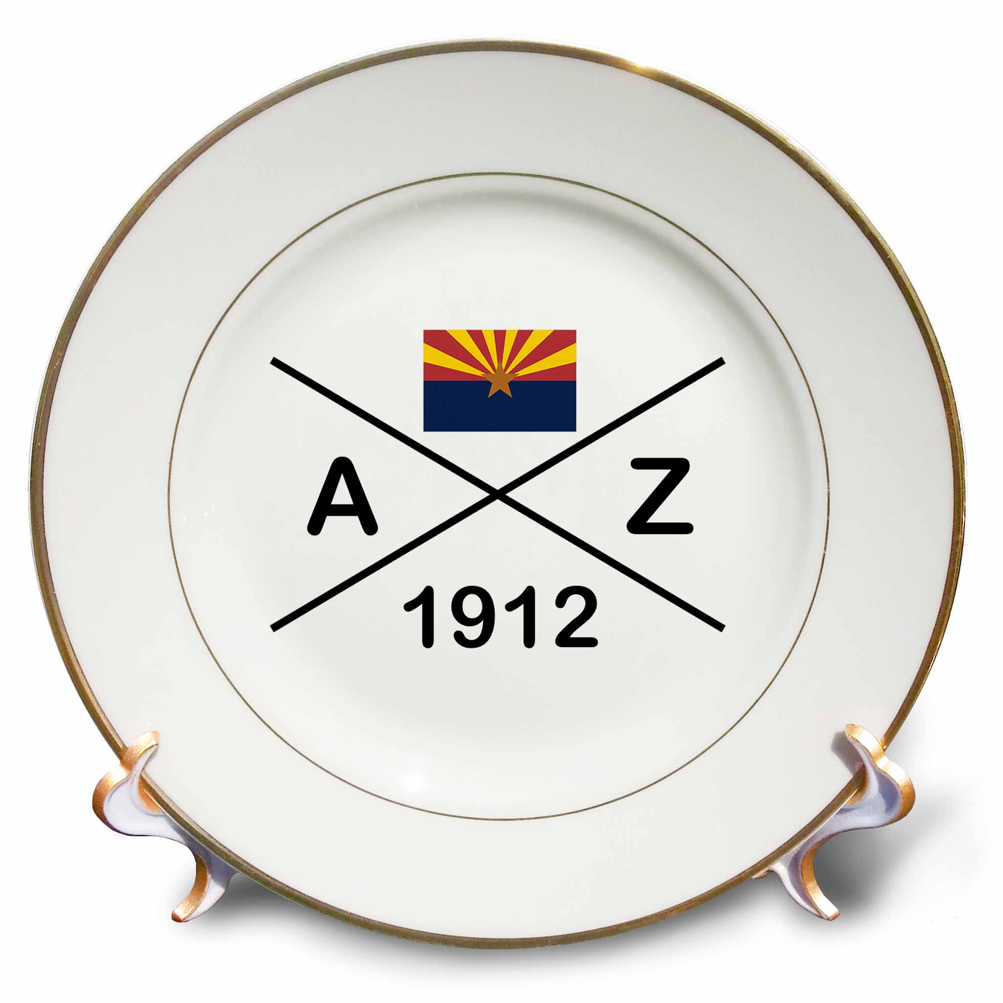 Arizona state abbreviation, statehood, flag art on white background. Plate is 7.5" in diameter. Made of white porcelain featuring two 24k gold rims. Excellent to give as a gift commemorating a special person or event. Stand included. Decorative use only.