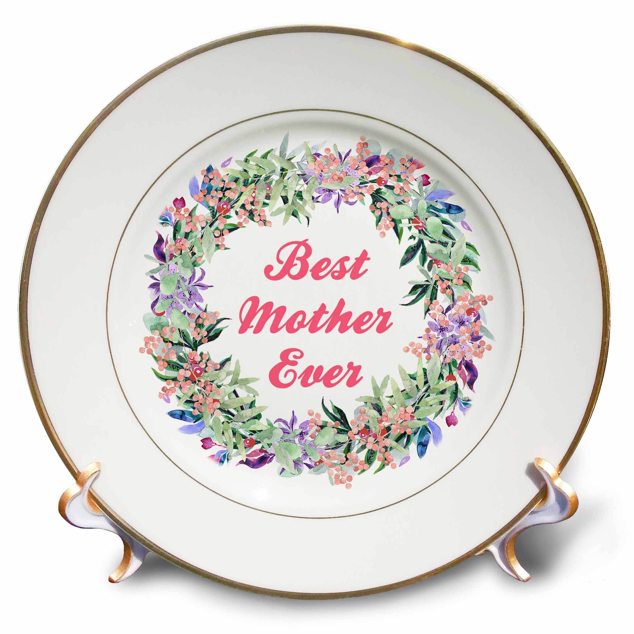 Best Mother Ever in pink inside a floral wreath of berries and flowers Plate is 7.5" in diameter. Made of white porcelain featuring two 24k gold rims. Excellent to give as a gift commemorating a special person or event. Stand included. Decorative use only.