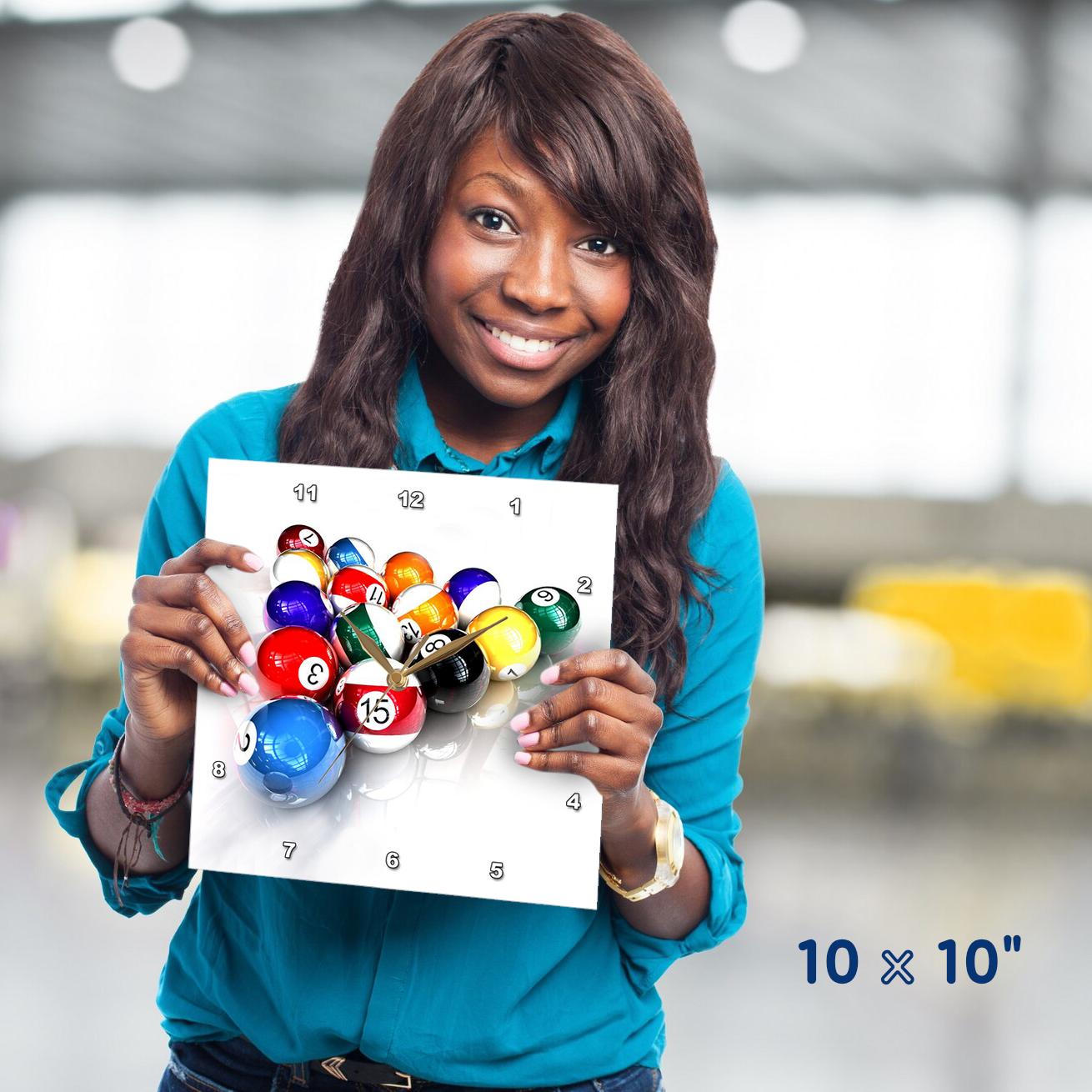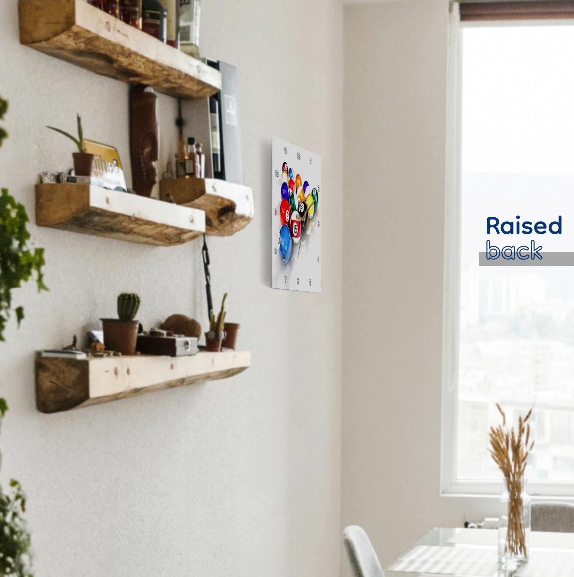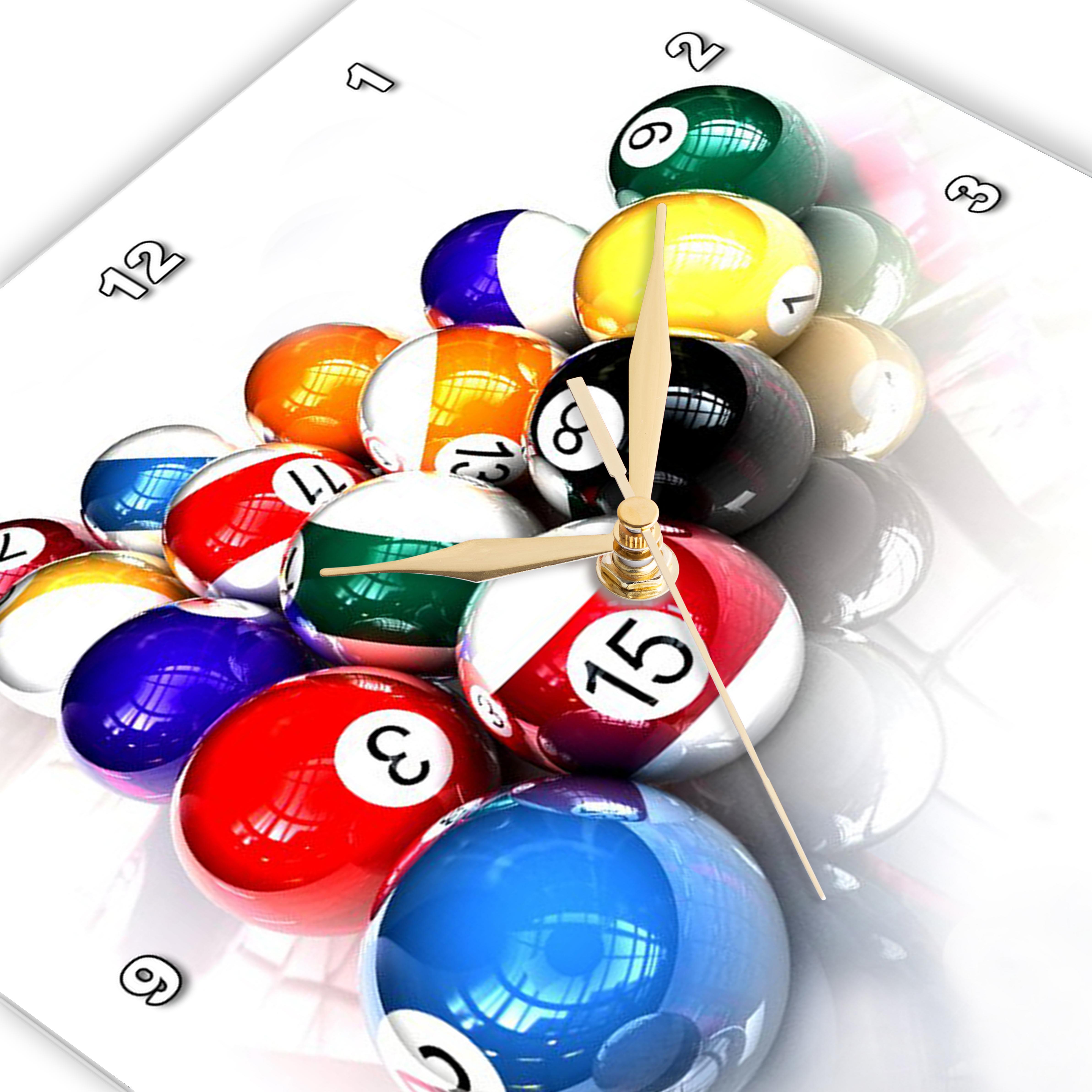 Billiards Balls Pool Wall Clock is a wonderful complement to any room in your home or office. Made of durable high grade aluminum. This frame-less clock has a high gloss mirror like, UV coated, scratch resistant finish and is suitable for a moist environment. Sizes available range from 10" x 10" to 15" x 15". Requires one AA battery; not included. Battery box is not covered. Made in USA.